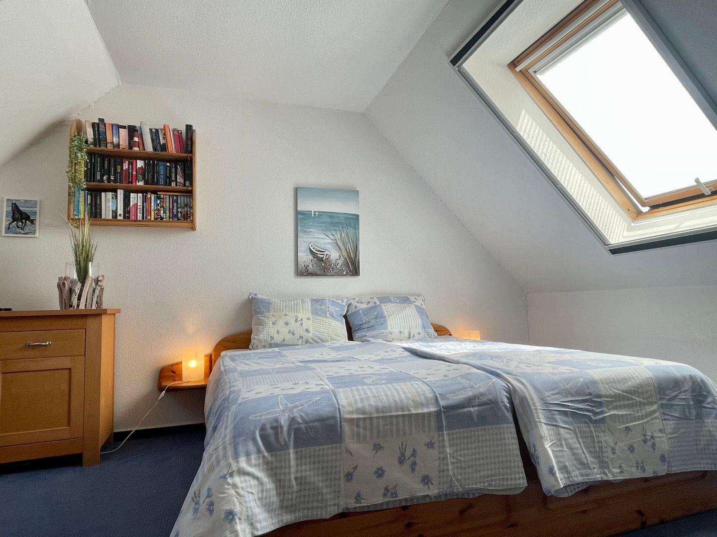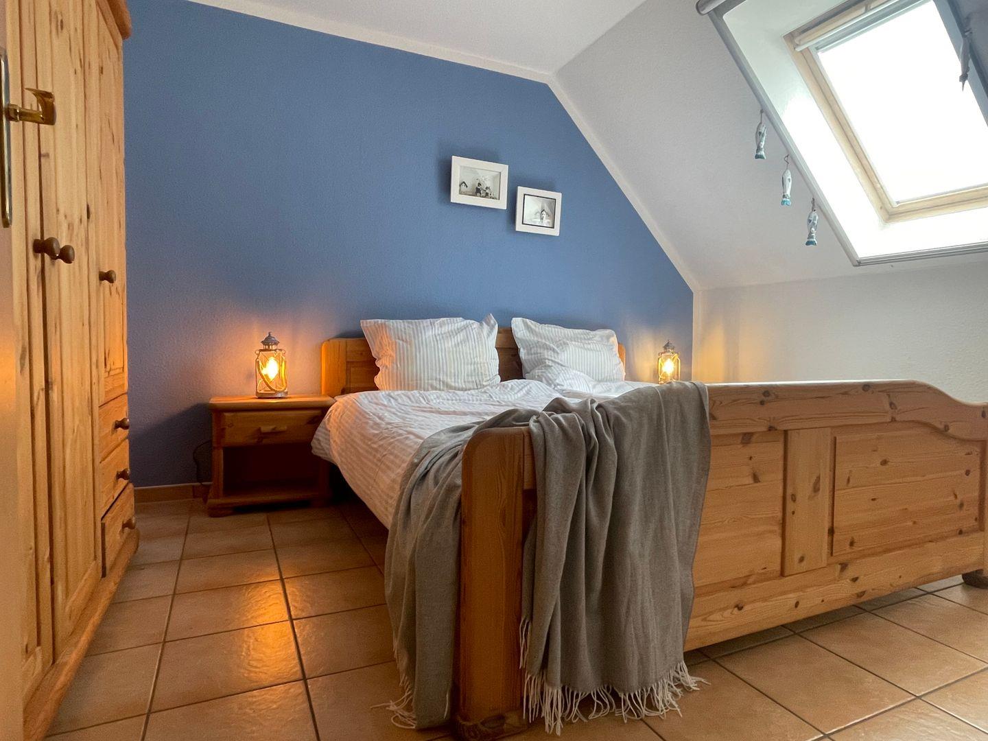 Vom Wohnzimmer aus gelangen Sie über eine Treppe in das obere Schlafzimmer. Dort befinden sich neben jeder Menge Spielsachen und Kinderbüchern für unsere kleinen Gäste auch Gesellschaftsspiele und Bücher für die großen Gäste, ebenso wie ein weiterer Fernseher. So kommt egal bei welchem Ostseewetter keine Langeweile auf.