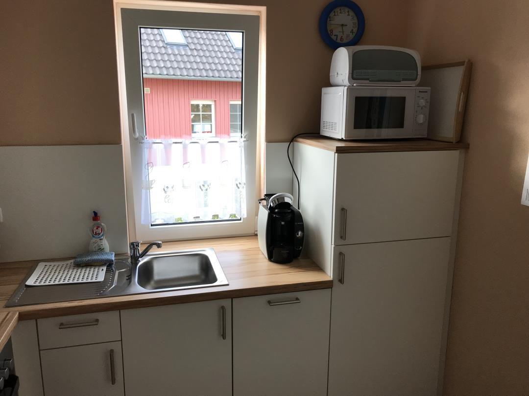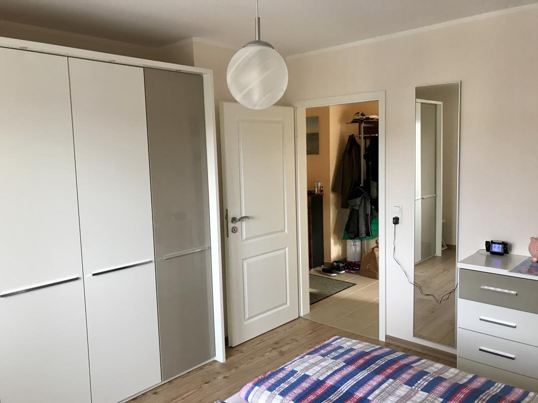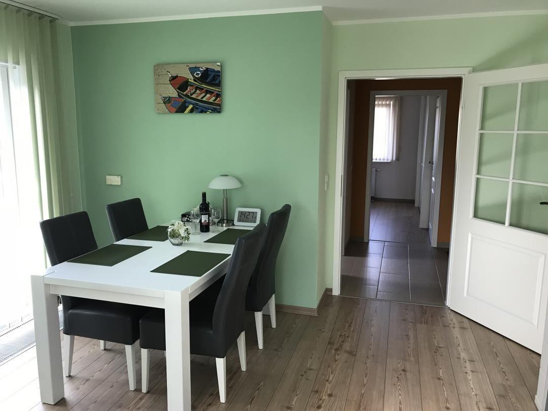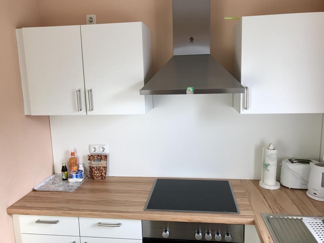 Die vom Flur abgehende Einbauküche ist mit Geschirrspüler, Kühlschrank inkl. Gefrierfach, Backofen, Mikrowelle, Kaffeemaschine, Wasserkocher und Toaster ausgestattet und bietet alles für die Selbstverpflegung. Das vom Flur abgehende moderne Schlafzimmer besteht aus einem komfortablen Doppelbett (2 Matratzen von je 1,00 x 0,90), zwei Nachtschränken, einem großen Kleiderschrank und einer Kommode mit Schubladen. Einen zusätzlichen Schlafplatz ermöglicht das Sofa im Wohnzimmer inkl. Bettfunktion. Das vom Flur abgehende Bad verfügt über Dusche, Waschbecken, WC und Handtuchtrockner. Im Flur finden Sie eine Garderobe mit Spiegel und einen Schuhschrank vor. Die komplette Ferienwohnung ist mit Fliesen bzw. Laminatfußboden ausgestattet. Kostenloses WLAN ist vorhanden. Auf Wunsch stehen Kinderreisebett und Kinderhochstuhl für Ihr Kleinkind kostenlos bereit.
