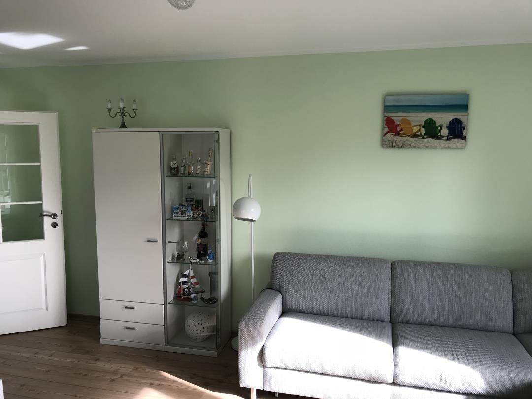 Die im 1. OG befindliche Wohnung bietet Platz für max. 3 Personen. Sie ist sehr geschmackvoll und komfortabel eingerichtet. Hier werden Sie einen erholsamen Urlaub an der Ostsee verbringen können. Das helle Wohnzimmer verfügt über einen Essplatz mit Tisch mit 4 Stühlen und einem Sitzbereich zum Entspannen mit Flachbild-TV, DVD-Player, Spielen und Büchern zur Unterhaltung. Der vom Wohnzimmer begehbare Balkon ist mit einem Esstisch und 3 Stühlen ausgestattet. Hier können Sie die Abendsonne genießen.