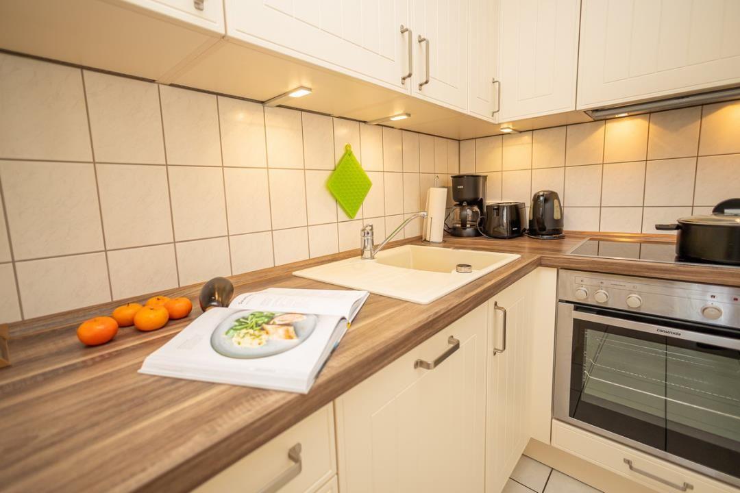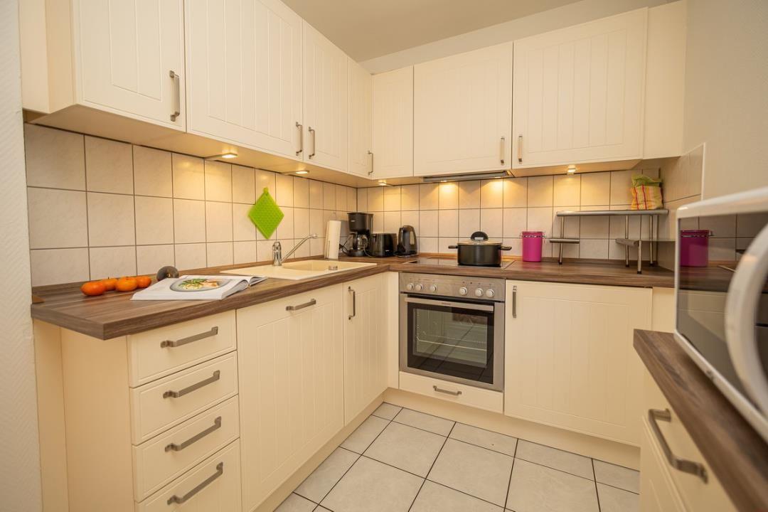 WC. Die Küche ist komplett ausgestattet inkl. Mikrowelle und Geschirrspüler.