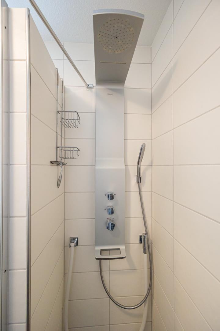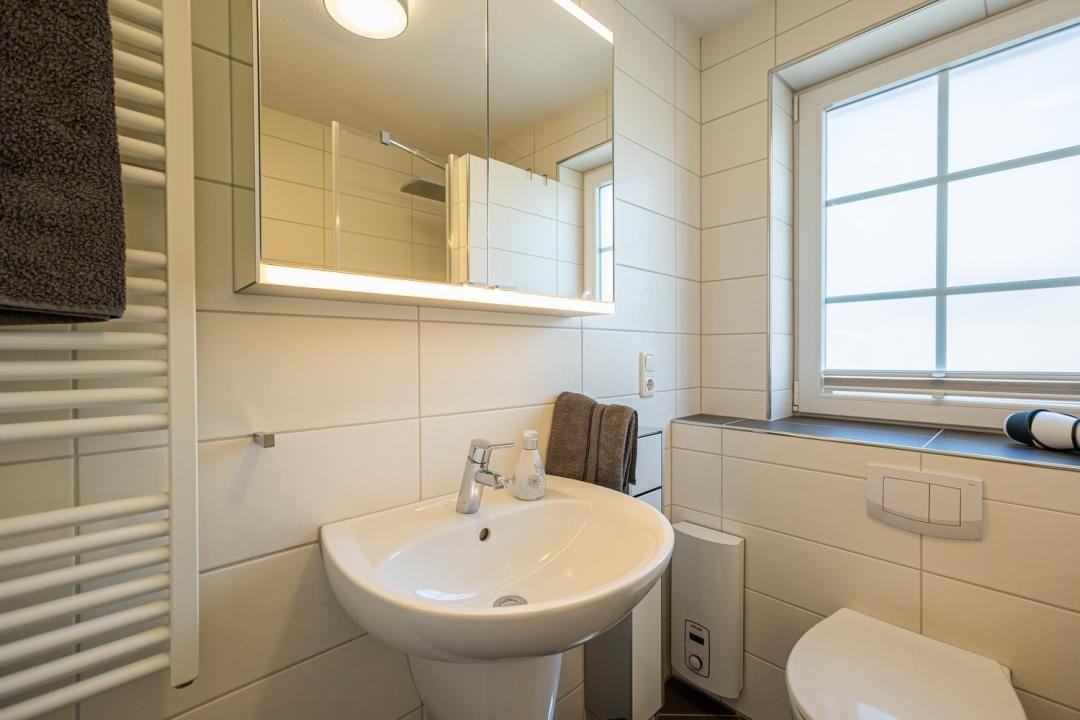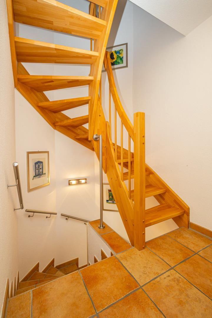 Das 1. Obergeschoss verfügt über 1 Schlafzimmer mit TV, Sauna und 2 Bäder. Dem Schlafzimmer mit Doppelbett angeschlossen ist ein Bad mit Dusche. Ein weiteres Schlafzimmer im Dachgeschoss ist mit 2 Einzelbetten ausgestattet. Die Bettdecken und Kissen in den Schlafzimmern sind für Allergiker geeignet. Das Ferienhaus ist gefliest. Erdgeschoss und Bäder sind mit Fußbodenheizung versehen. Das Haus verfügt im Erdgeschoss über Rolläden zum Verdunkeln und Insektenschutz. Im 1. und 2. OG befinden sich Plissees vor den Fenstern. Die Bäder im 1. OG. haben eine ebenerdige Dusche und einen Handtuchtrockner. Zum Ferienhaus gehört eine Terrasse in Süd-Lage mit bequemen Gartenmöbeln, Sonnenschirm und einem Weber-Elektrogrill. Am Haus können 2 PKW hintereinander geparkt werden. Ein abschließbarer Schuppen zum Unterstellen von Fahrrädern ist vorhanden.