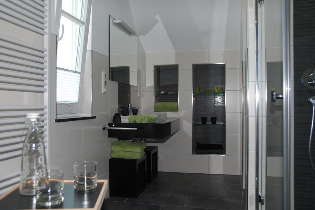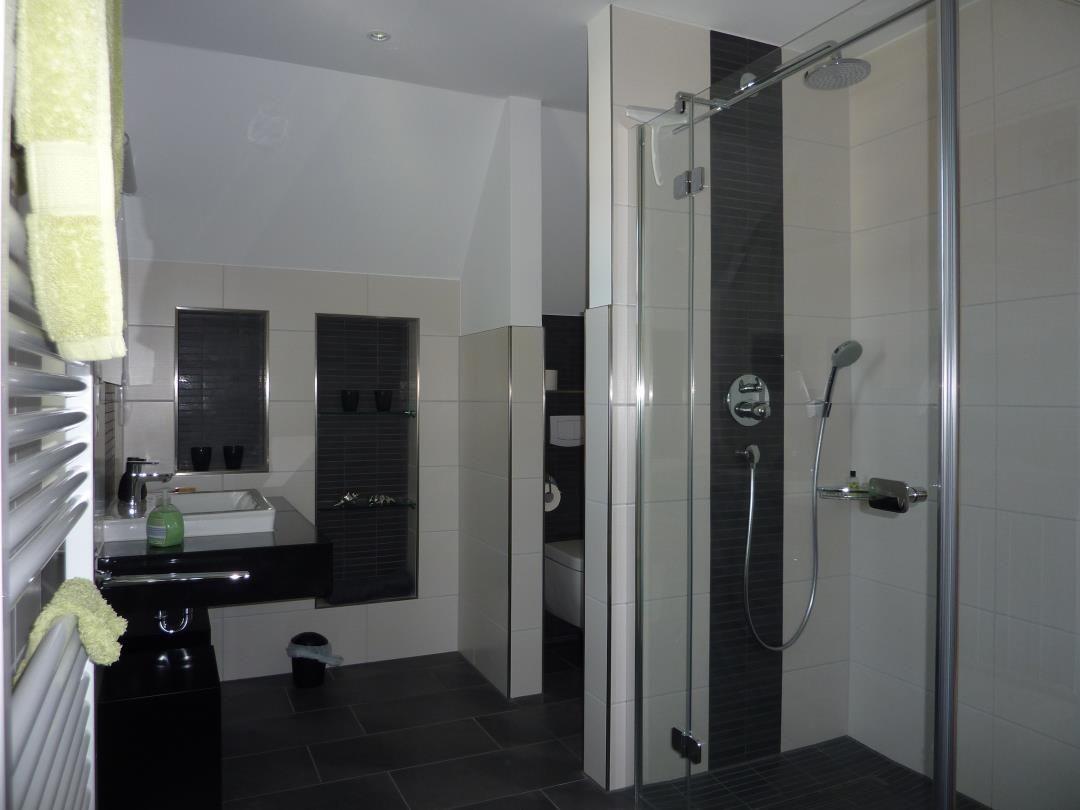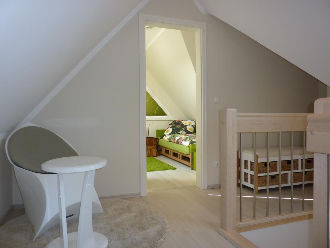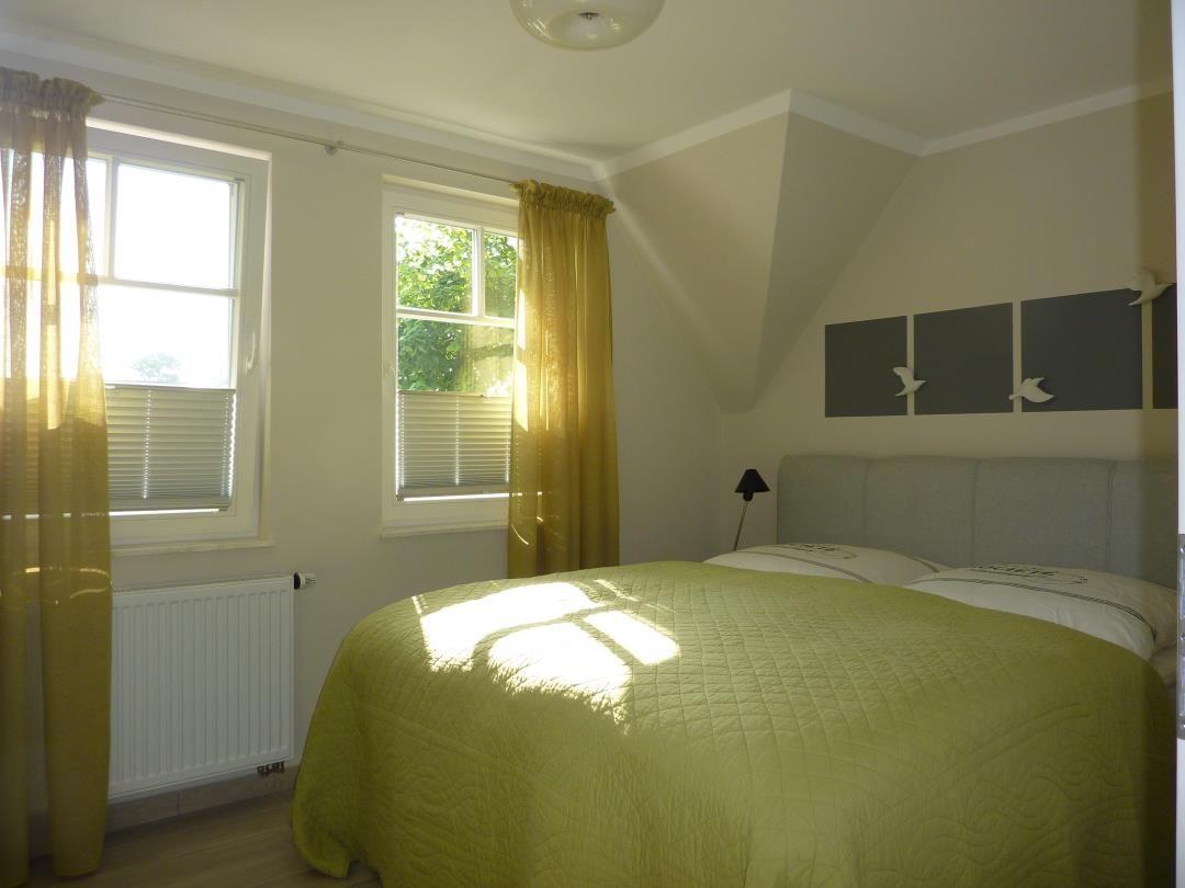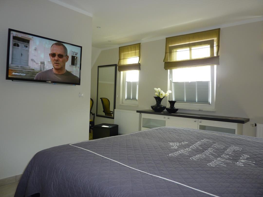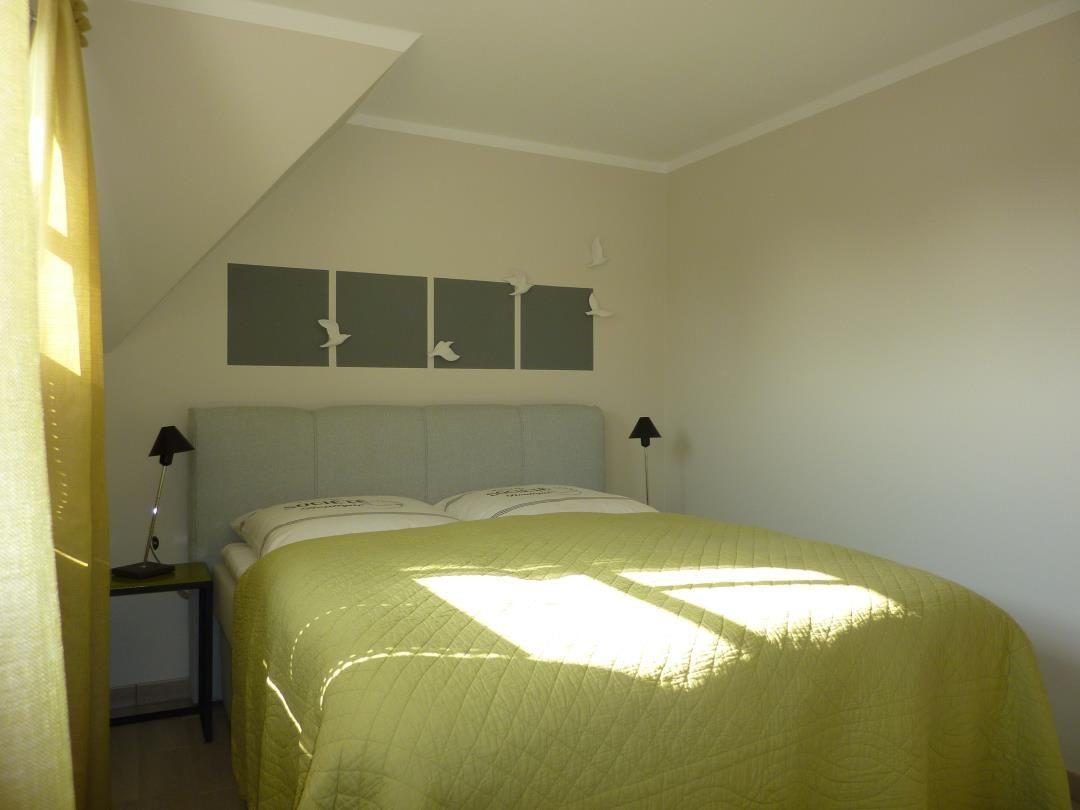 Das 1. Obergeschoss besteht aus 2 Schlafzimmern und einem großen Bad mit Dusche und Zugang zur Sauna (Nutzung gegen Gebühr/Münzeinwurf möglich). Die zwei Schlafzimmer sind je mit einem hochwertigen Boxspringbett eingerichtet. Ein drittes Schlafzimmer mit zwei Einzelbetten ist im Dachgeschoss vorhanden.