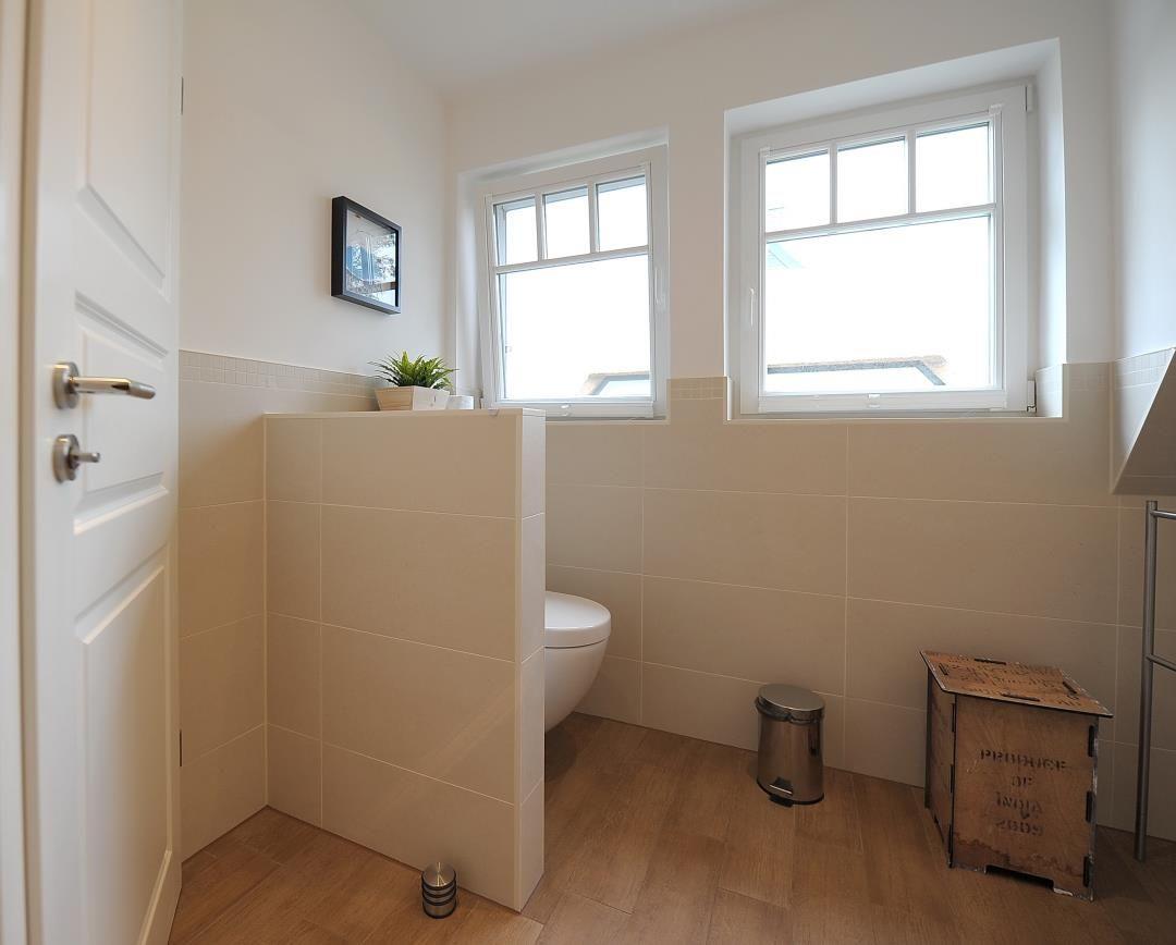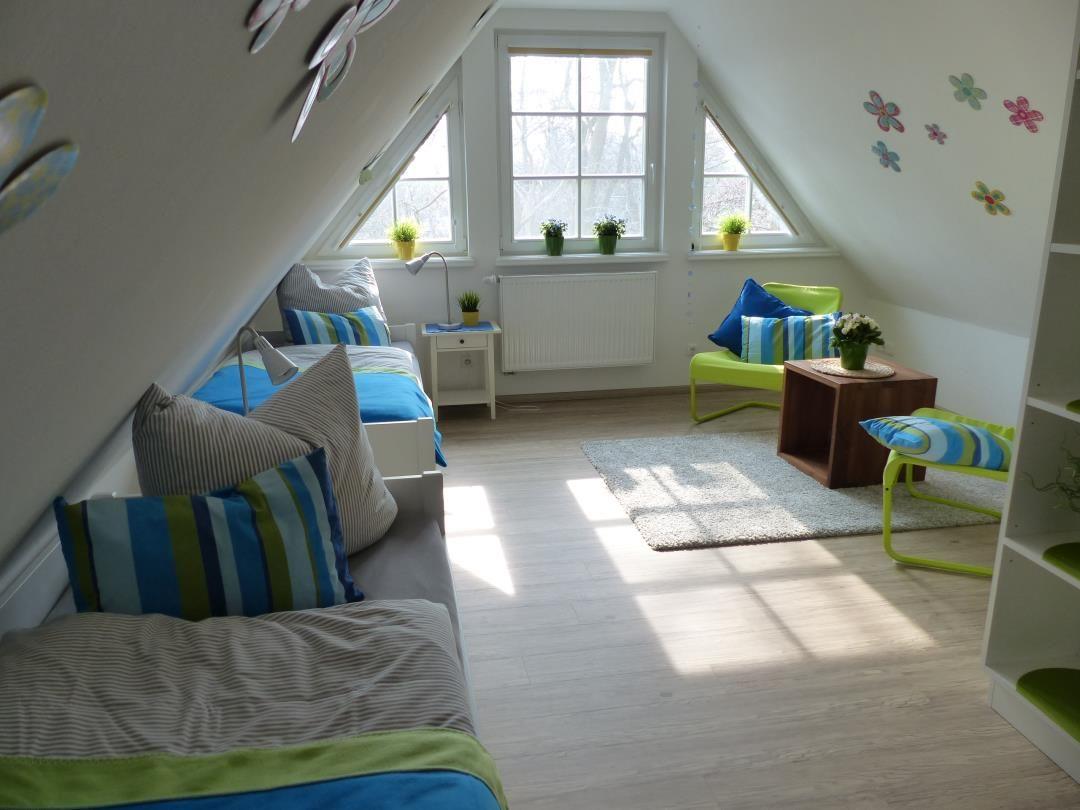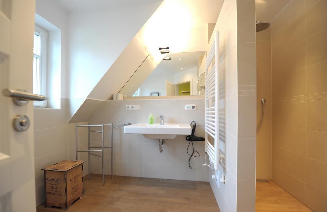 Die in 2013 fertig gestellte Ferienwohnung im 1. Obergeschoss ist sehr hochwertig und modern ausgestattet und bietet viel erfrischendes Ambiente ohne Verzicht auf umfassenden Komfort. Sie verfügt über einen Süd-Balkon, der in den Sommermonaten zum Essen und Entspannen im Freien einlädt. Im 1. OG befindet sich 1 Schlafzimmer mit komfortablen Boxspringbetten (2,00 x 1,80 m). Ein weiteres Schlafzimmer mit 2 Einzelbetten steht im 2. OG zur Verfügung. Die Wohnung ist mit einem großzügigen, modernen Bad mit ebenerdiger Dusche ausgestattet. Durch den PVC-freien Laminatfußboden ist die Wohnung für Allergiker geeignet.