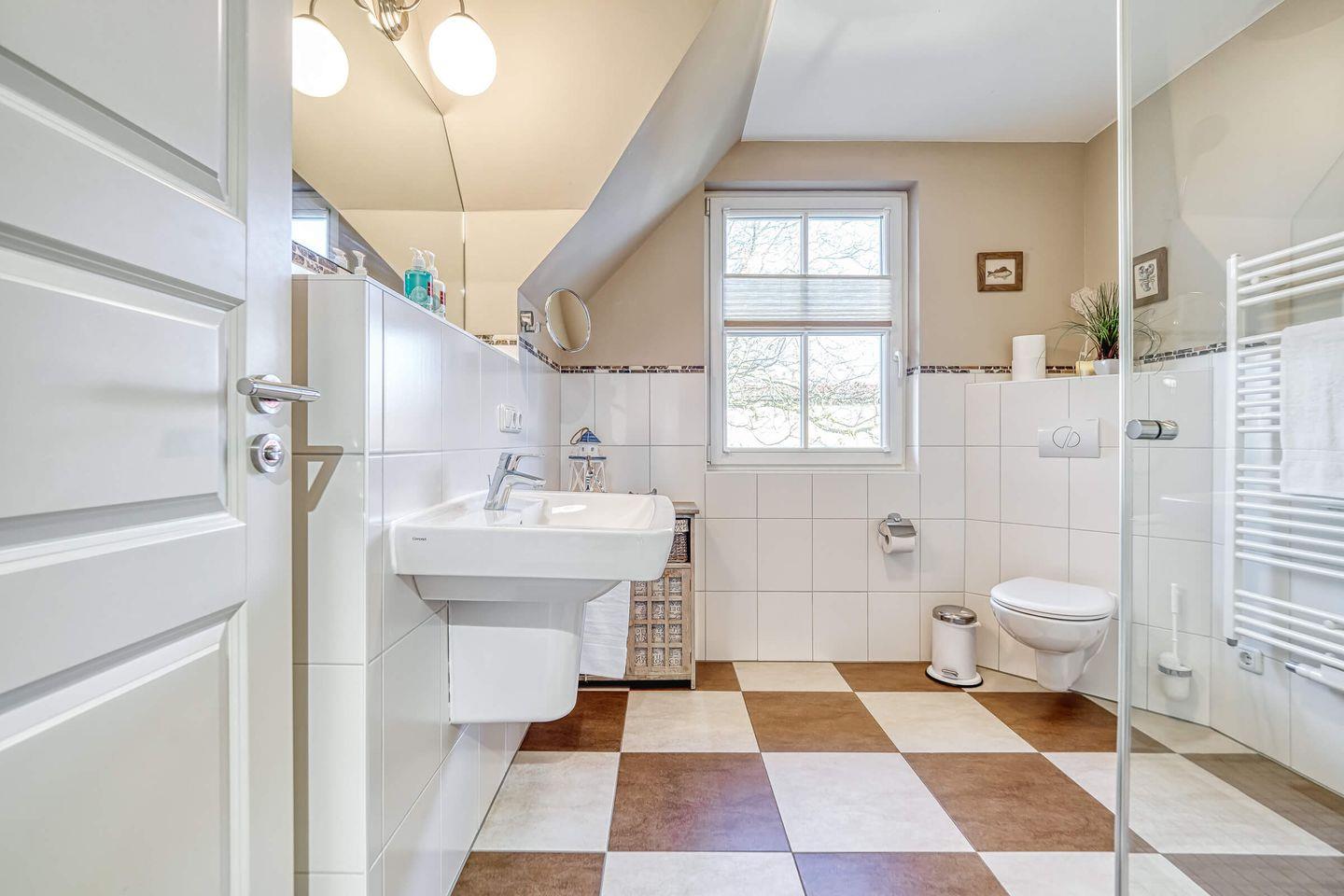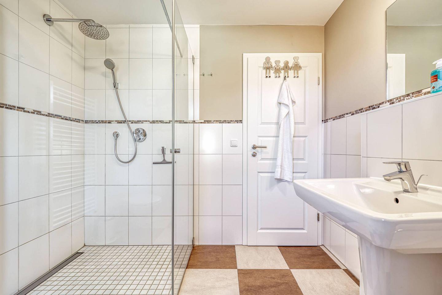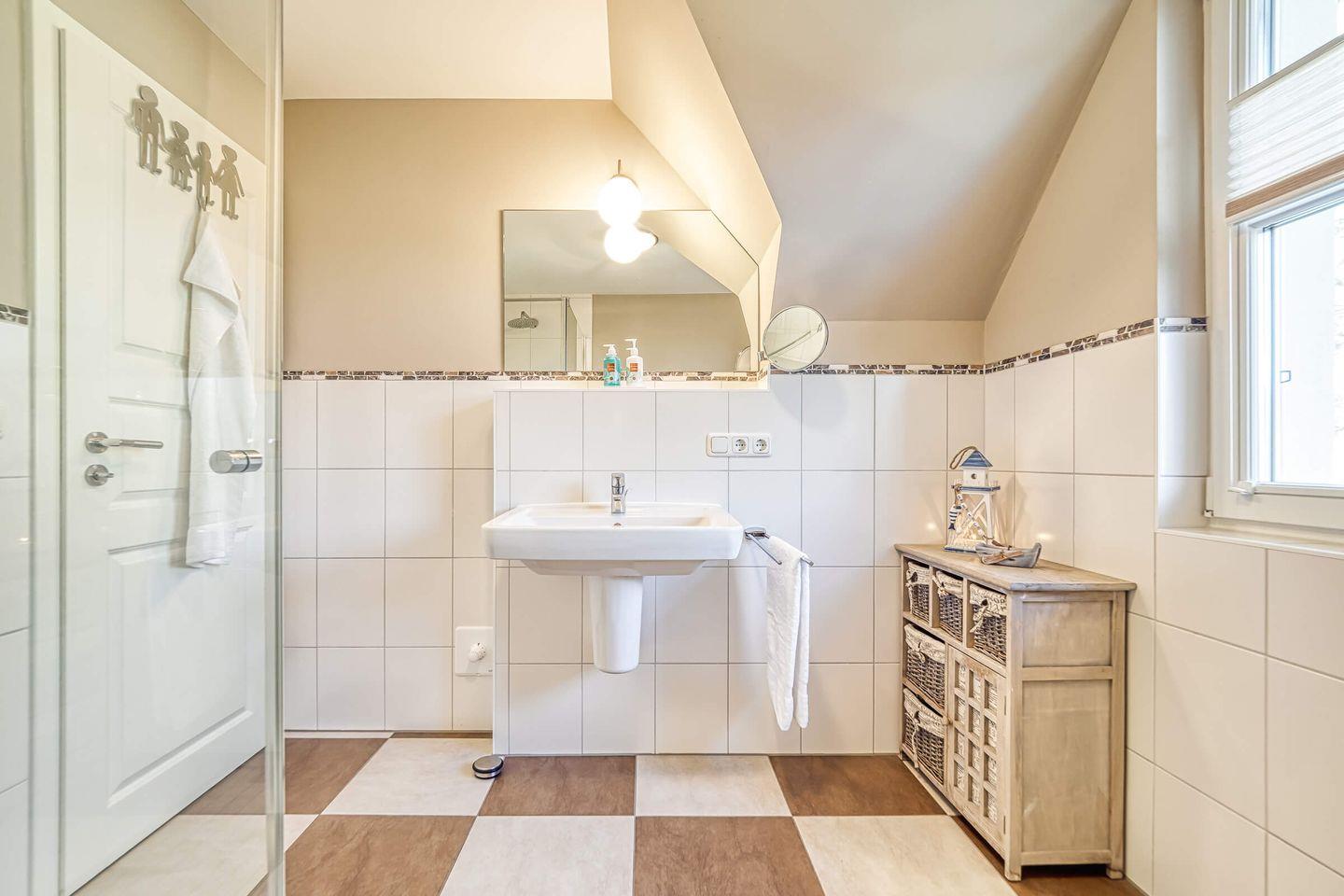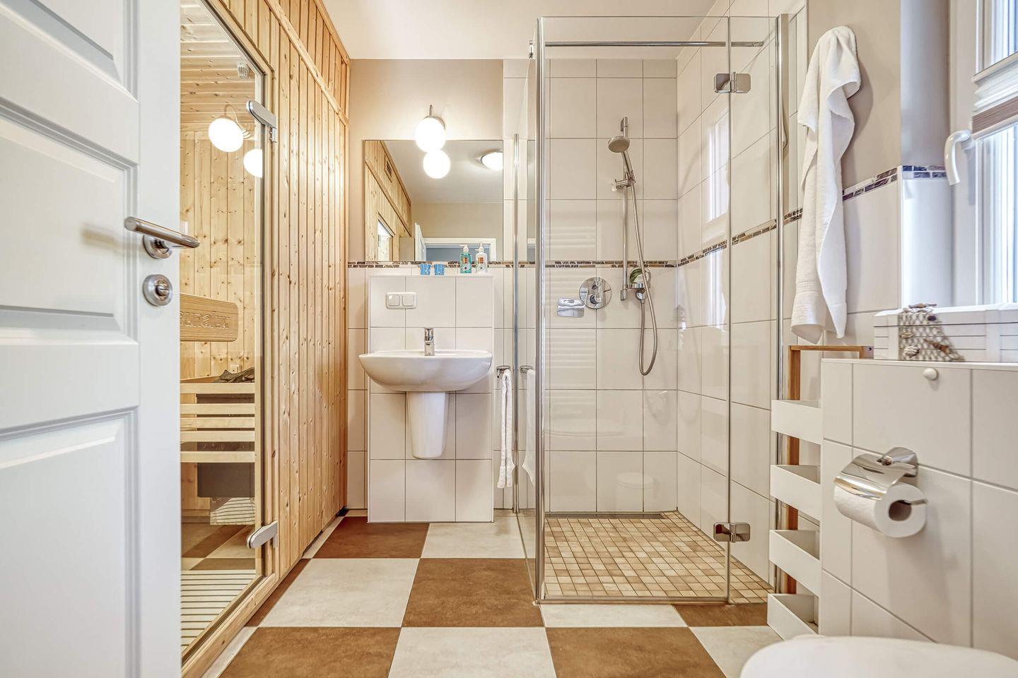 Beide Bäder (EG und 1. OG) haben eine Fußbodenheizung, einen Handtuchheizkörper, eine großzügige Dusche, Waschbecken und WC. Im EG Bad ist unsere tolle Sauna eingebaut. Hier können Sie für 2,00 € entspannt saunieren. Im Hauswirtschaftsraum befindet sich eine Waschmaschine und ein Trockner, beide auch für 2,00 € nutzbar. Bei Bedarf steht Ihnen ein Kinderhochstuhl sowie ein Kinderreisebett mit Matratze kostenlos zur Verfügung. Das gesamte Haus hat einen Korkfußboden mit Holzoptik bzw. Fliesen.