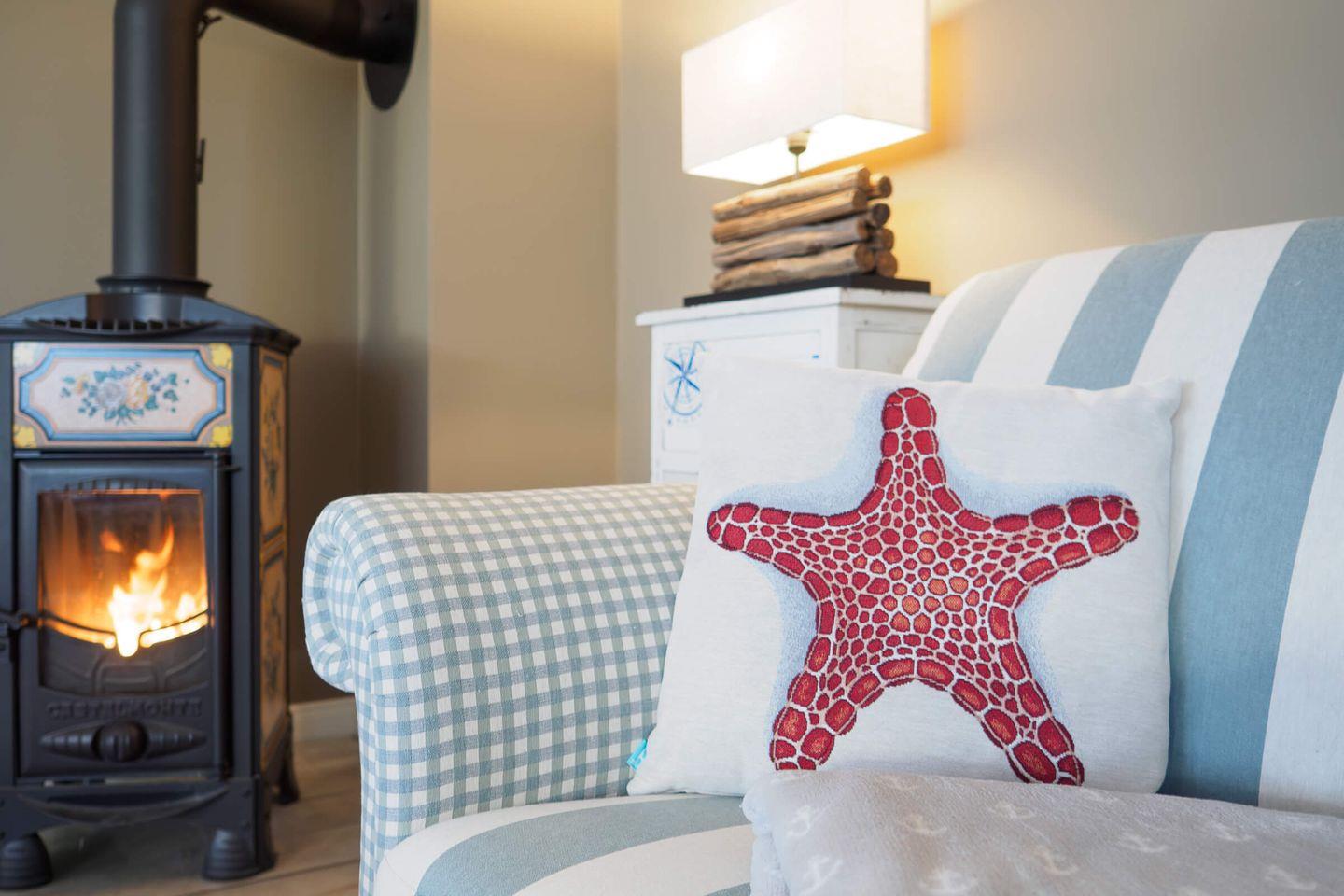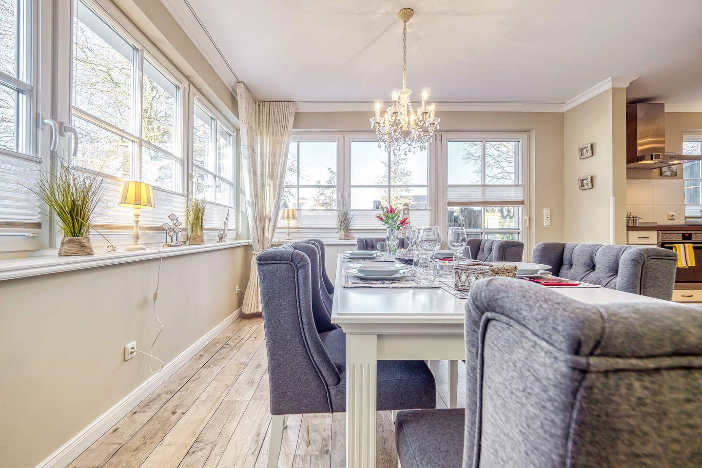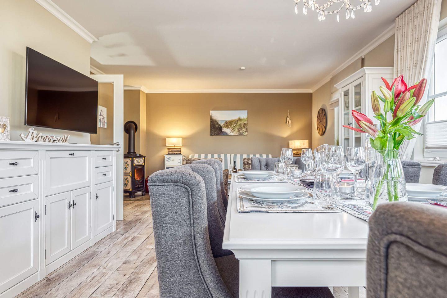 Im Erdgeschoss finden Sie das lichtdurchflutete Wohn-/Esszimmer. Hier verbringen Sie entspannte Abende auf den gemütlichen Sofas, während der Kaminofen vor sich hin bullert. Hier können Sie abends mit der Familie ein Gesellschaftsspiel spielen oder ein Buch aus dem vorhandenen Bücherschrank lesen oder Sie genießen eine der vorhandenen DVDs/Blue-Rays am großen Flat-TV mit Blue-Ray Player. Selbstverständlich steht Ihnen ein schnelles WLAN im Haus, beispielsweise zum Streamen, kostenfrei jederzeit zur Verfügung.