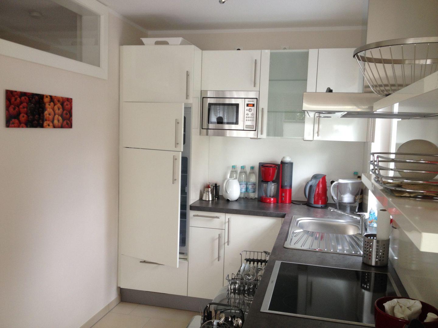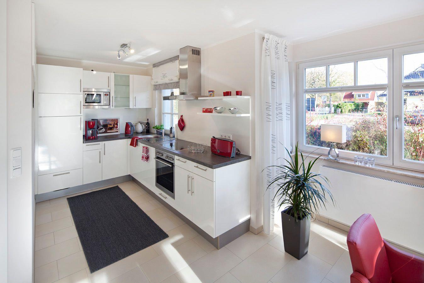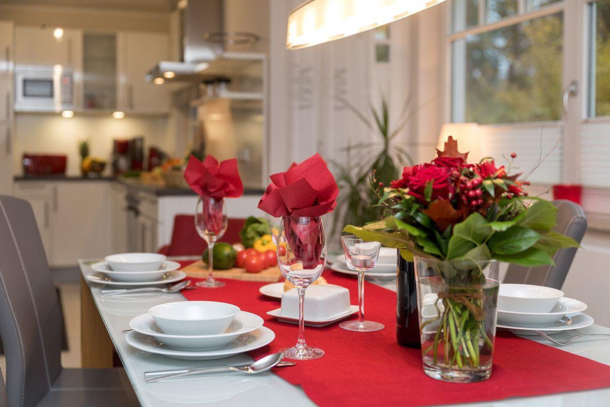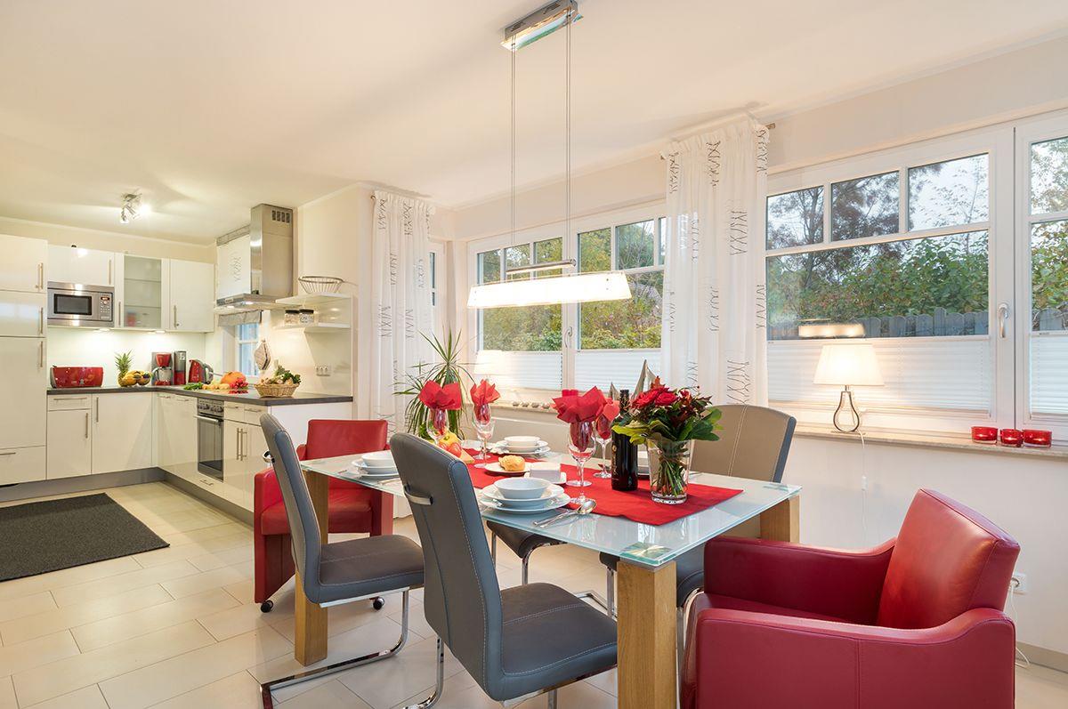 Im Erdgeschoss befinden sich der nach Süden ausgerichtete Wohnbereich mit lichtdurchfluteter Darß-Veranda und offener hochwertiger komplett ausgestatteter Einbauküche mit Backofen, Spülmaschine, Mikrowelle und Kühl/Gefrier-Kombination. Die Ausstattung wird komplettiert mit einem großzügiger Essplatz, einer gemütlichen Ledersitzcouch, ein Kaminofen mit Sichtfenster, einem Flachbildschirm mit Satellitenanschluss, einem CD-Radio und einem kostenfreien WLAN für den Internetzugang.