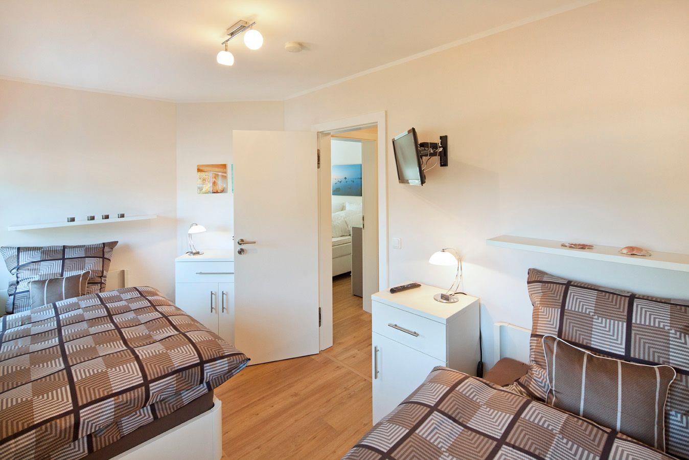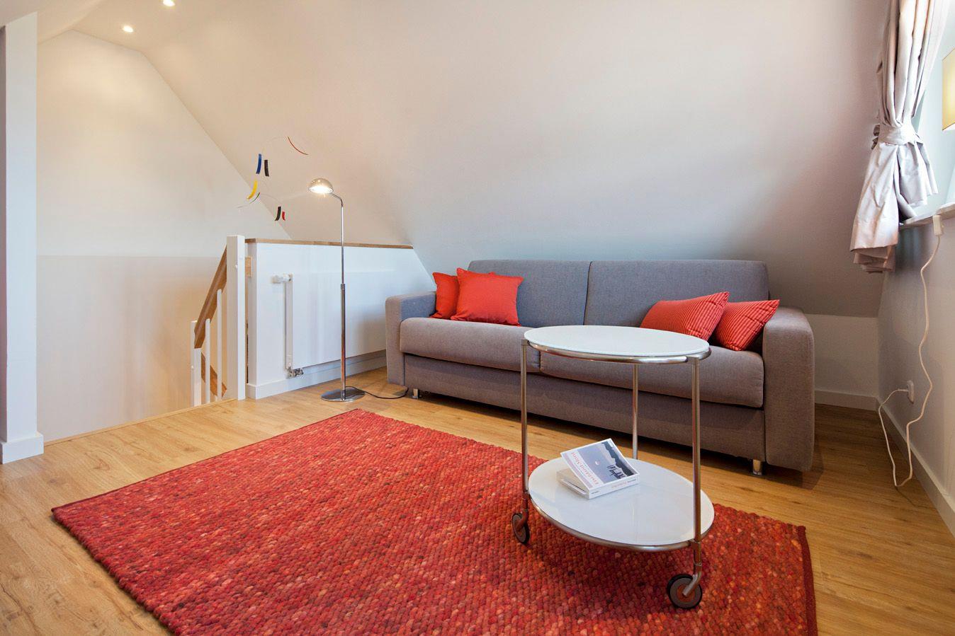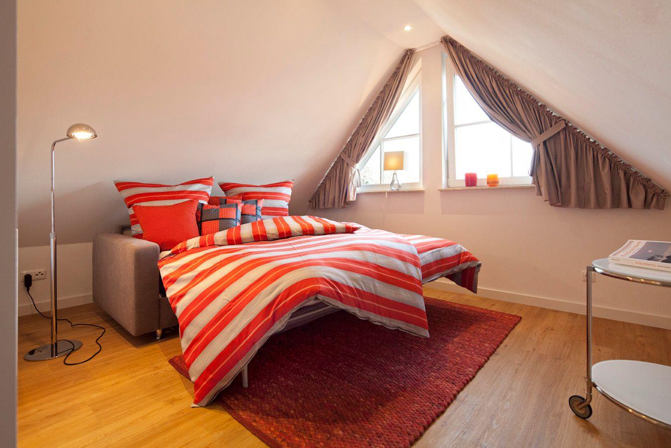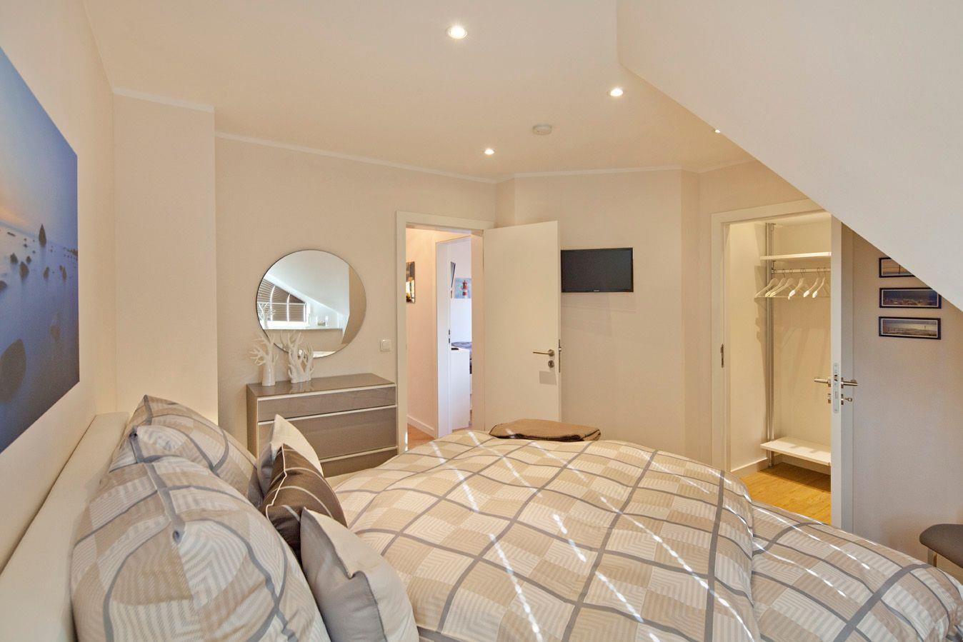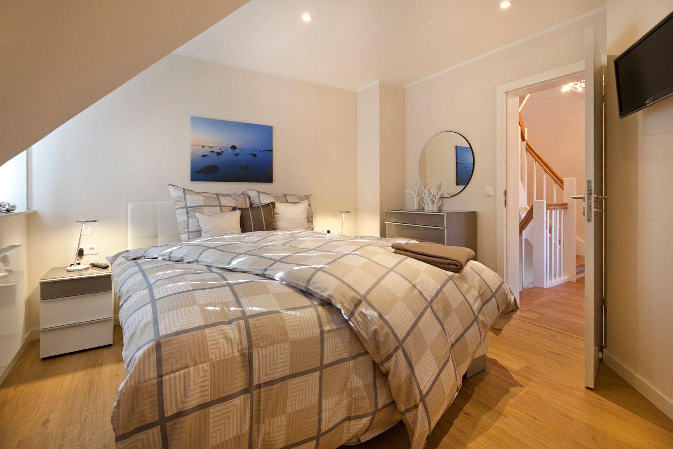 Über eine massive Holztreppe gelangen Sie in das Obergeschoss. Hier finden Sie das Master-Schlafzimmer mit Boxspringbett (1,8x2,00m), Flachbildschirm mit Satellitenanschluss sowie einem begehbarerem Kleiderschrank mit Safe. Im zweiten Schlafzimmer bestehen die Schlafmöglichkeiten aus 2 Einzelbetten (0,90 x 2,00m). Die Einzelbetten verfügen über einen Bettkasten, der als Stauraum für Koffer etc. genutzt werden kann. Nachttische, Garderobe und Kommode vervollständigen die Ausstattung. Alle Schlafzimmer verfügen über eine Verdunkelungsmöglichkeit und sind mit Vinylboden ausgestattet. Über den offenen Treppenzugang gelangen Sie zum Spitzboden. Hier finden Sie eine weitere Schlafmöglichkeit für 2 Personen auf dem ausziehbaren Schlafsofa (ideal für Kinder).