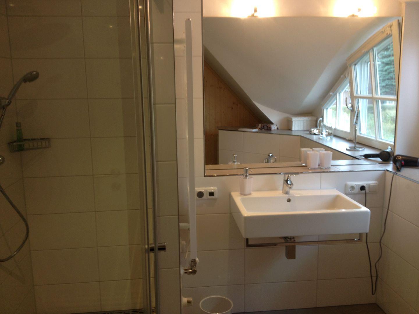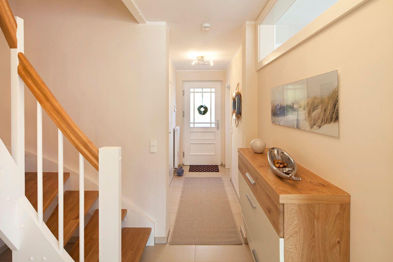 Das gesamte EG ist hell gefliest. Der im EG befindliche Flur ist mit einem Schuhschrank ausgestattet. Beide Bäder verfügen über eine ebenerdige Dusche und WC; das Bad im OG über eine zusätzliche Sauna.