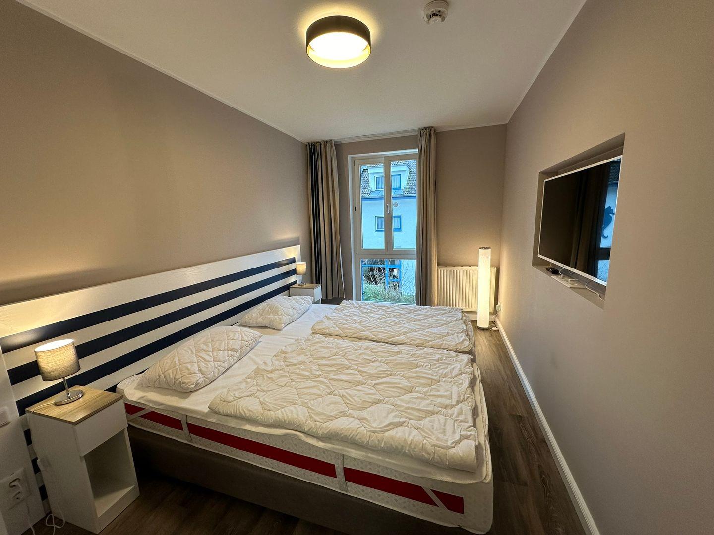 Das im 2. OG befindliche Apartment im mediterran-maritimen Stil bietet Platz für max. 4 Personen und ist mit dem Fahrstuhl erreichbar. Es verfügt über ein lichtdurchflutetes Wohnzimmer mit integrierter Einbauküche und einem Essbereich. Das Schlafzimmer mit Doppelbett und Einbauschrank sowie das moderne Duschbad sind über einen kleinen Flur mit Einbauschrank zu betreten.