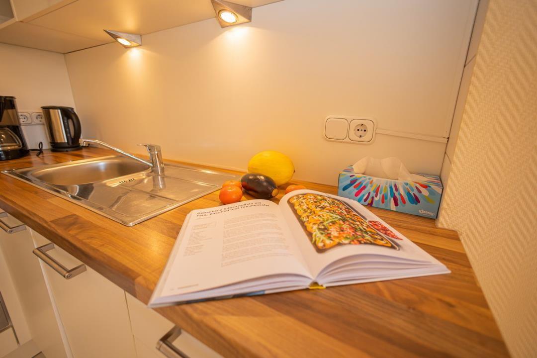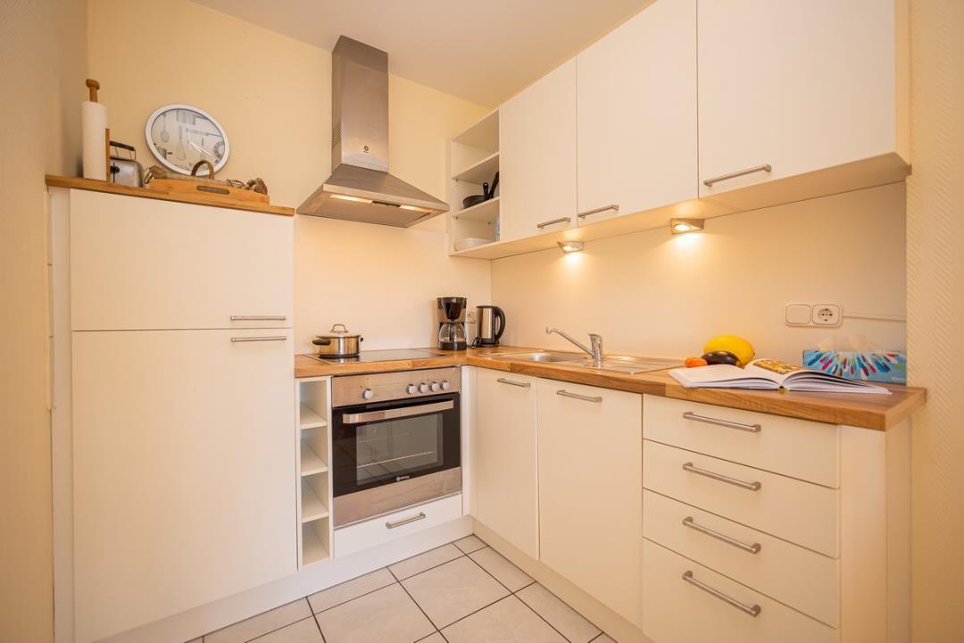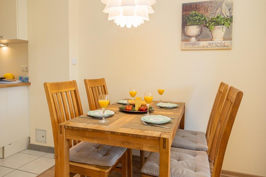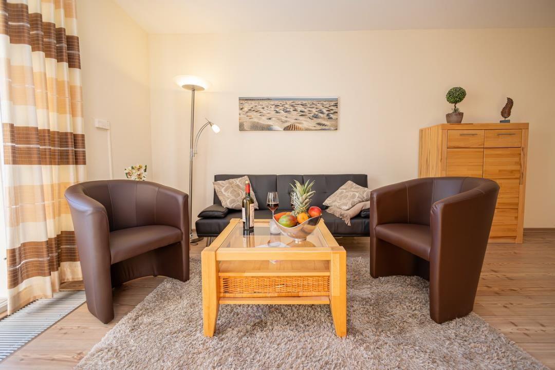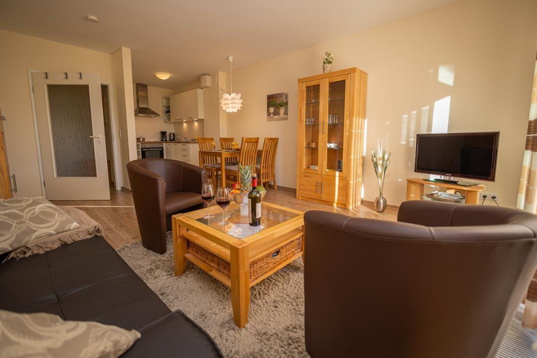 Die Wohnung verfügt über ein helles und einladendes Wohnzimmer, das mit einem komfortablen Sofa und einem Fernseher ausgestattet ist. Hier können Sie nach einem erlebnisreichen Tag an der Ostsee entspannen und den Abend bei einem guten Film genießen. Die angrenzende offene Küche lässt keine Wünsche offen und ist mit einem Herd, einem Kühlschrank, einem Backofen, einer Mikrowelle sowie einer Spülmaschine ausgestattet. Geschirr und Besteck stehen Ihnen selbstverständlich ebenfalls zur Verfügung, sodass das Zubereiten und Genießen von Mahlzeiten leicht von der Hand geht. Der Esstisch im Wohnzimmer bietet Platz für gemeinsame Mahlzeiten und gesellige Abende.