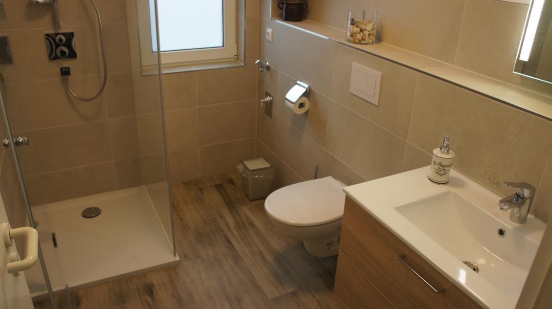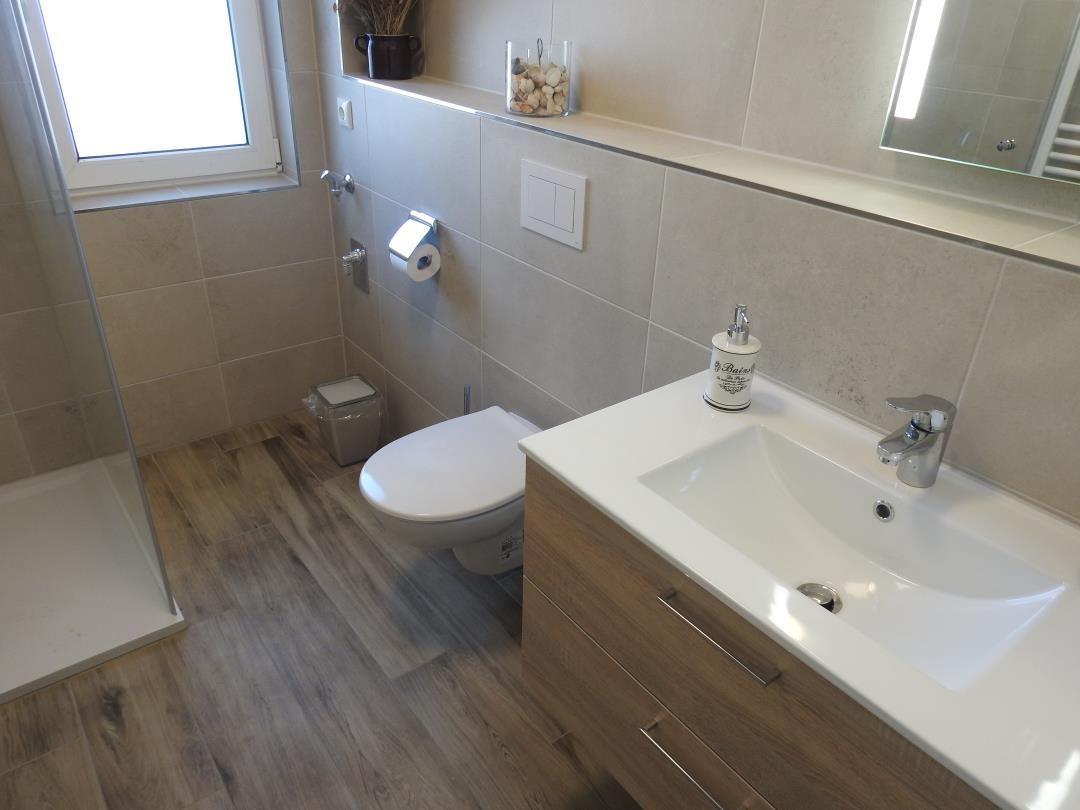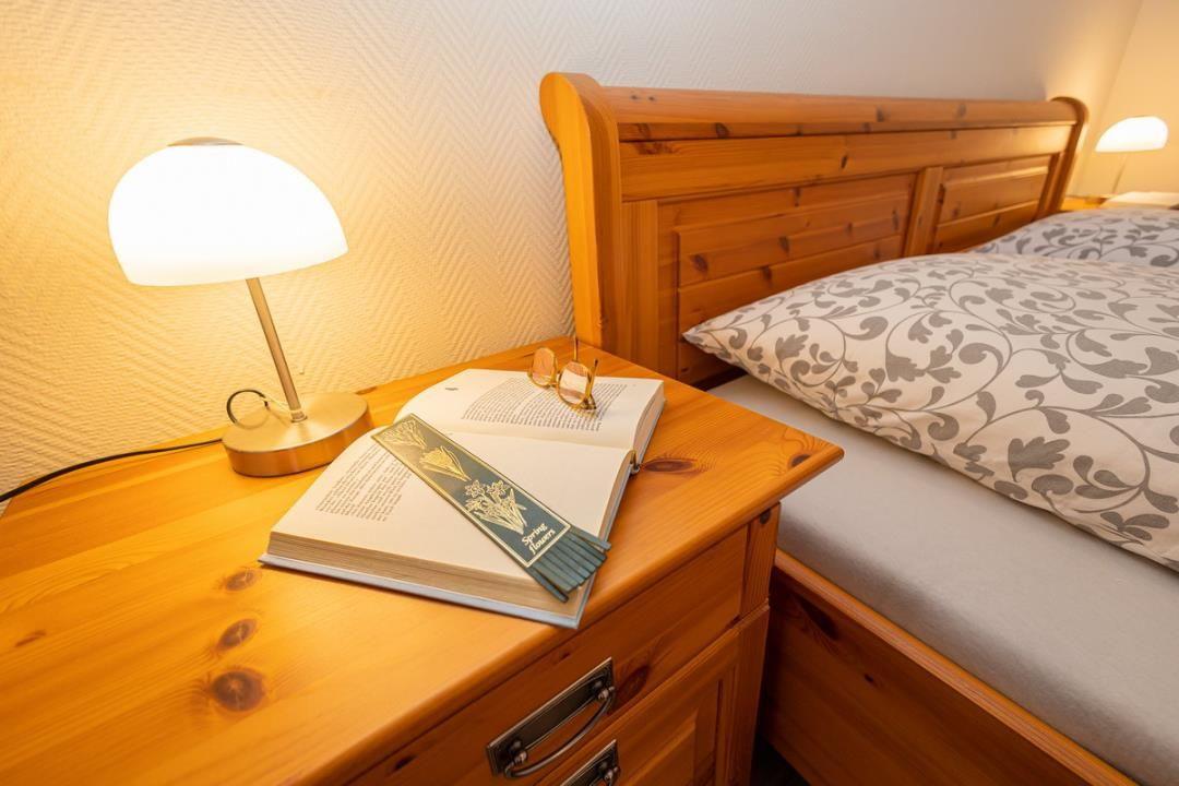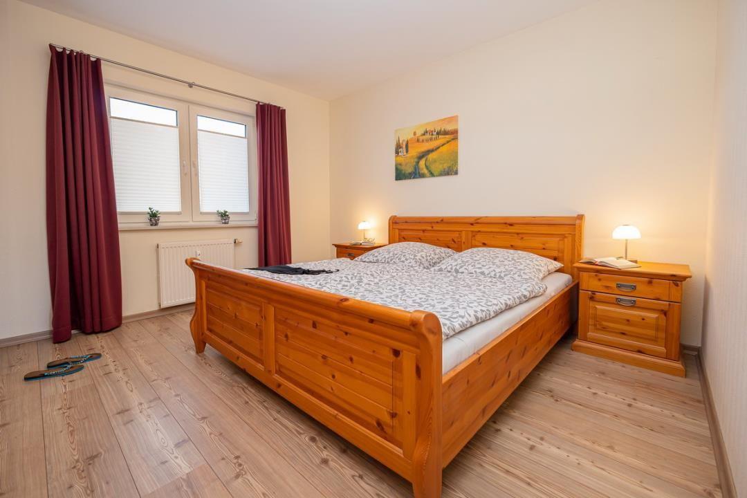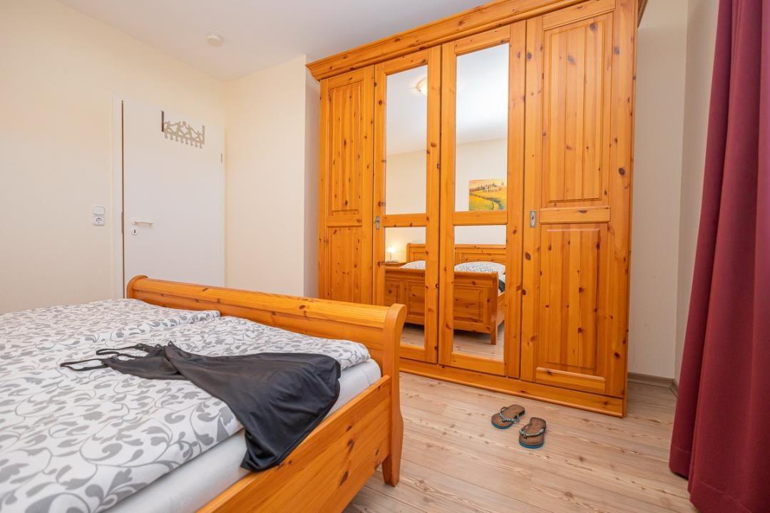 Die Wohnung bietet ein Schlafzimmer, das für Ihre Nachtruhe sorgt. Mit einem bequemen Bett und einer angenehmen Atmosphäre ist es der perfekte Rückzugsort. Zudem besteht die Möglichkeit, auf dem Schlafsofa im Wohnzimmer eine weitere Schlafgelegenheit für eine weitere Person zu nutzen. Für Ihr Wohlbefinden sorgt auch das Badezimmer mit einer bodengleichen Dusche, einem WC und einem Waschbecken. Hier können Sie sich nach einem Tag am Strand erfrischen und entspannen.