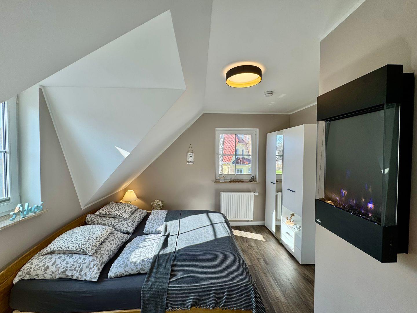 Über eine Wendeltreppe gelangen Sie ins 1. Obergeschoss. Das dort befindliche Schlafzimmer verfügt über ein Doppelbett, einen Kleiderschrank, ein Sofa und einen Elektrokamin. Platz für ein Kinderbett ist vorhanden. Über den Flur sind das 2. Schlafzimmer mit 2 Einzelbetten und Kleiderschrank sowie das Gäste-WC zu betreten. Eine weitere Schlafmöglichkeit für 2 Personen bietet das bequeme Schlafsofa im Wohnzimmer.