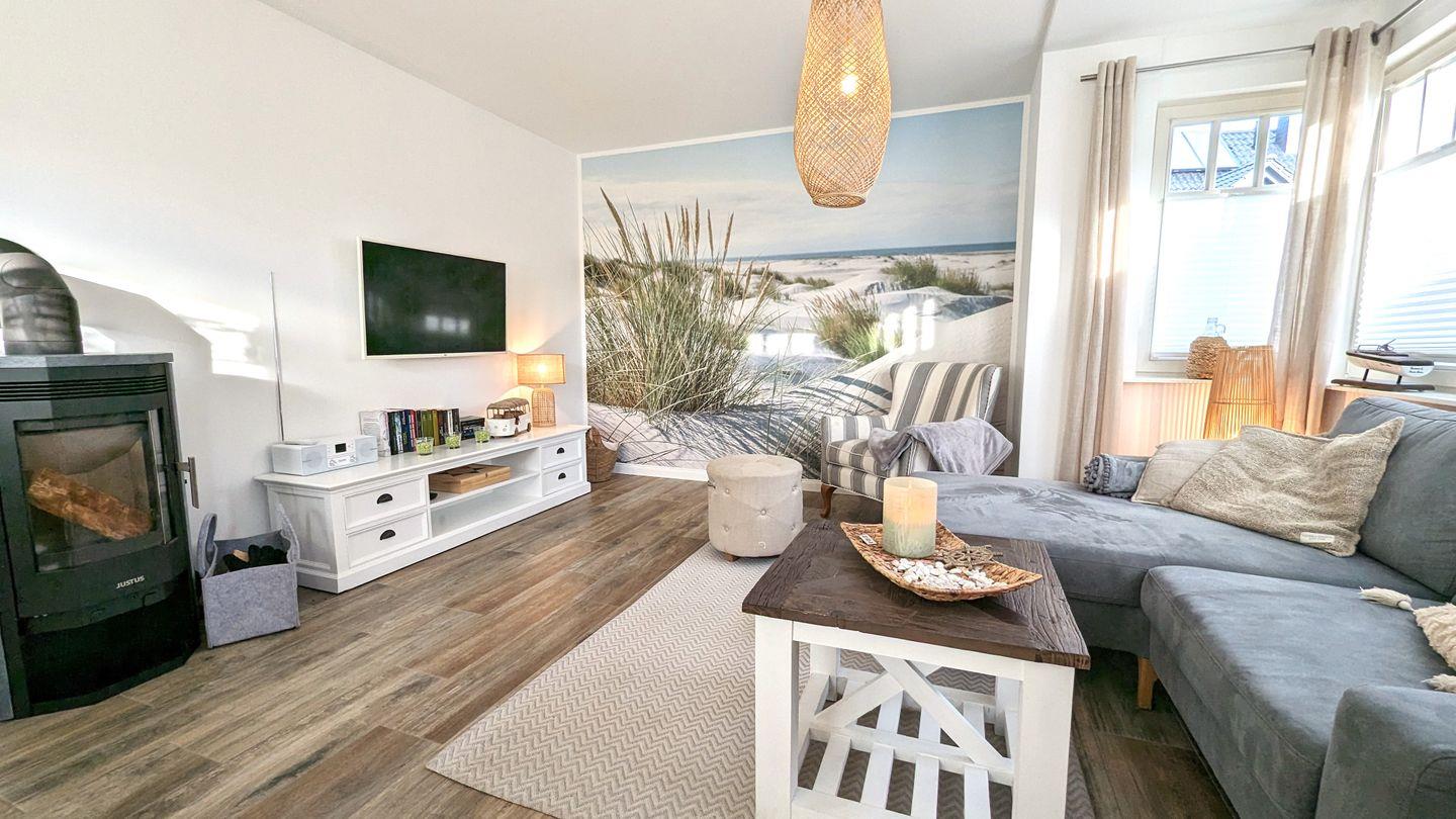 Die Sitzlandschaft im Wohnbereichs vor dem Kaminofen verspricht lauschige