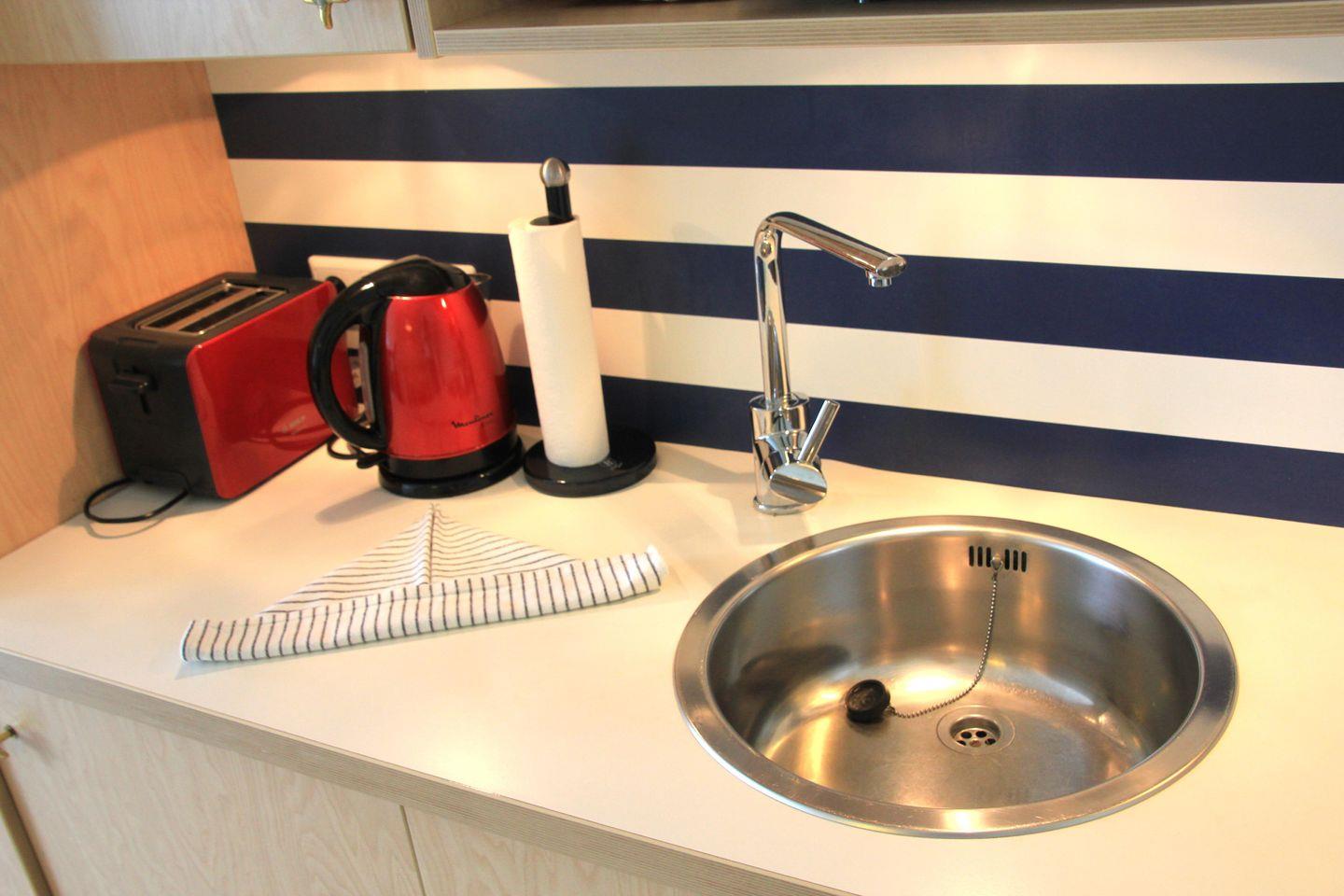 Dafür nutzen Sie Kühlschrank mit Gefrierfach, Herd, Mikrowelle, Kaffeemaschine, Wasserkocher, Geschirr und Küchenausstattung.