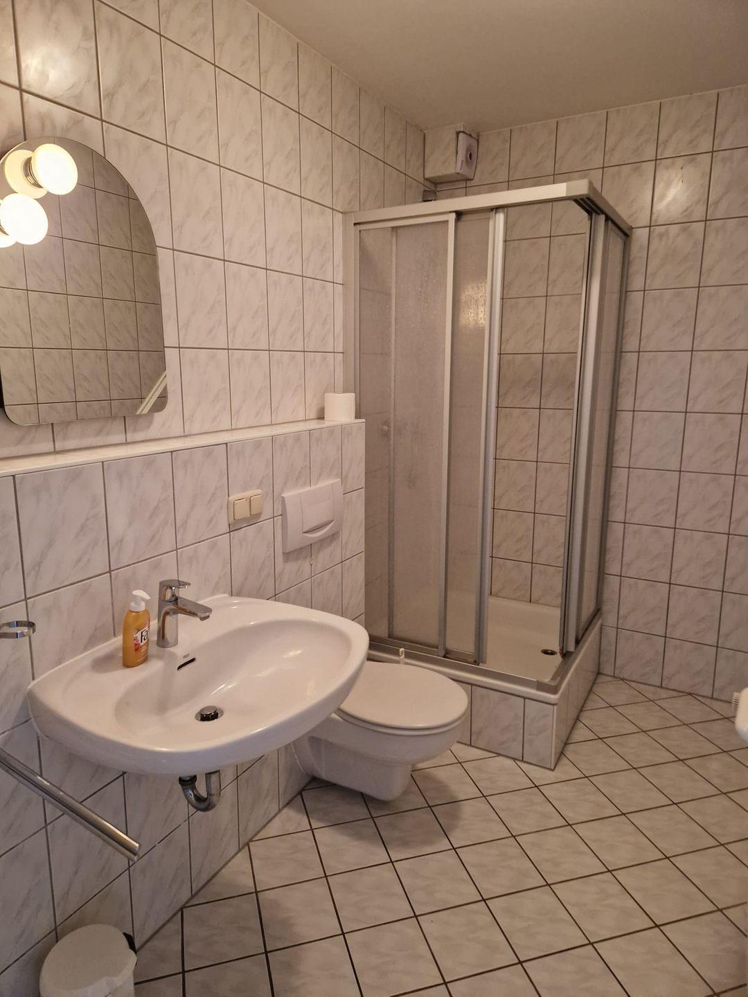 Ein Schlafzimmer mit Ehebett und Verdunklungsrollo, ein Schlafzimmer mit Einzelbett ( Außenrollo). Bad mit Dusche/WC.