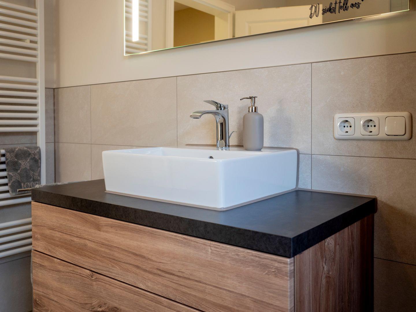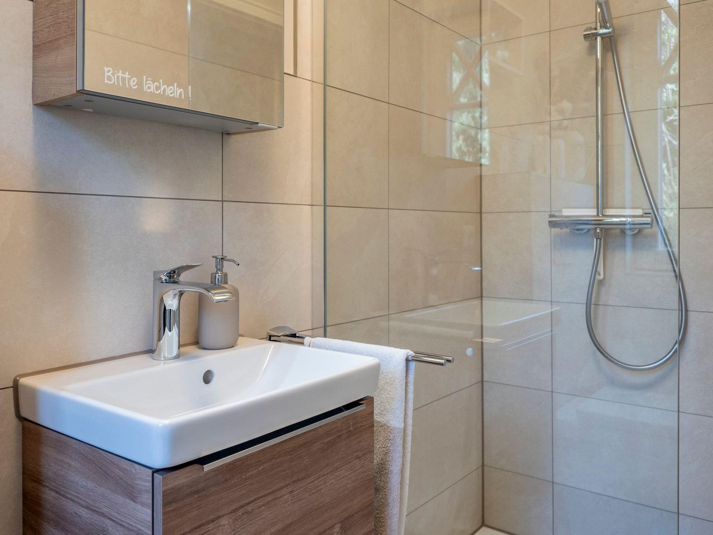 Für Ihre Hygiene sorgen zwei moderne und hochwertig ausgestattete Bäder mit einer Dusche, Handtuchheizkörper, Fön, Kosmetikspiegel, hochwertigen Handtüchern und Badmatten und viel Ablagefläche für Ihre Utensilien.