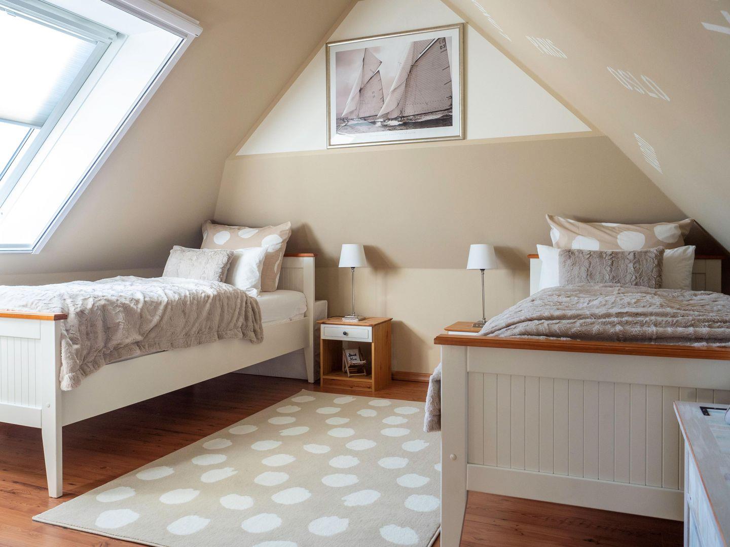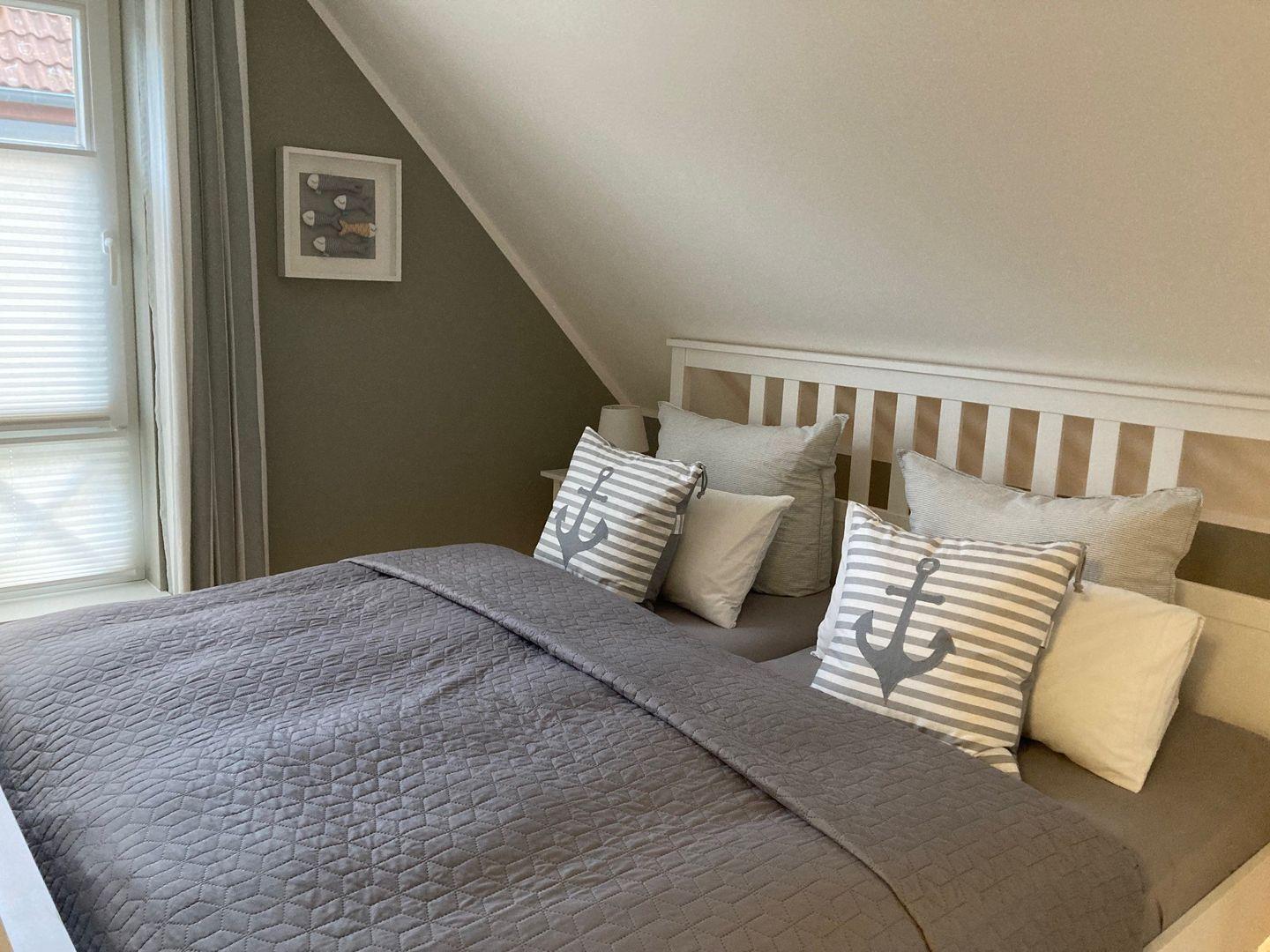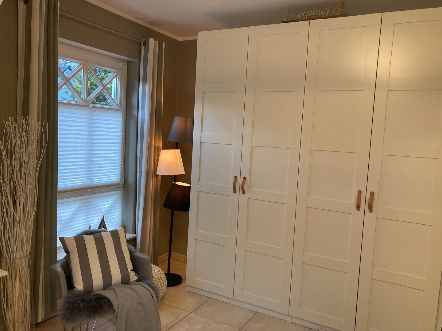 Mit drei ruhigen und komfortablen Schlafzimmern mit zwei Doppel – und zwei Einzelbetten mit komfortablen Matratzen (4 Jahreszeiten Feder-Daunen-Betten (Decke 140x200cm, Kissen 80x80cm und 40x80cm),bietet der Ostseezwilling 2 seinen Gästen erholsame Nächte und viel Platz für Ihre Kleidungsstücke. Für noch mehr Schlafkomfort sorgen Plissees, Insektenschutzgitter und Außenrollläden.