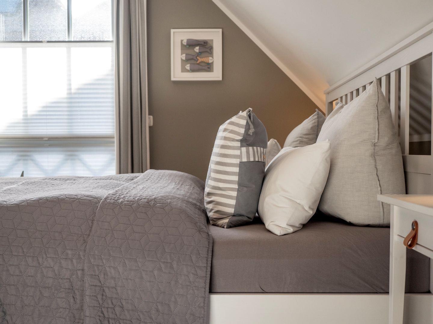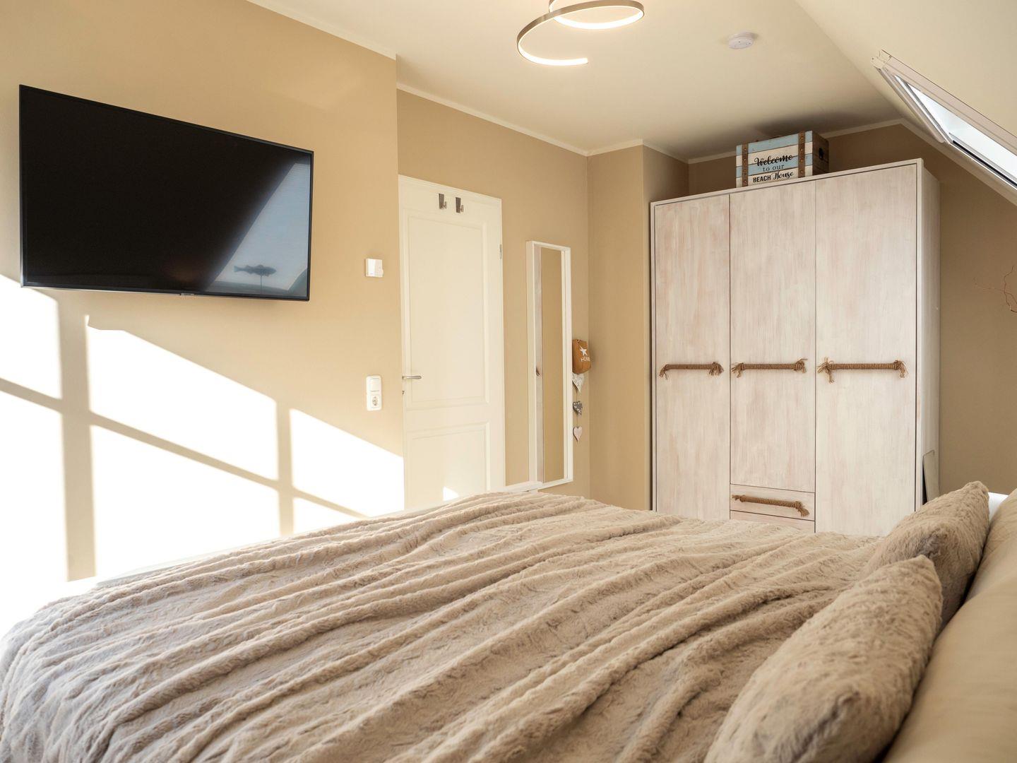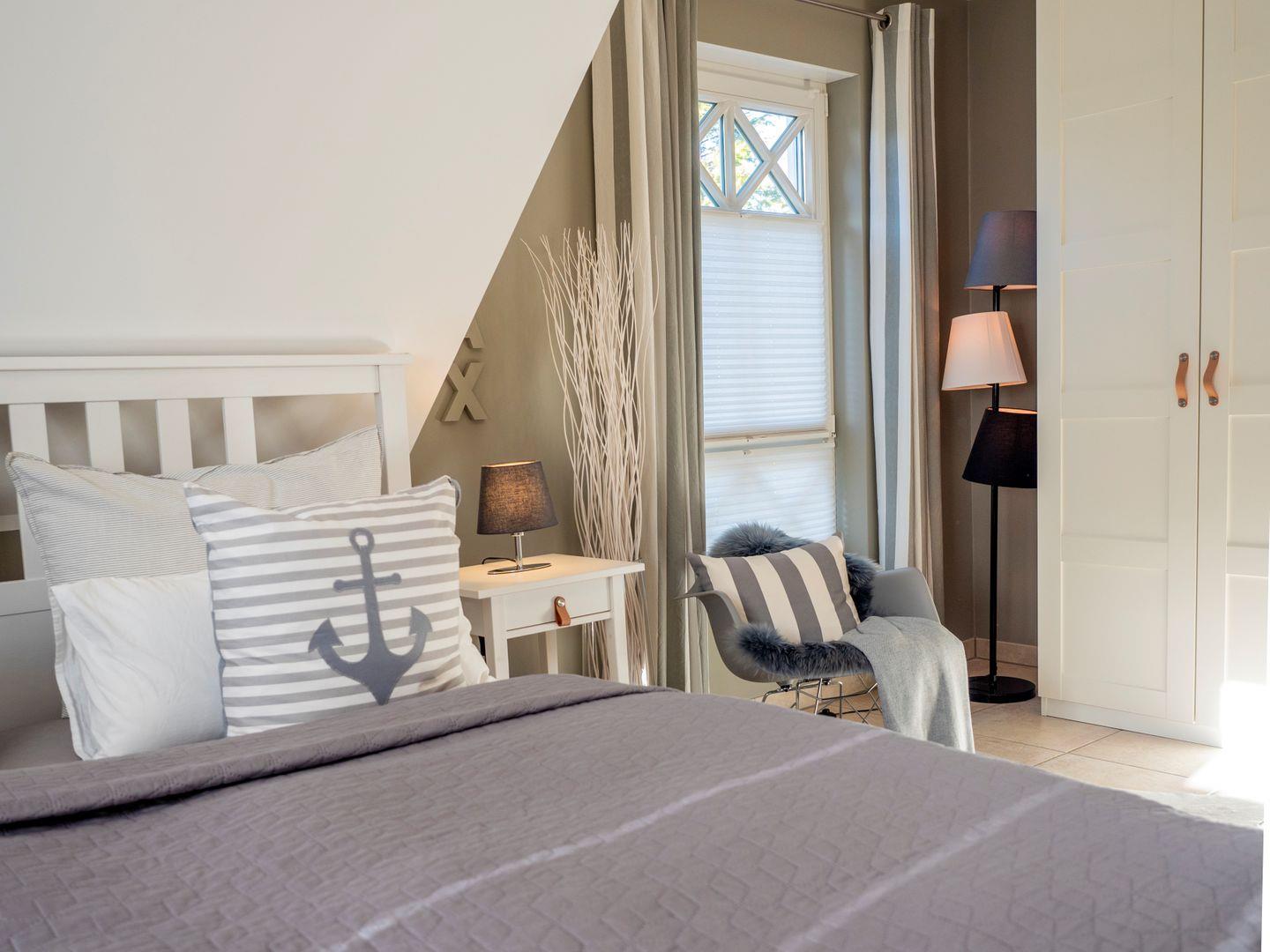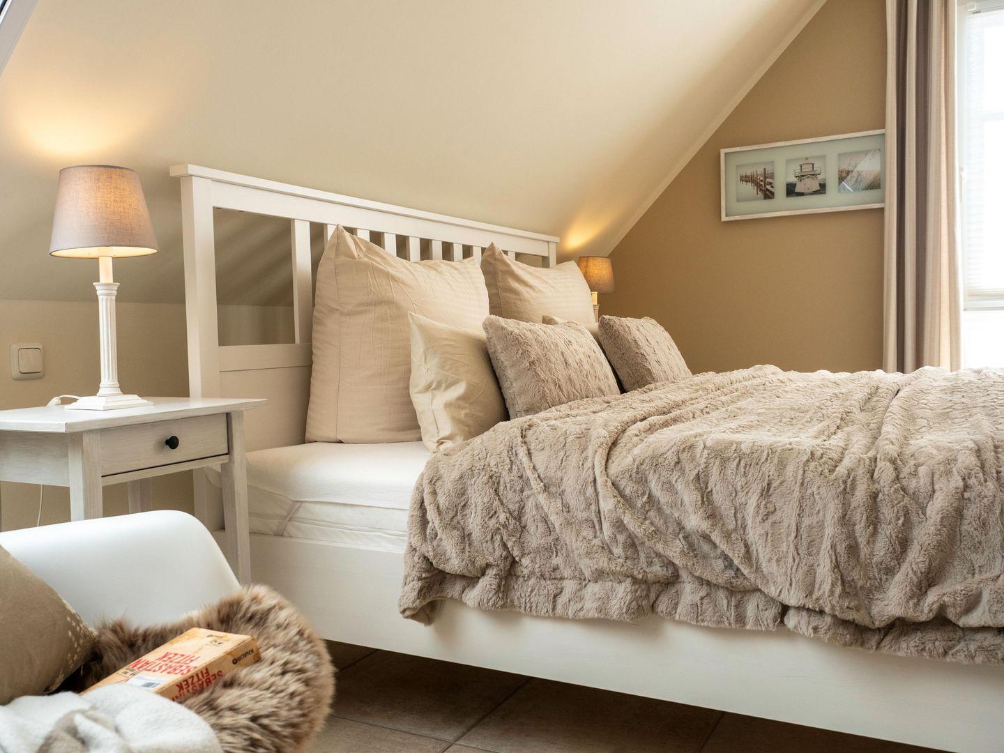 Mit drei ruhigen und komfortablen Schlafzimmern mit zwei Doppel – und zwei Einzelbetten mit komfortablen Matratzen (4 Jahreszeiten Feder-Daunen-Betten (Decke 140x200cm, Kissen 80x80cm und 40x80cm),bietet der Ostseezwilling 2 seinen Gästen erholsame Nächte und viel Platz für Ihre Kleidungsstücke. Für noch mehr Schlafkomfort sorgen Plissees, Insektenschutzgitter und Außenrollläden.