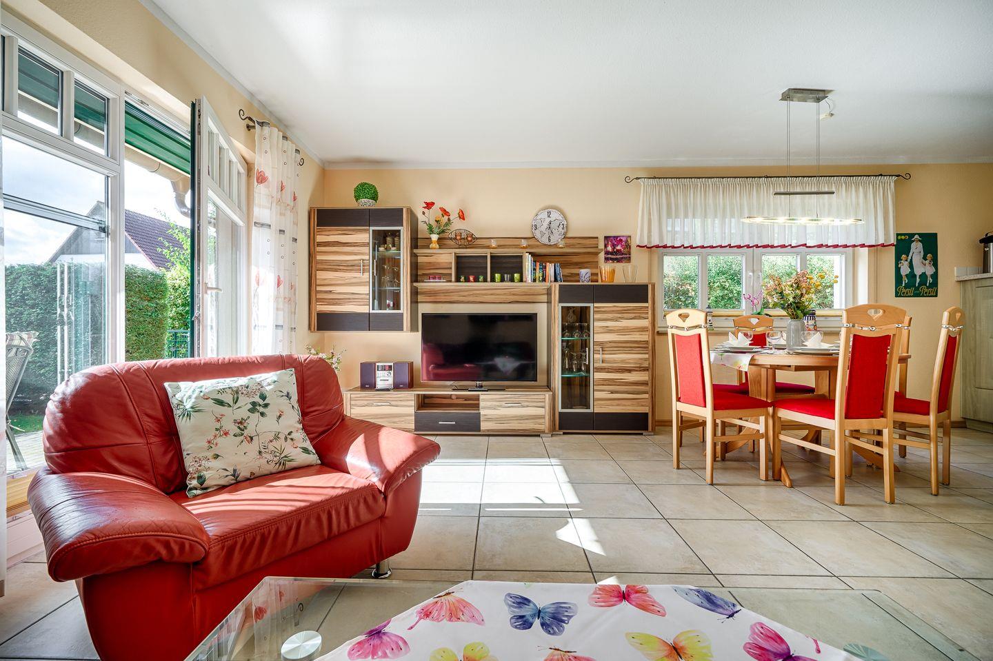 Wohnraum mit Ecksofa, Sessel, Esstisch für 6 Personen, TV