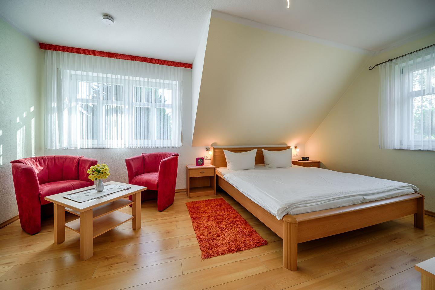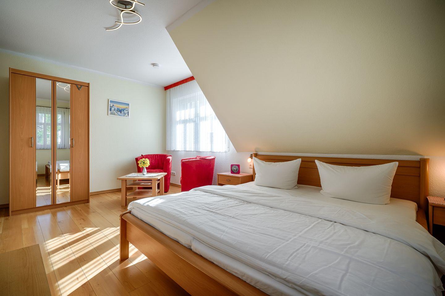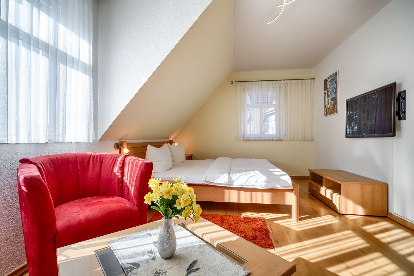 1 Schlafzimmer mit Doppelbett (1,80x2,00m), Federkernmatratzen mit verstellbaren Lattenrosten, 2 Sessel, TV