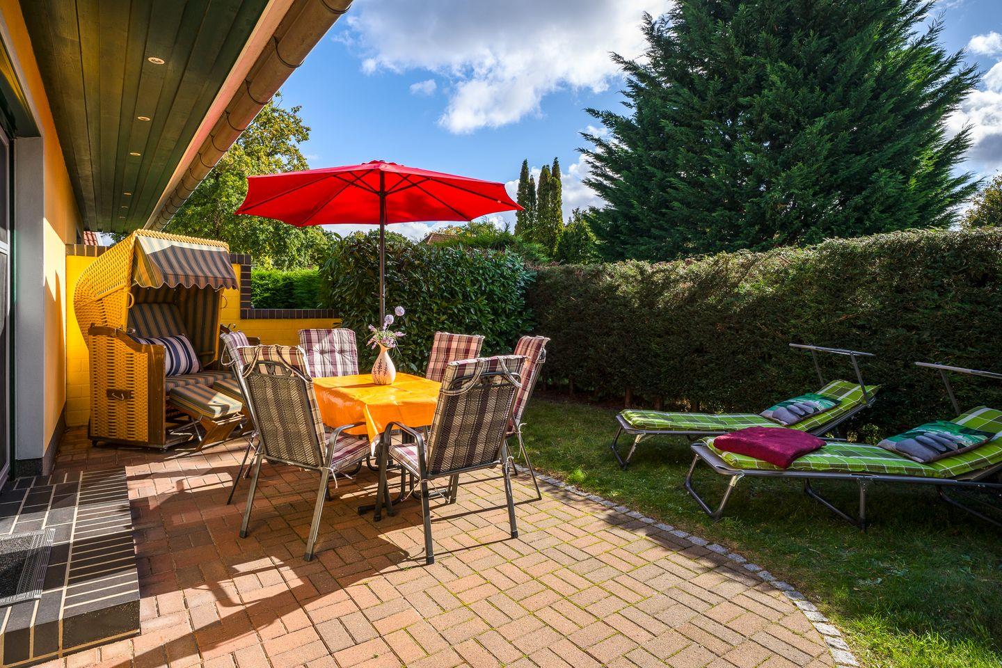 Terrasse mit Gartenmöbel, Sonnenschirm, Strandkorb, Grill