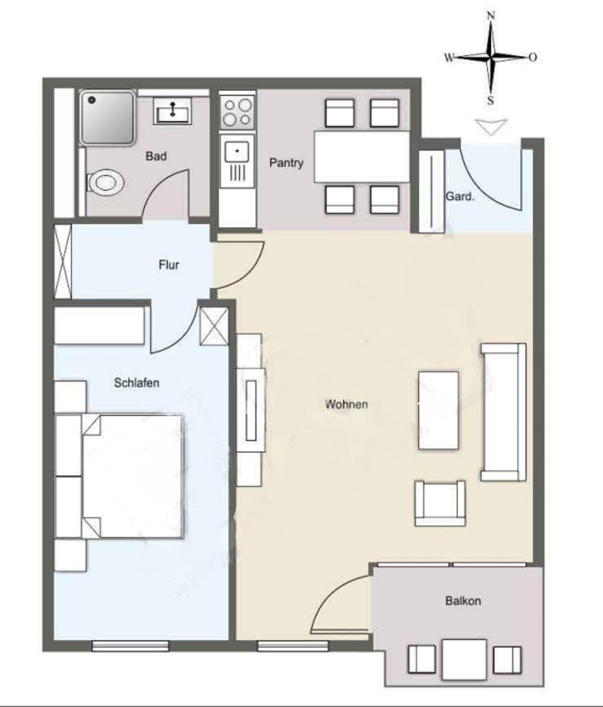 Ein großes Wohnschlafzimmer mit Schlafcouch, Schreibtisch, komplette Küche und Essecke, Schlafzimmer mit Doppelbett, Bad mit WC/Dusche, Balkon in Süd-Ost-Lage, TV, Wi-Fi (drahtloser Internetzugang) kostenlos