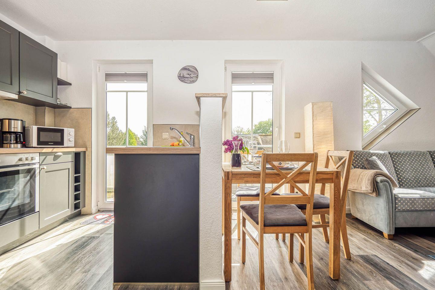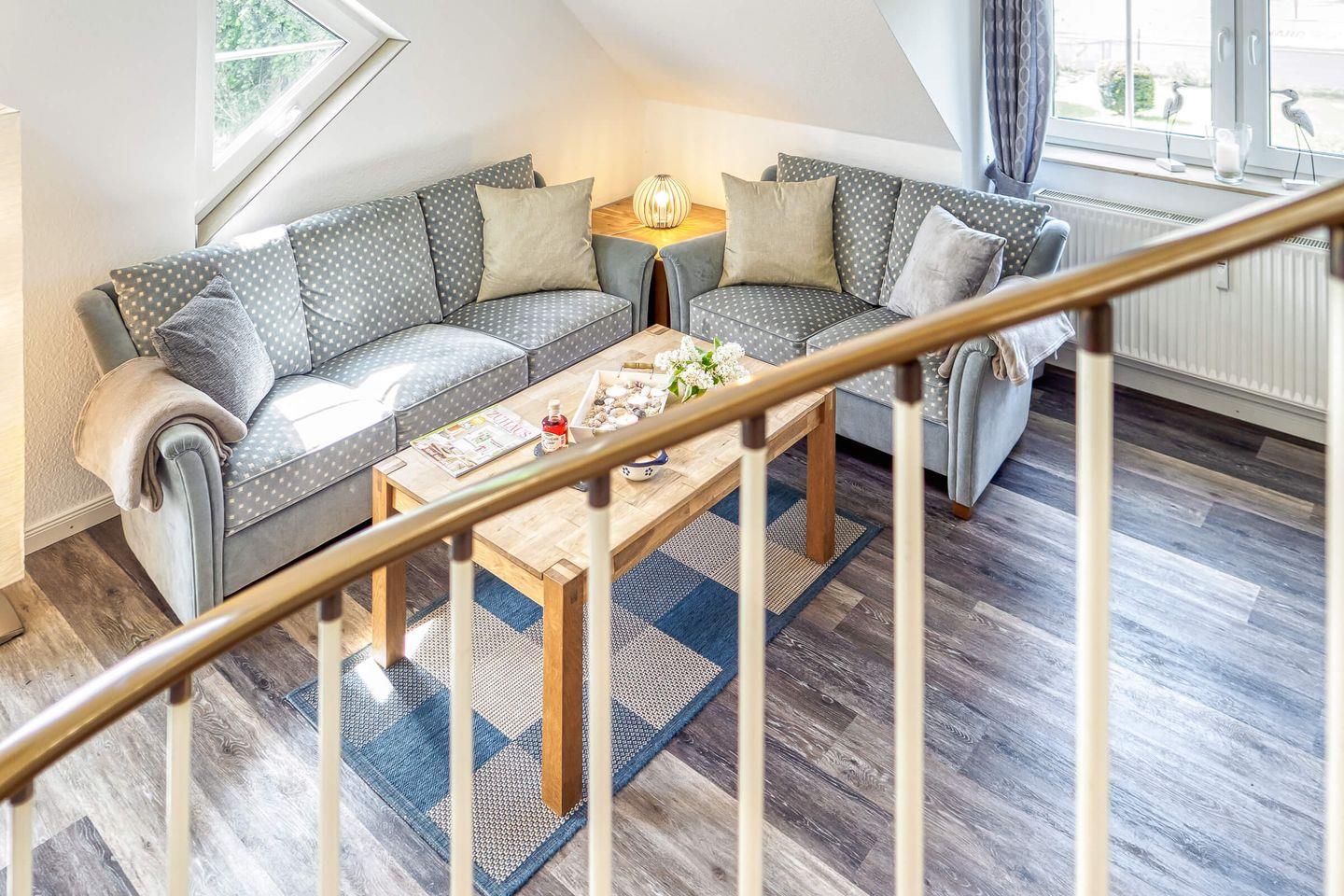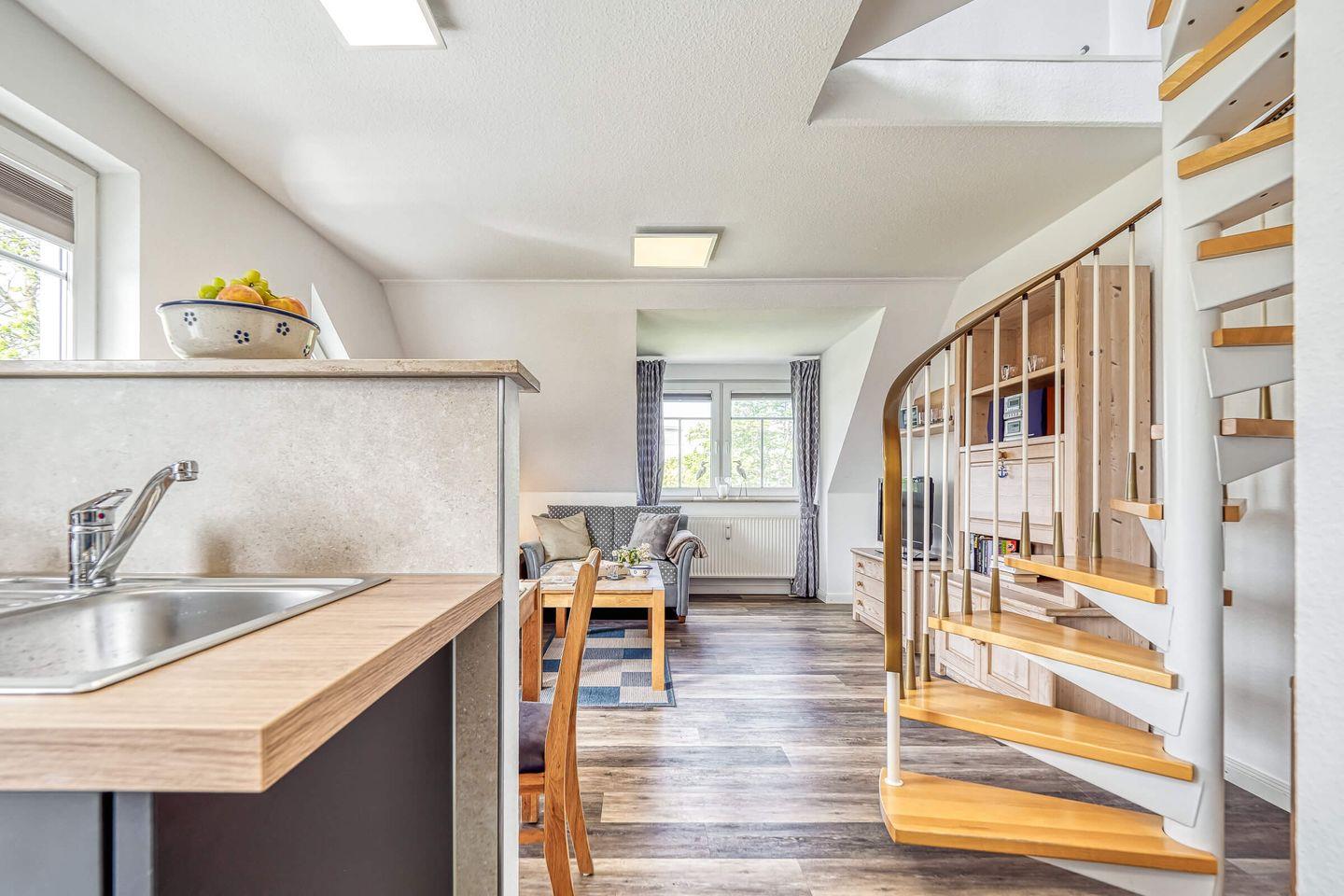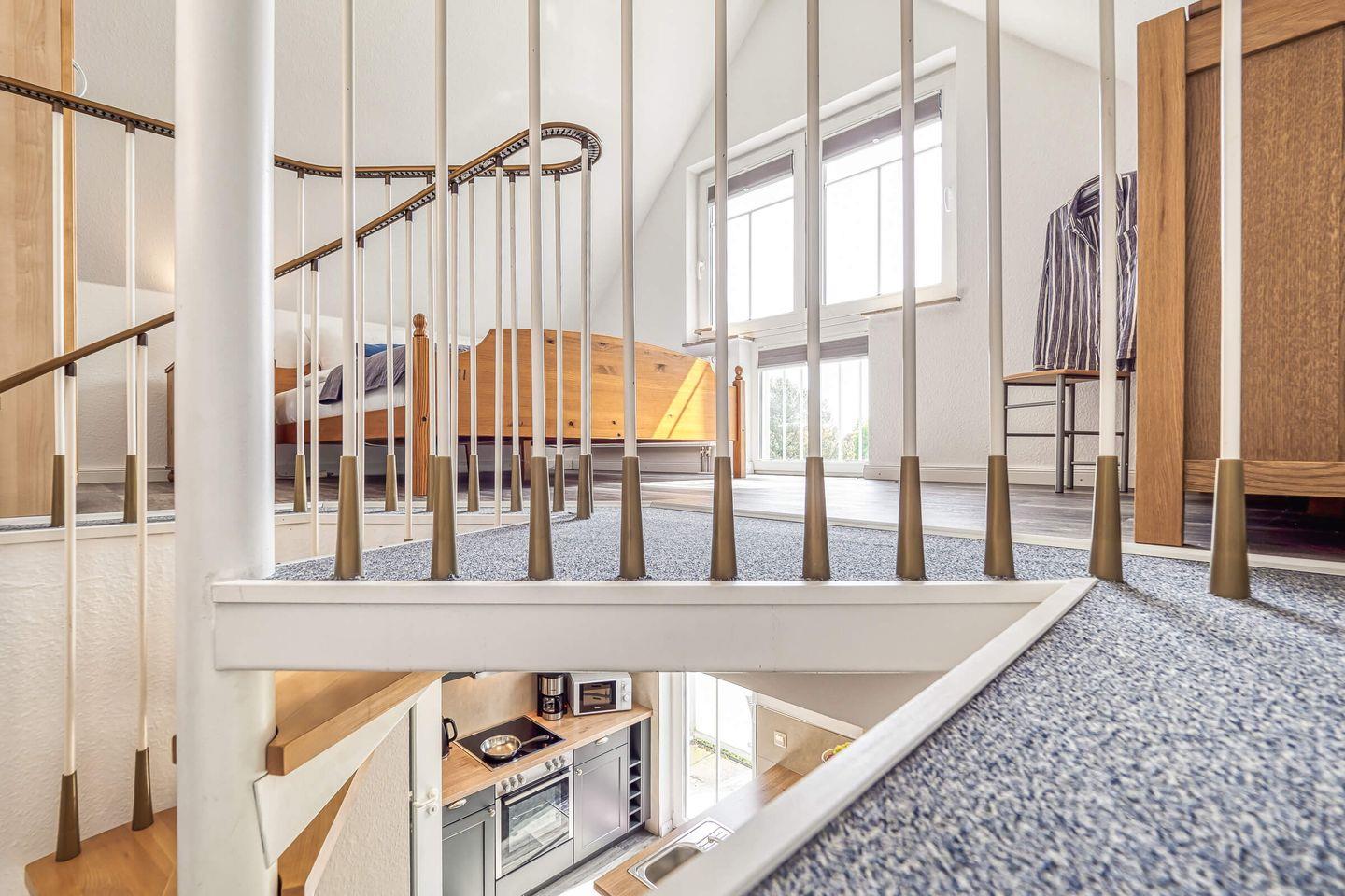 In ruhiger, zentraler Lage erwartet Sie diese gemütliche und liebevoll eingerichtete 55 qm große Maisonettewohnung mit West-Terrasse. Maximal 4 Erwachsene und ein Baby können in der Wohnung erholsame Urlaubstage verbringen. Über den Eingangsbereich mit Garderobe gelangen Sie in den hellen Wohnbereich, das Schlafzimmer mit einem großen Doppelbett und dem Gäste-WC. Über die geschwungene Treppe gelangen Sie in die zweite Etage. Dort befindet sich der zweite Schlafbereich mit Doppelbett und anliegendem Badezimmer. Das Tageslichtbad ist mit einer Dusche, einem Waschtisch mit Spiegelschrank und WC ausgestattet. Der lichtdurchflutete Wohnbereich unterteilt sich in die offene Küche, Essecke und einen großzügigen Sitzbereich, der zum Verweilen einlädt. Den Zugang zum ruhig gelegenen Balkon lädt zum Verweilen ein. Ein eigener PKW-Stellplatz direkt vor der Haustür, ein Schuppen zum Abstellen Ihrer mitgebrachten Fahrräder, Fliegengitter und kostenloses WLAN runden das Angebot ab. Eine weitere Annehmlichkeit sind der Bäcker, Metzger und Einkaufmarkt in unmittelbarer Nähe zur Wohnung.