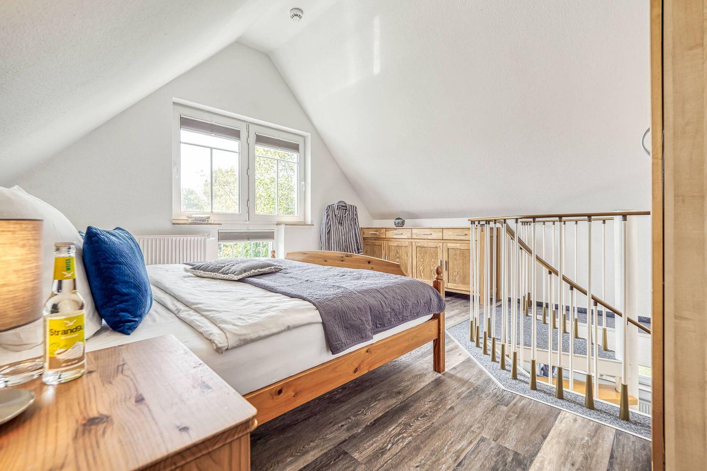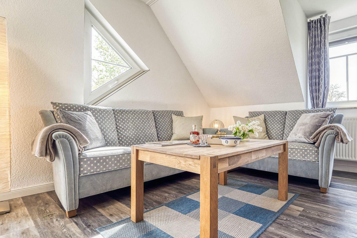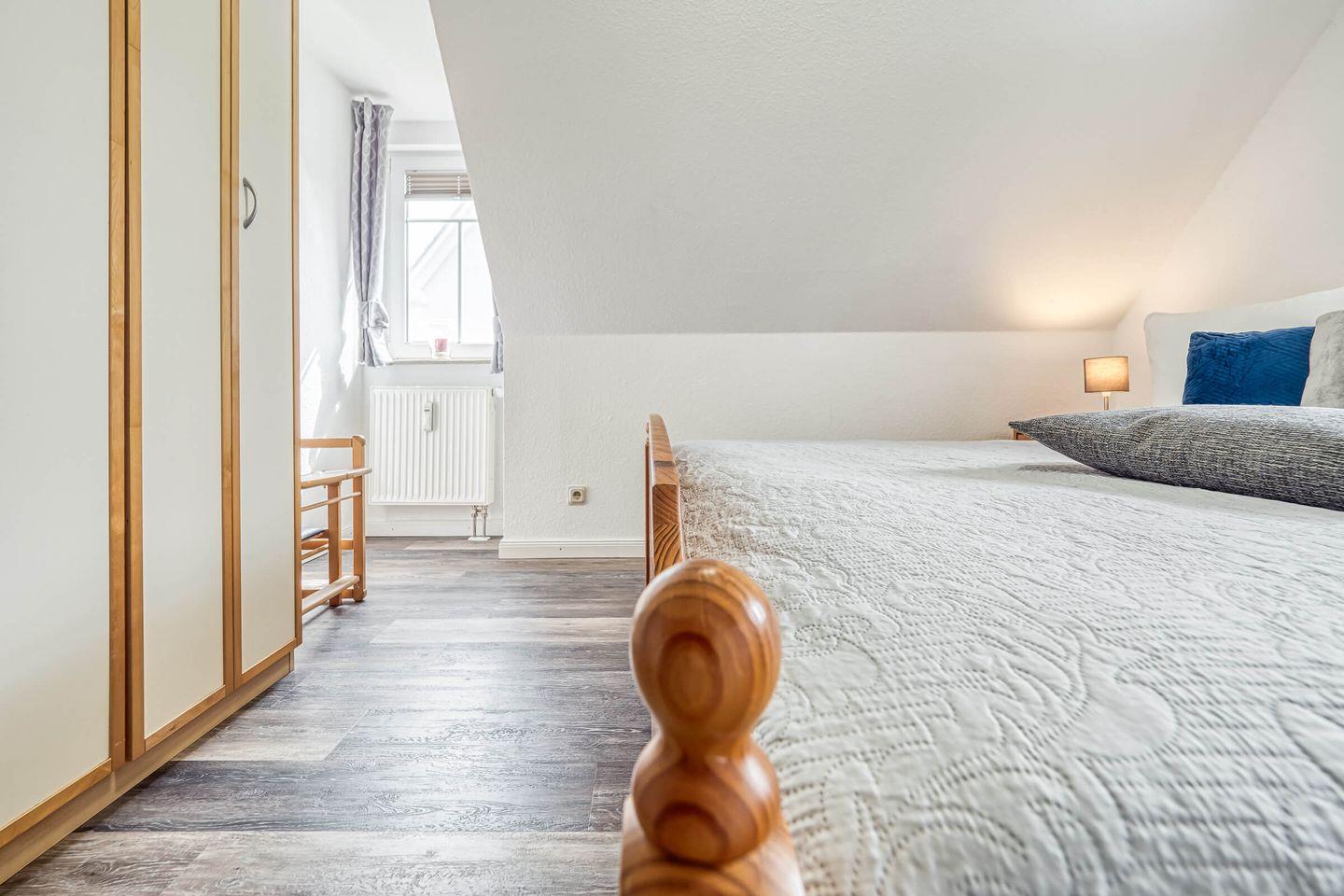 In ruhiger, zentraler Lage erwartet Sie diese gemütliche und liebevoll eingerichtete 55 qm große Maisonettewohnung mit West-Terrasse. Maximal 4 Erwachsene und ein Baby können in der Wohnung erholsame Urlaubstage verbringen. Über den Eingangsbereich mit Garderobe gelangen Sie in den hellen Wohnbereich, das Schlafzimmer mit einem großen Doppelbett und dem Gäste-WC. Über die geschwungene Treppe gelangen Sie in die zweite Etage. Dort befindet sich der zweite Schlafbereich mit Doppelbett und anliegendem Badezimmer. Das Tageslichtbad ist mit einer Dusche, einem Waschtisch mit Spiegelschrank und WC ausgestattet. Der lichtdurchflutete Wohnbereich unterteilt sich in die offene Küche, Essecke und einen großzügigen Sitzbereich, der zum Verweilen einlädt. Den Zugang zum ruhig gelegenen Balkon lädt zum Verweilen ein. Ein eigener PKW-Stellplatz direkt vor der Haustür, ein Schuppen zum Abstellen Ihrer mitgebrachten Fahrräder, Fliegengitter und kostenloses WLAN runden das Angebot ab. Eine weitere Annehmlichkeit sind der Bäcker, Metzger und Einkaufmarkt in unmittelbarer Nähe zur Wohnung.