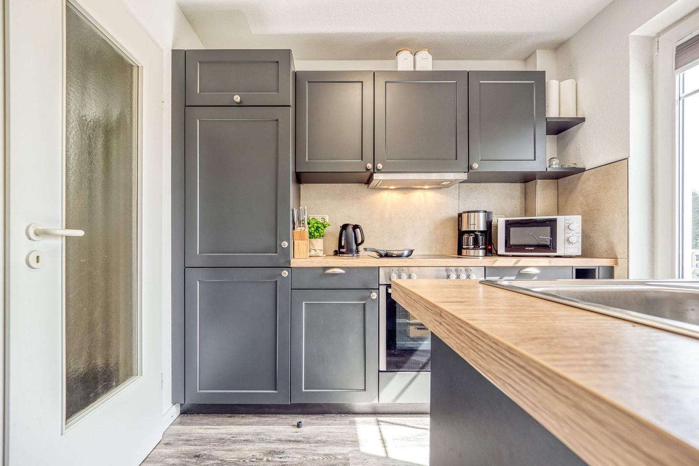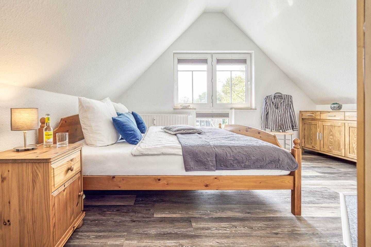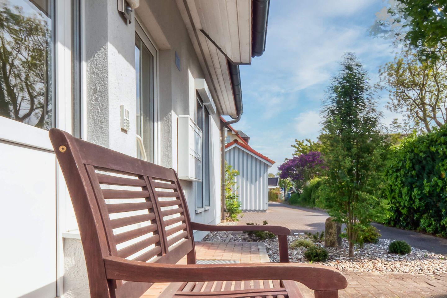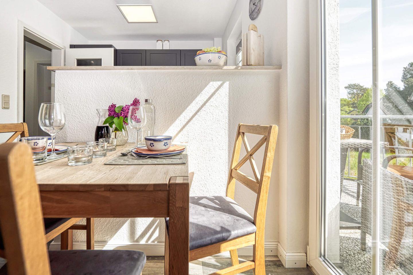 In ruhiger, zentraler Lage erwartet Sie diese gemütliche und liebevoll eingerichtete 55 qm große Maisonettewohnung mit West-Terrasse. Maximal 4 Erwachsene und ein Baby können in der Wohnung erholsame Urlaubstage verbringen. Über den Eingangsbereich mit Garderobe gelangen Sie in den hellen Wohnbereich, das Schlafzimmer mit einem großen Doppelbett und dem Gäste-WC. Über die geschwungene Treppe gelangen Sie in die zweite Etage. Dort befindet sich der zweite Schlafbereich mit Doppelbett und anliegendem Badezimmer. Das Tageslichtbad ist mit einer Dusche, einem Waschtisch mit Spiegelschrank und WC ausgestattet. Der lichtdurchflutete Wohnbereich unterteilt sich in die offene Küche, Essecke und einen großzügigen Sitzbereich, der zum Verweilen einlädt. Den Zugang zum ruhig gelegenen Balkon lädt zum Verweilen ein. Ein eigener PKW-Stellplatz direkt vor der Haustür, ein Schuppen zum Abstellen Ihrer mitgebrachten Fahrräder, Fliegengitter und kostenloses WLAN runden das Angebot ab. Eine weitere Annehmlichkeit sind der Bäcker, Metzger und Einkaufmarkt in unmittelbarer Nähe zur Wohnung.