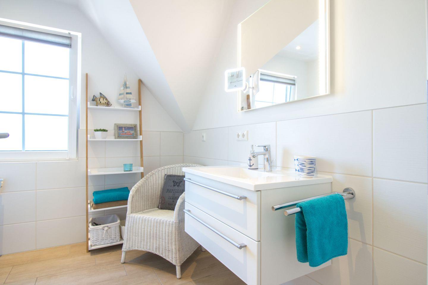 Das Badezimmer ist mit einer bodengleichen Dusche ausgestattet und verfügt über ein Waschbecken, WC, Haartrockner sowie einen Spiegel.