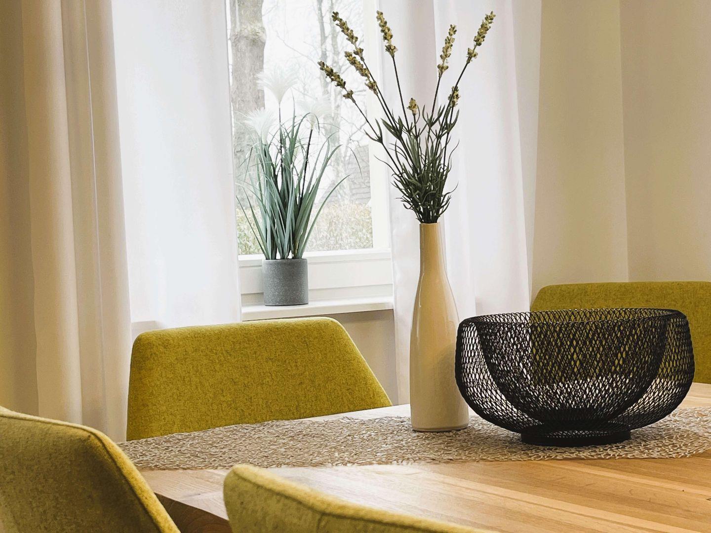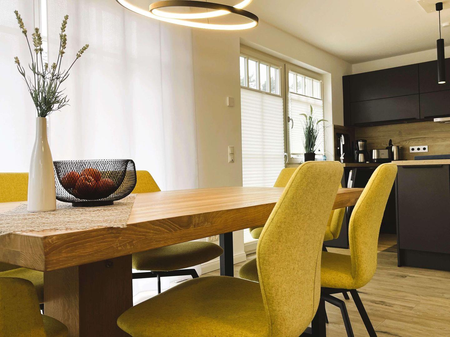So finden Sie in Ihrem Feriendomizil einen großzügigen Wohn-/Essbereich. Dieser besticht durch bodentiefe Fenster und einen Holzesstisch, an dem die ganze Familie Platz findet. Die angrenzende, moderne und hochwertig ausgestattete Küche hat alles, was das Herz jedes Hobbykoches höher schlagen lässt. Kaffeeliebhaber werden darauf hingewiesen, die Kapseln für die vorhandene Nespressomaschine mitzubringen.