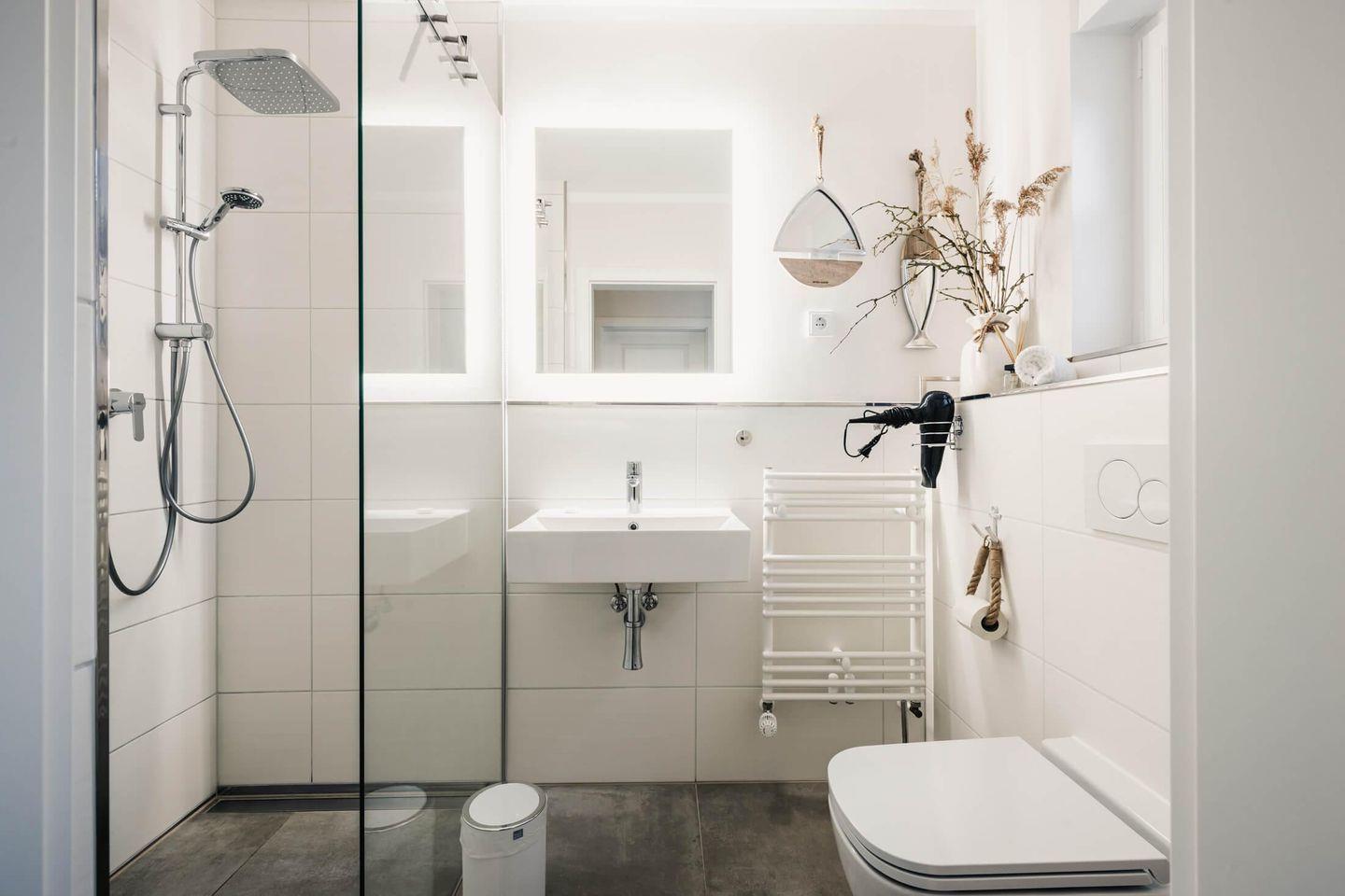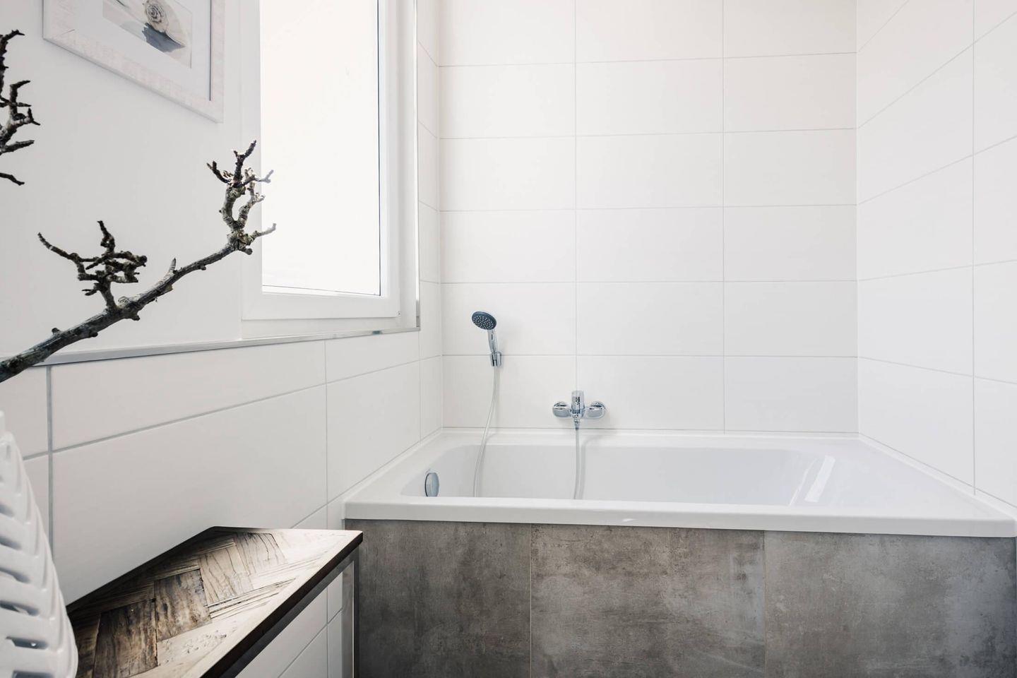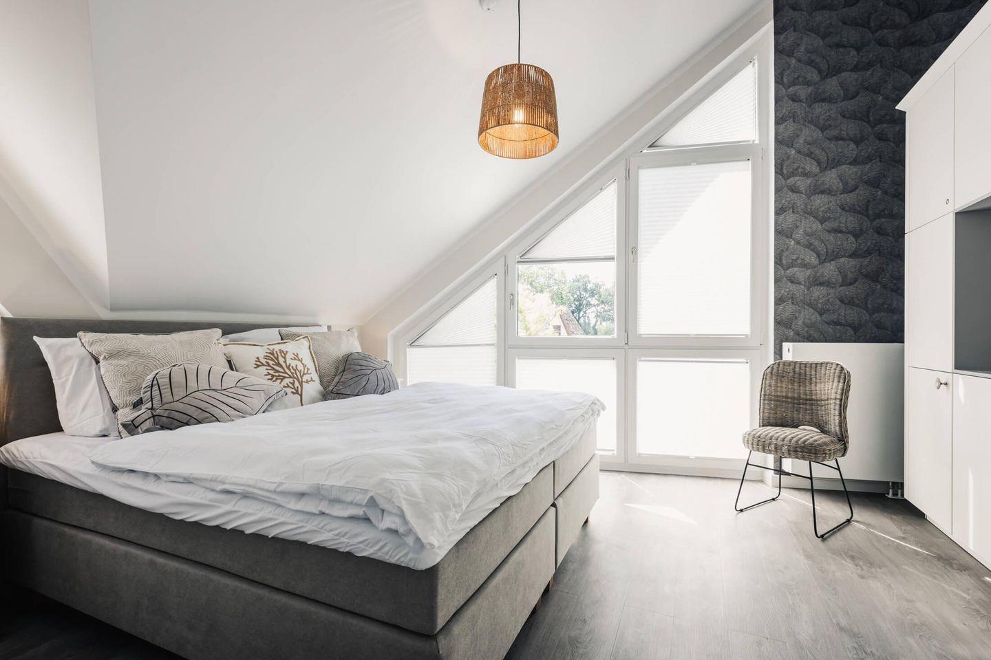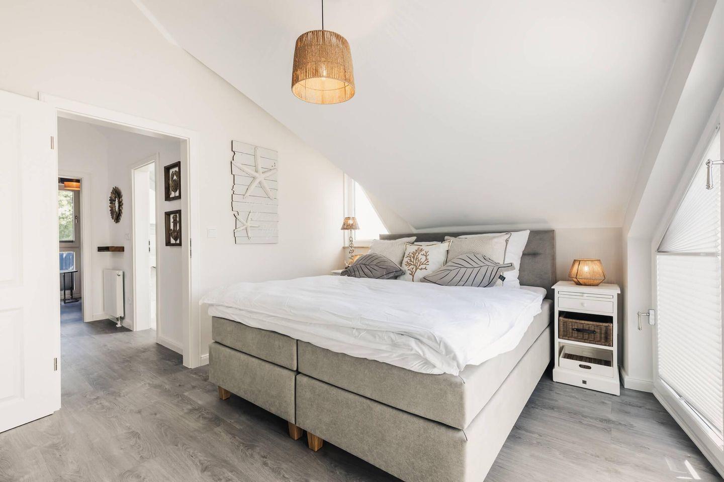 Im Obergeschoss finden Sie ein modernes ansprechendes Wannenbad vor. In beiden Schlafräumen laden komfortable Boxspringbetten zum erholsamen Schlaf ein. Sie finden neues Mobiliar sowie elegante und zugleich maritime Accessoires vor. Weitere zwei bequeme Schlafplätze bietet die hochwertige Schlafcouch im Wohnbereich.