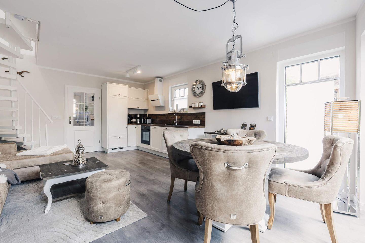 Im Erdgeschoss erwartet Sie ein kommunikativer und gemütlicher Wohn-Essbereich. Die hochwertige vollständig ausgestattete Landhausküche lässt keine Wünsche offen und eröffnet eine flexible Selbstversorgung. Am Abend sorgt ein Kamin für kuschelige Atmosphäre.