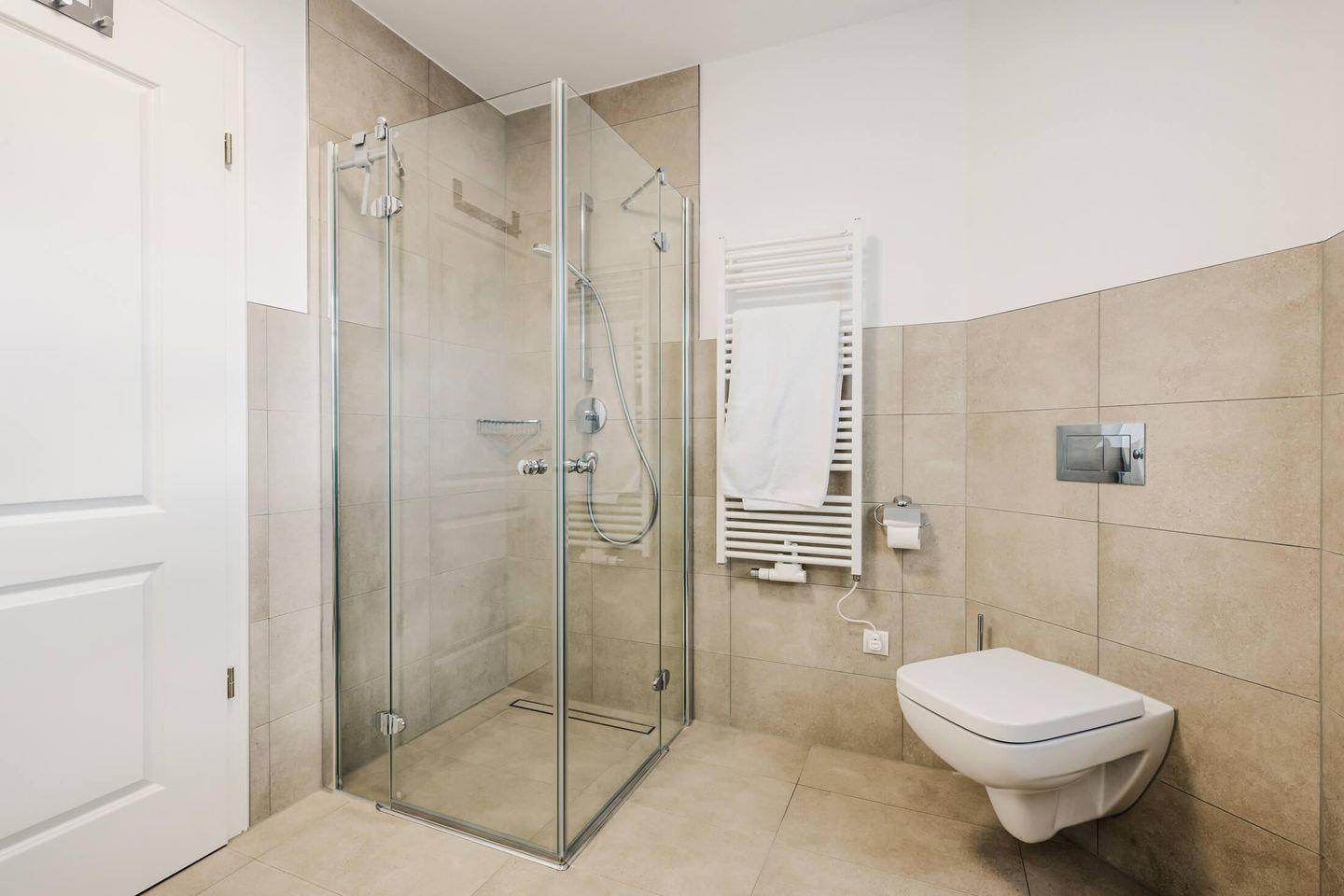 Das moderne Design der Wohnung setzt sich im Tageslichtbad mit bodentiefer Dusche fort. Wie in der gesamten Wohnung genießen Sie auch hier den Komfort der Fußbodenheizung.