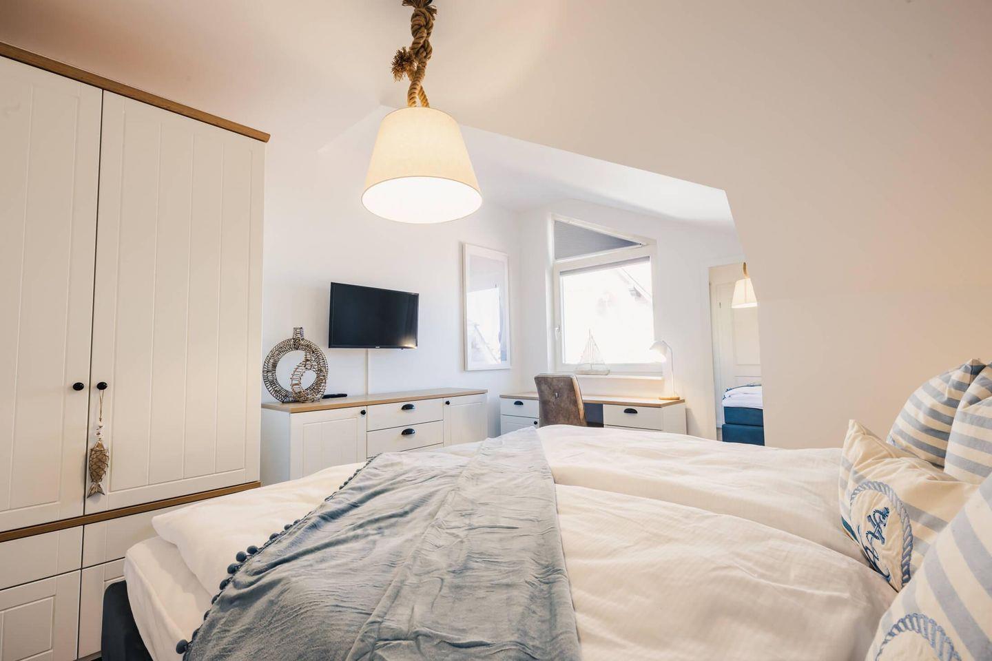 Sie möchten Urlaub und Homeoffice verbinden? Kein Problem, in einem Schlafzimmer steht ein Schreibtisch für Sie bereit.