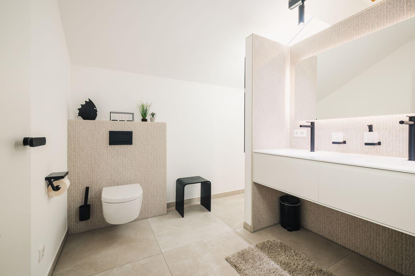 Zwei moderne Badezimmer mit bodengleichen Walk-in-Duschen sorgen für einen