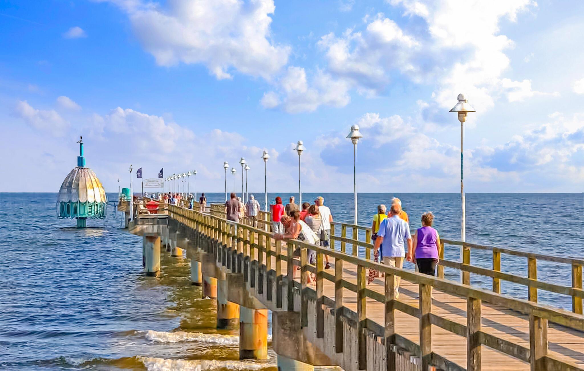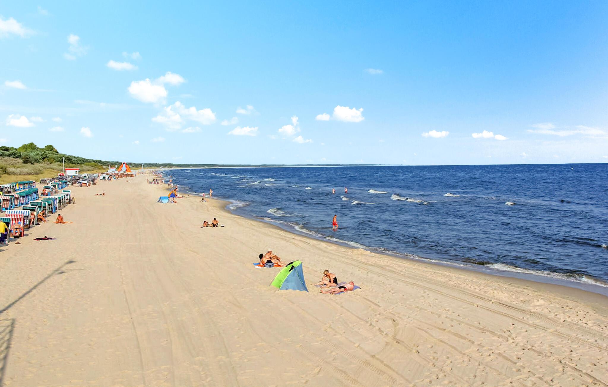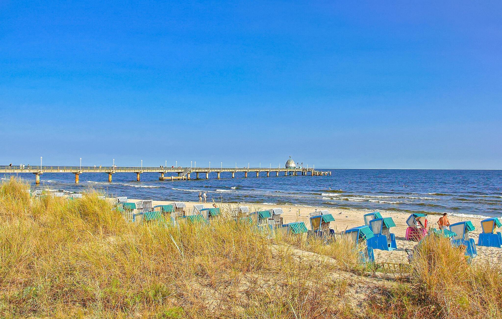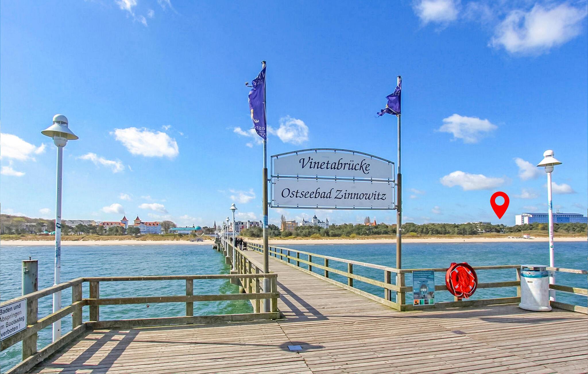 Det 125 kvm store feriehus til maks. 7 personer ligger separat på en 1000 kvm fritidsejendom i et roligt boligområde, kun 750 m fra Østersøstranden. Der er tre andre sommerhuse på ejendommen. Huset er moderniseret i 2019 og er udstyret med en stue (polstrede møbler, fladskærms-tv), et komplet køkken (elkomfur med ovn, køleskab med fryser, opvaskemaskine, mikroovn, spisebord, diverse køkkenmaskiner), 3 soveværelser (2 x dobbeltseng, TV, 1 x dobbeltseng, 1 enkeltseng, TV) og 2 badeværelser (1 x brus/toilet, 1 x med badekar) og vinterhave med opholdsområde. En barneseng og en høj stol er til rådighed for små børn. Udenfor er der overdækket terrasse, grill, opbevaringsplads til cykler og parkeringsplads. Den samlede pris inkluderer slutrengøring samt vand- og energiforbrug. Du kan medbringe dit eget sengelinned og håndklæder eller leje dem. Østersøferiestedet Zinnowitz er underlagt turistskat. Østersøferiestedet Zinnowitz med sin brede sandstrand og dens promenade fyldt med smukke villaer er en af de smukkeste badebyer på øen Usedom. Talrige restauranter, indkøbsmuligheder, en surf- og sejlerskole, et veludbygget netværk af cykelstier samt tennisbaner og et termisk spa giver mulighed for en varieret ferie. Spa-/kulturprogrammer finder sted regelmæssigt om sommeren. Højdepunktet er Vineta Festivalen, som opføres på friluftsscenen hele sommeren. Stedet har også en 300 m lang mole med dykkergondol. Herfra kan du tage bådture til andre badebyer så langt som til Polen.