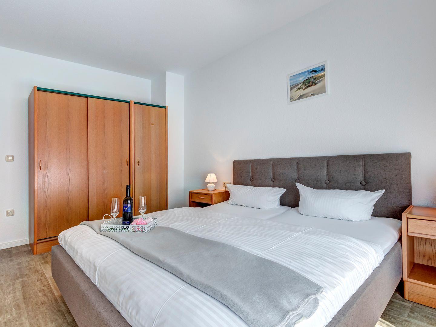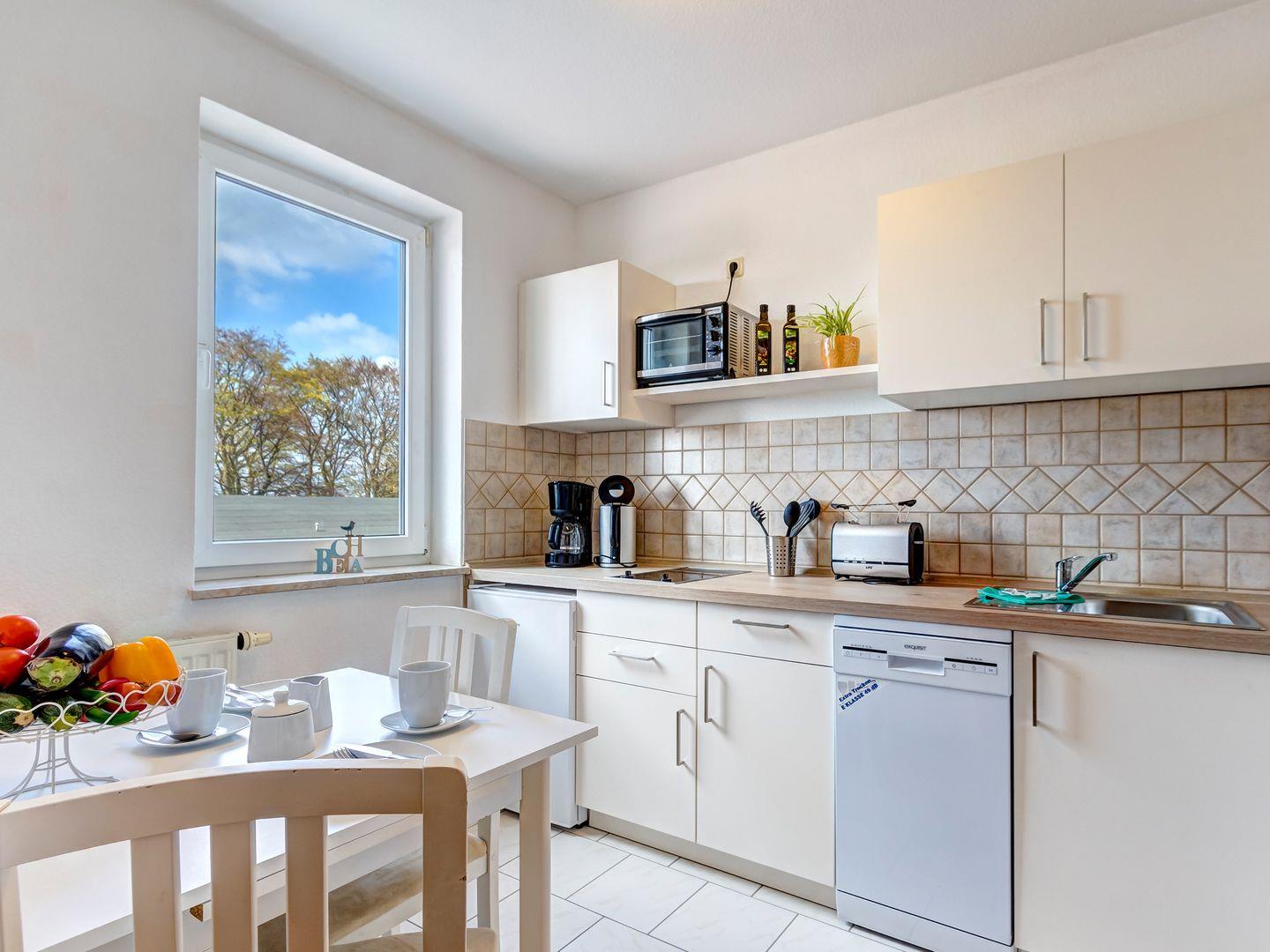 Unsere 60 qm große 2-Zimmer-Wohnung vereint durchdachtes Design mit einer behaglichen Atmosphäre. Das helle Wohnzimmer öffnet sich zu einer sonnigen Terrasse mit Gartenmöbeln, auf der Sie die frische Meeresluft genießen und zur Ruhe kommen können. Die voll ausgestattete Küche ermöglicht Ihnen eine flexible und unkomplizierte Selbstversorgung.