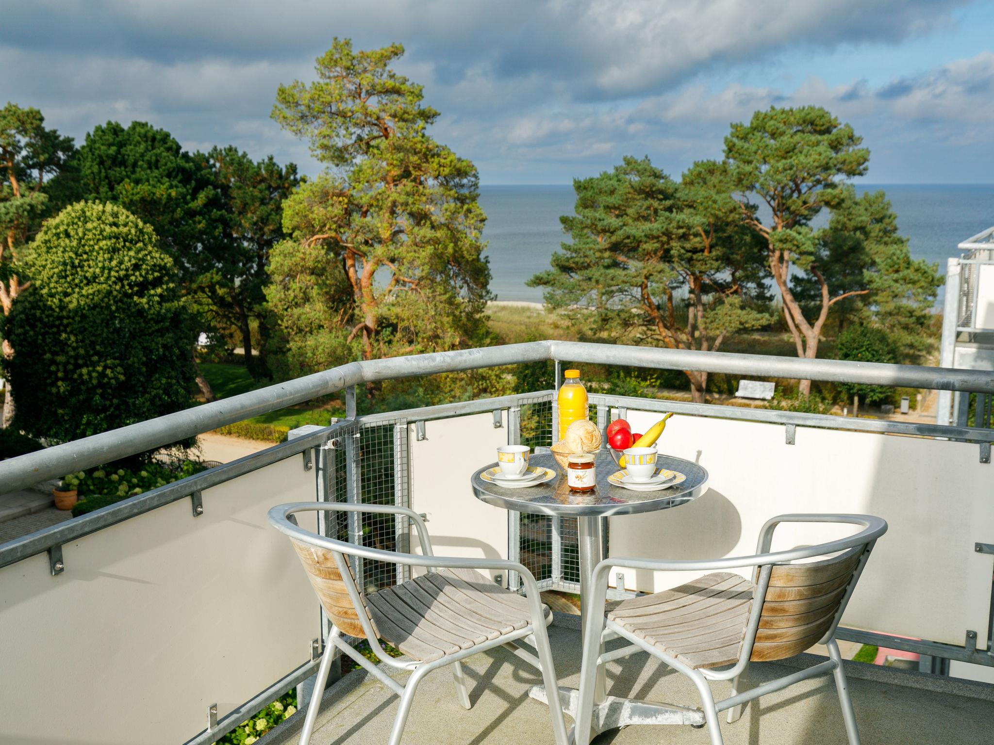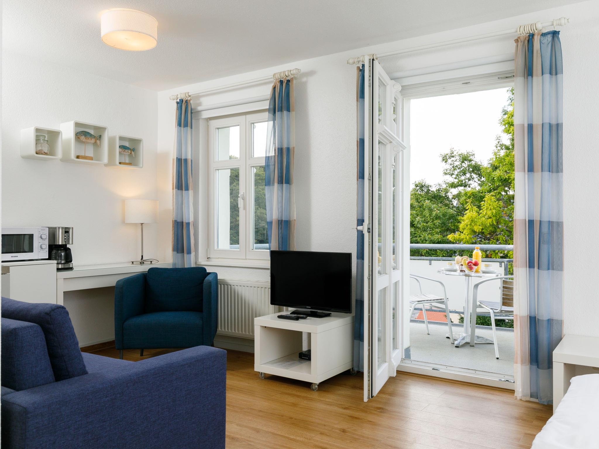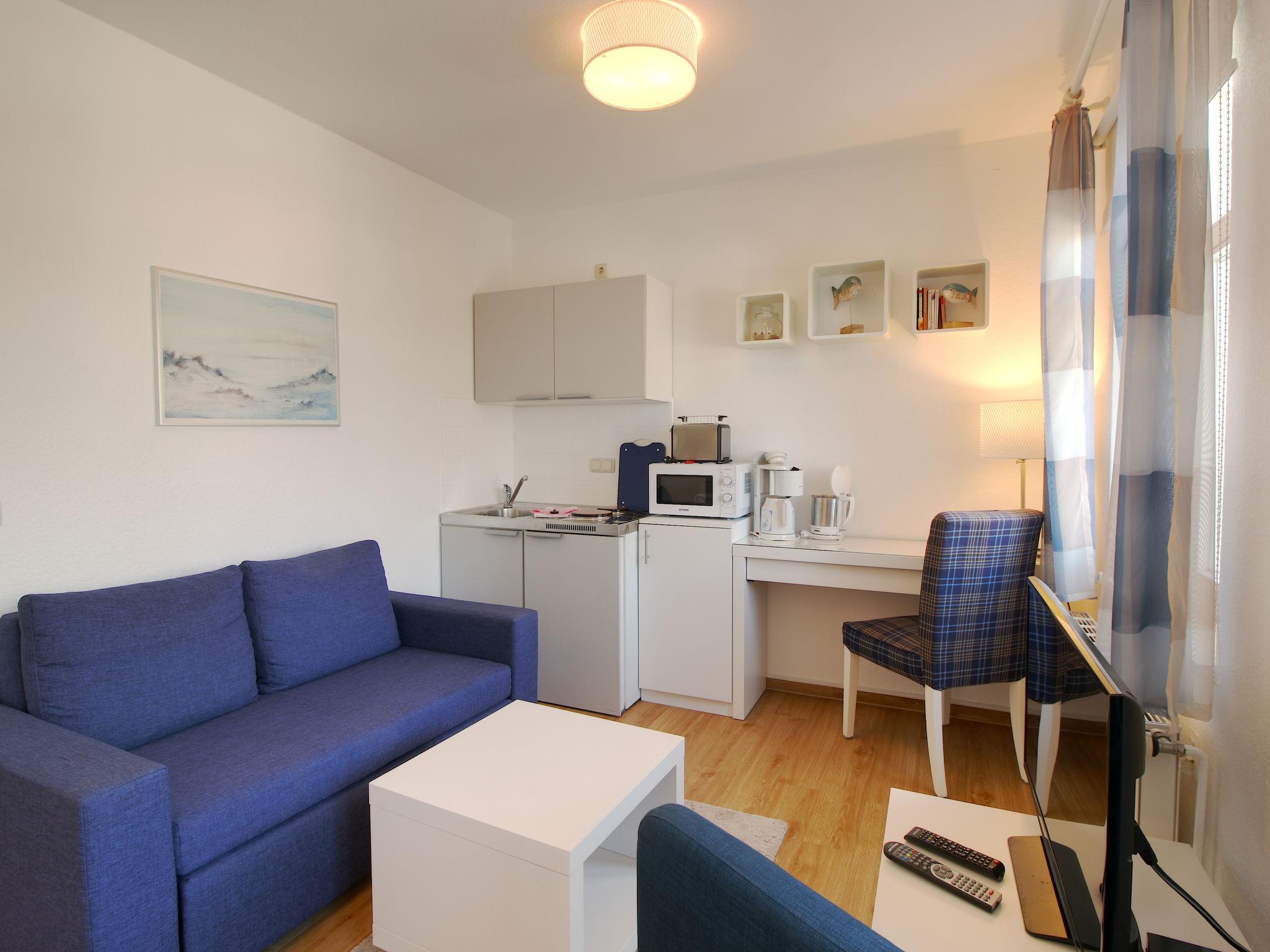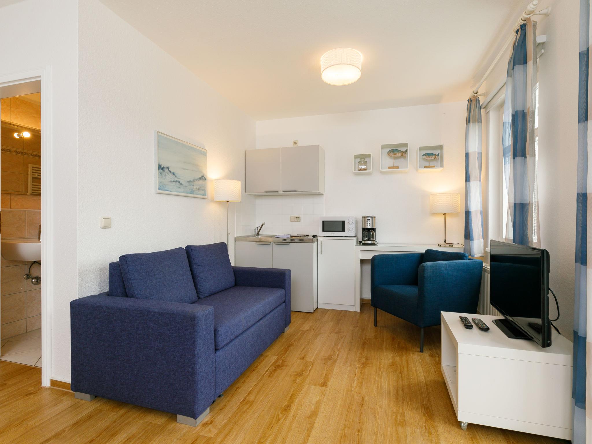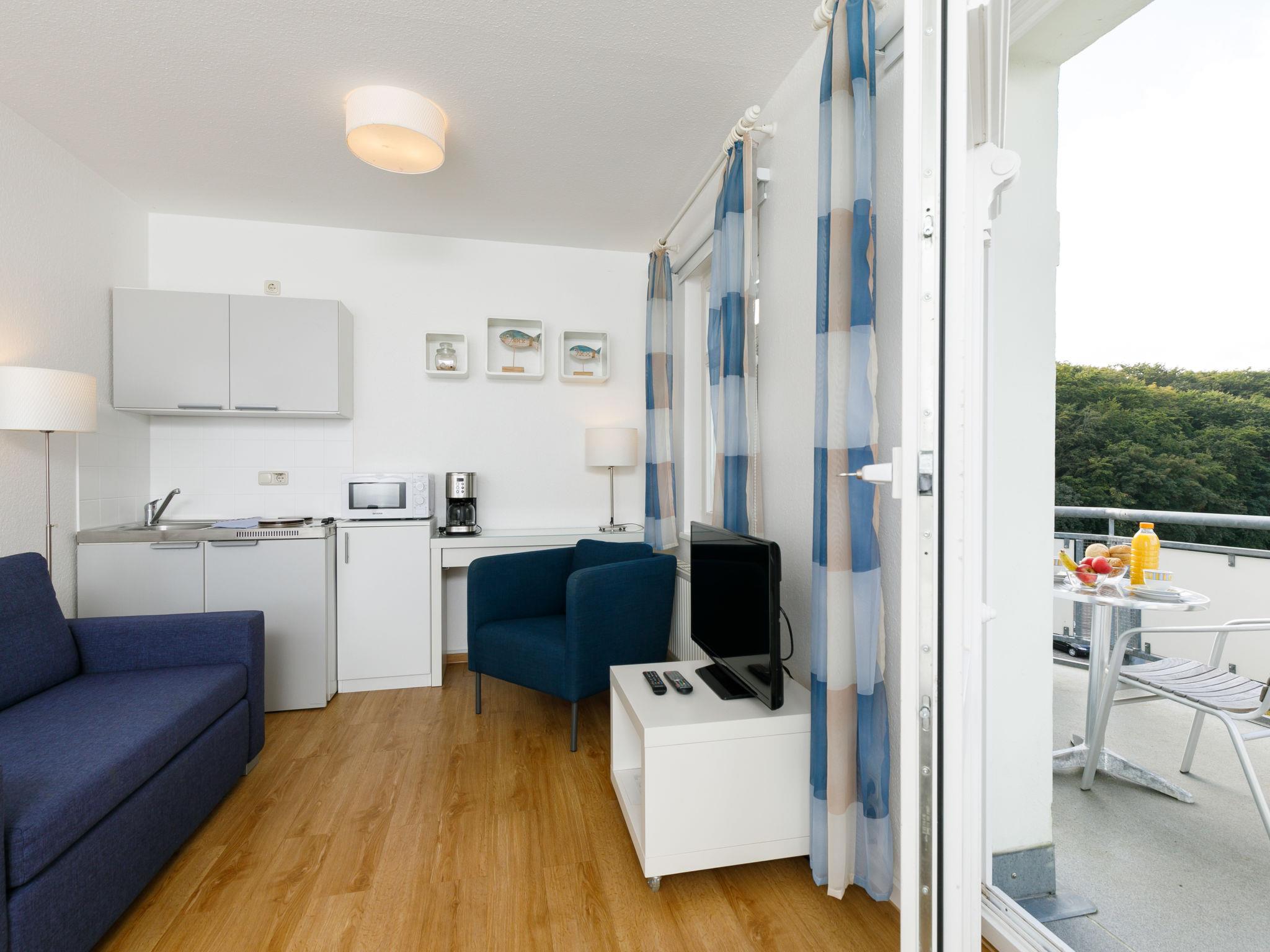 "App.17 Zinnowitzer Hof", 1-room apartment 30 m2 on 3rd floor. Tasteful and cosy furnishings: living/sleeping room with 1 double bed, dining table and cable TV (flat screen). Exit to the balcony. Kitchenette (2 ceramic glass hob hotplates, toaster, kettle, microwave, electric coffee machine). Shower/WC. Balcony. Balcony furniture. Facilities: children's high chair, baby cot, hair dryer. Parking (extra, 1 car). Please note: non-smokers only. Maximum 1 pet/ dog allowed. Smoke alarm. Side sea view from the balcony.