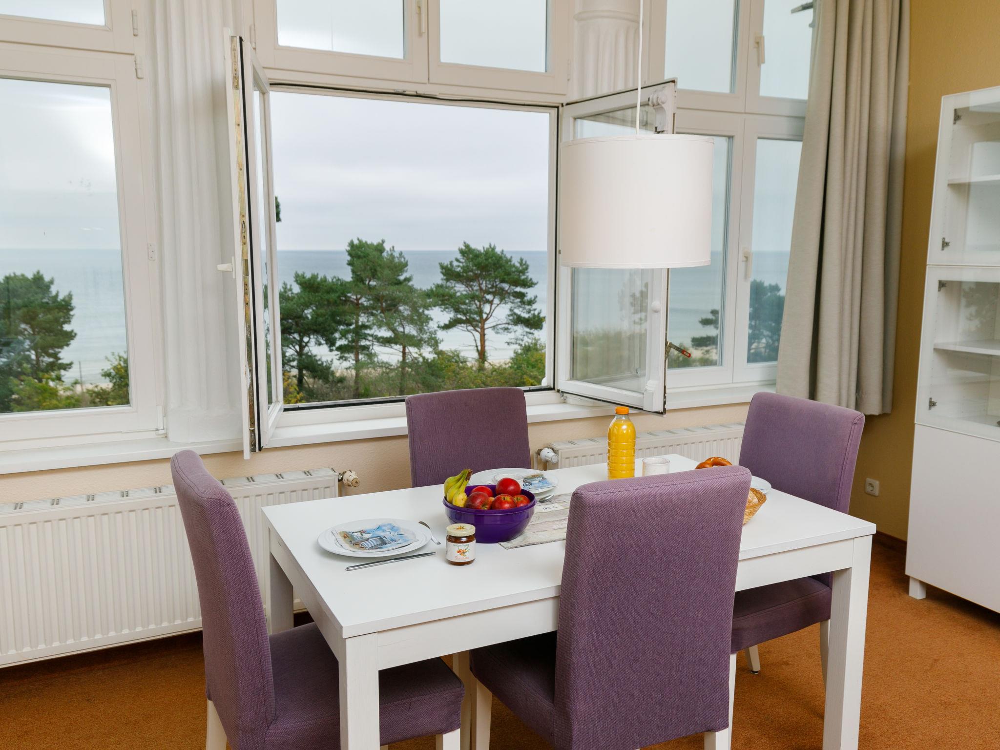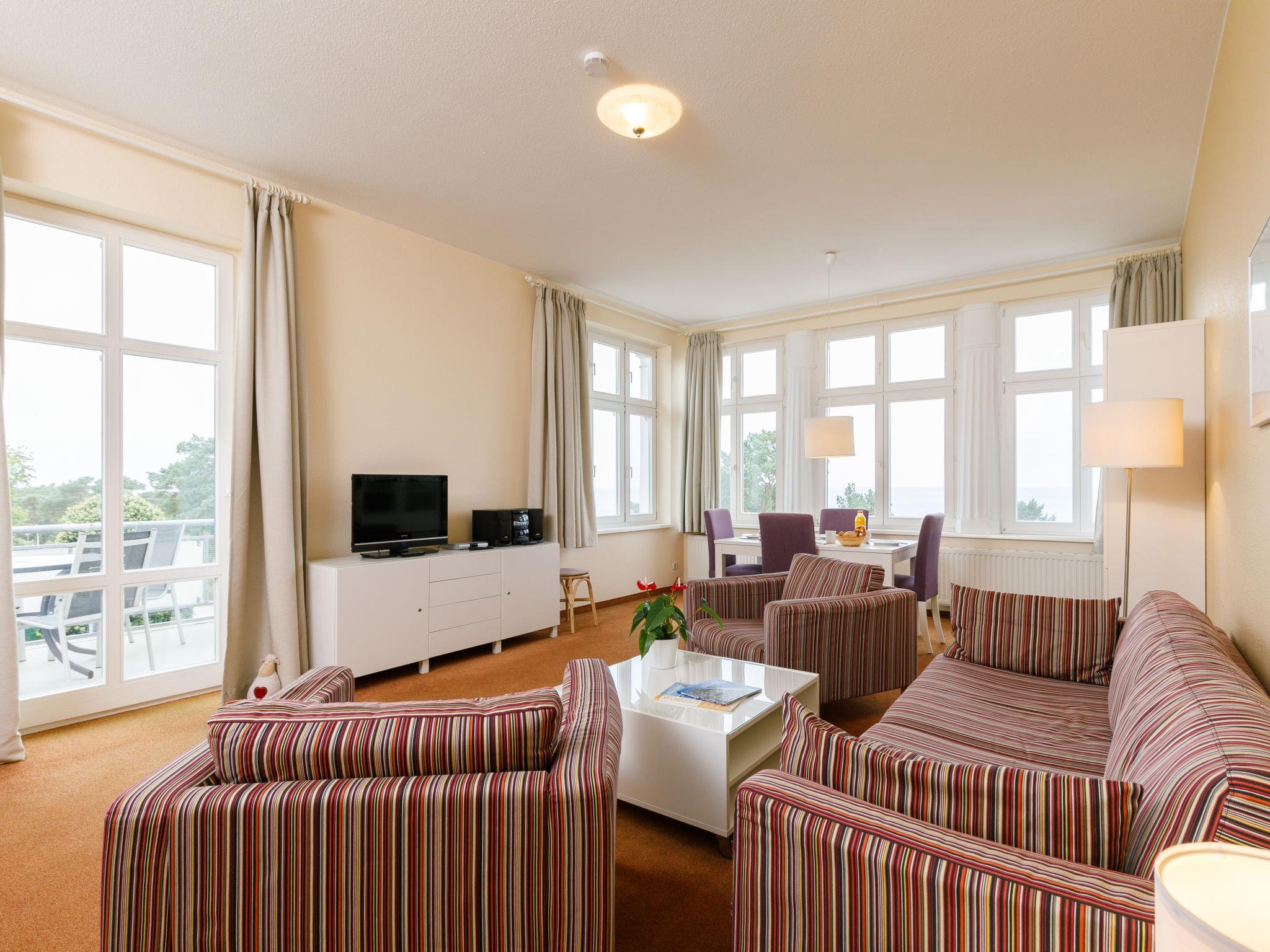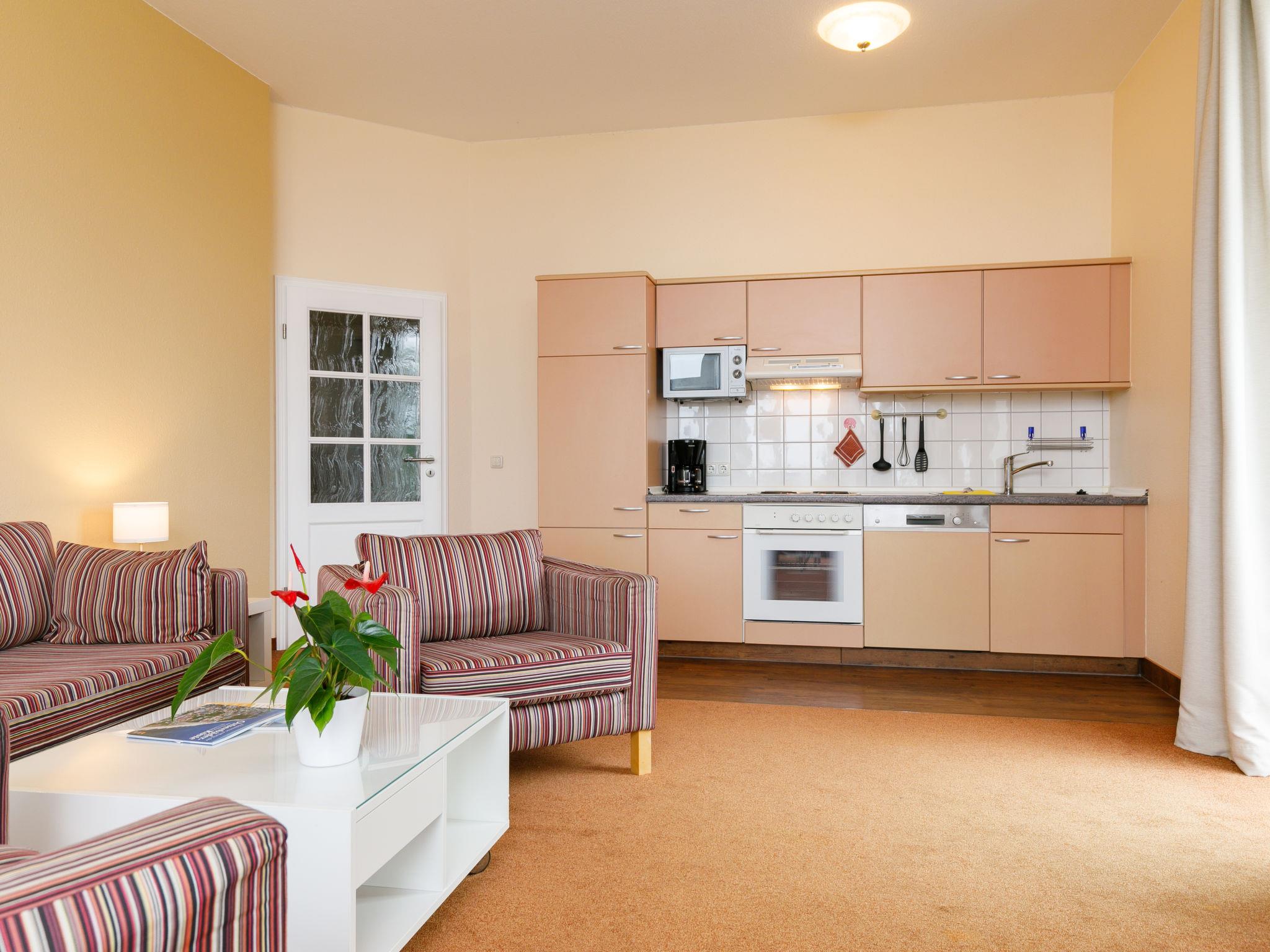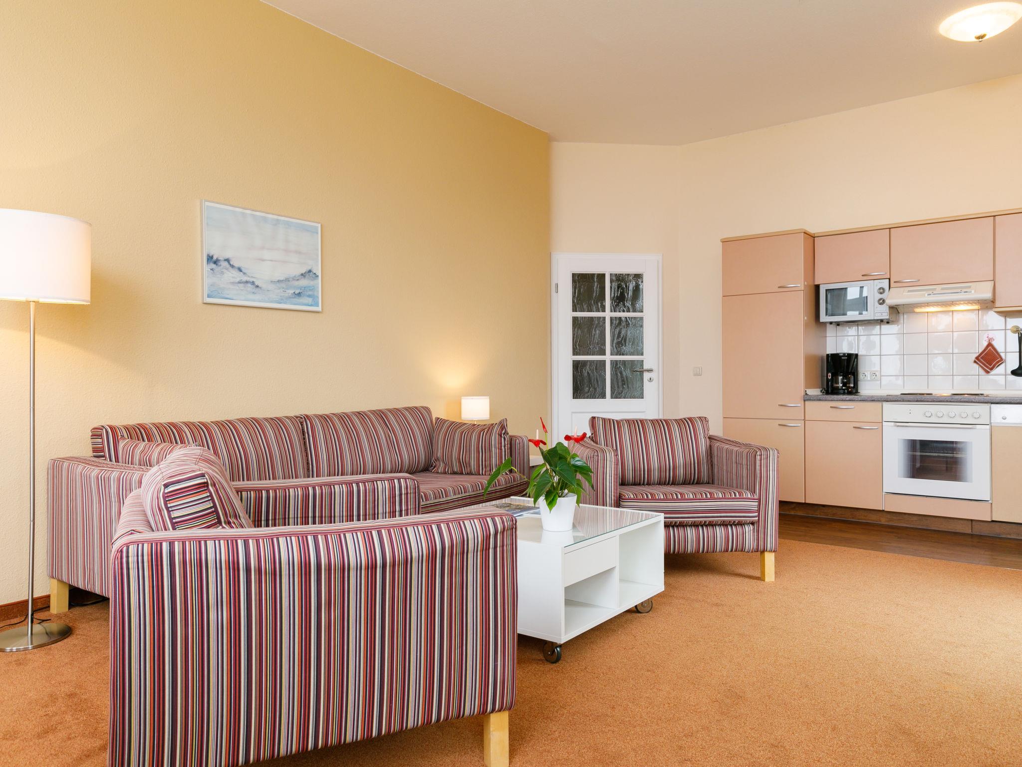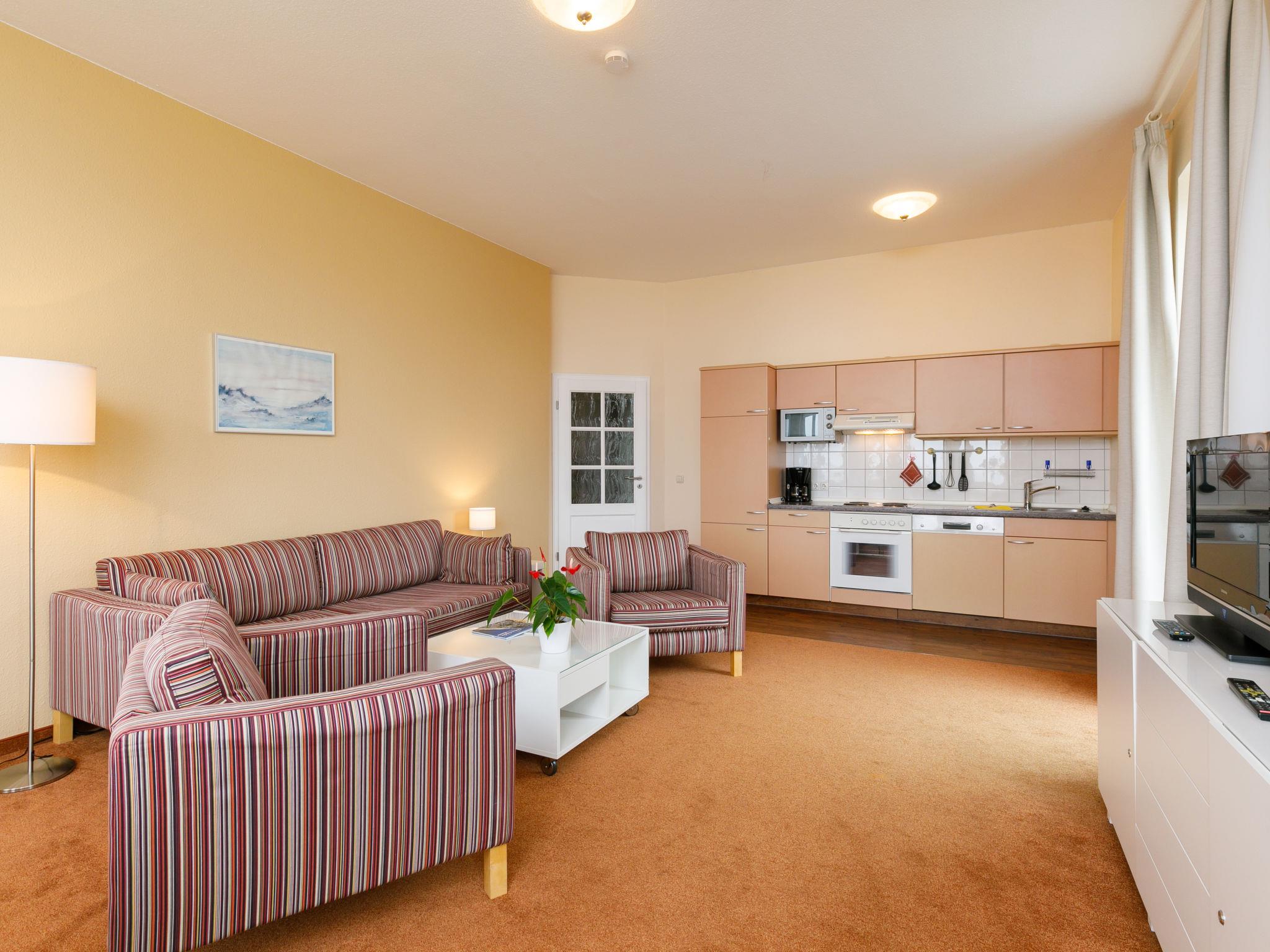 "App.13 Zinnowitzer Hof", 2-room apartment 63 m2 on 3rd floor. Beautiful and cosy furnishings: living/dining room with 1 sofabed and cable TV (flat screen). Exit to the balcony. 1 room with 1 double bed. Kitchenette (4 hot plates, oven, dishwasher, toaster, kettle, microwave, electric coffee machine). Bath/WC. Balcony. Balcony furniture. Beautiful view of the sea. Facilities: children's high chair, baby cot, hair dryer. Parking (extra, 1 car). Please note: non-smokers only. Smoke alarm.