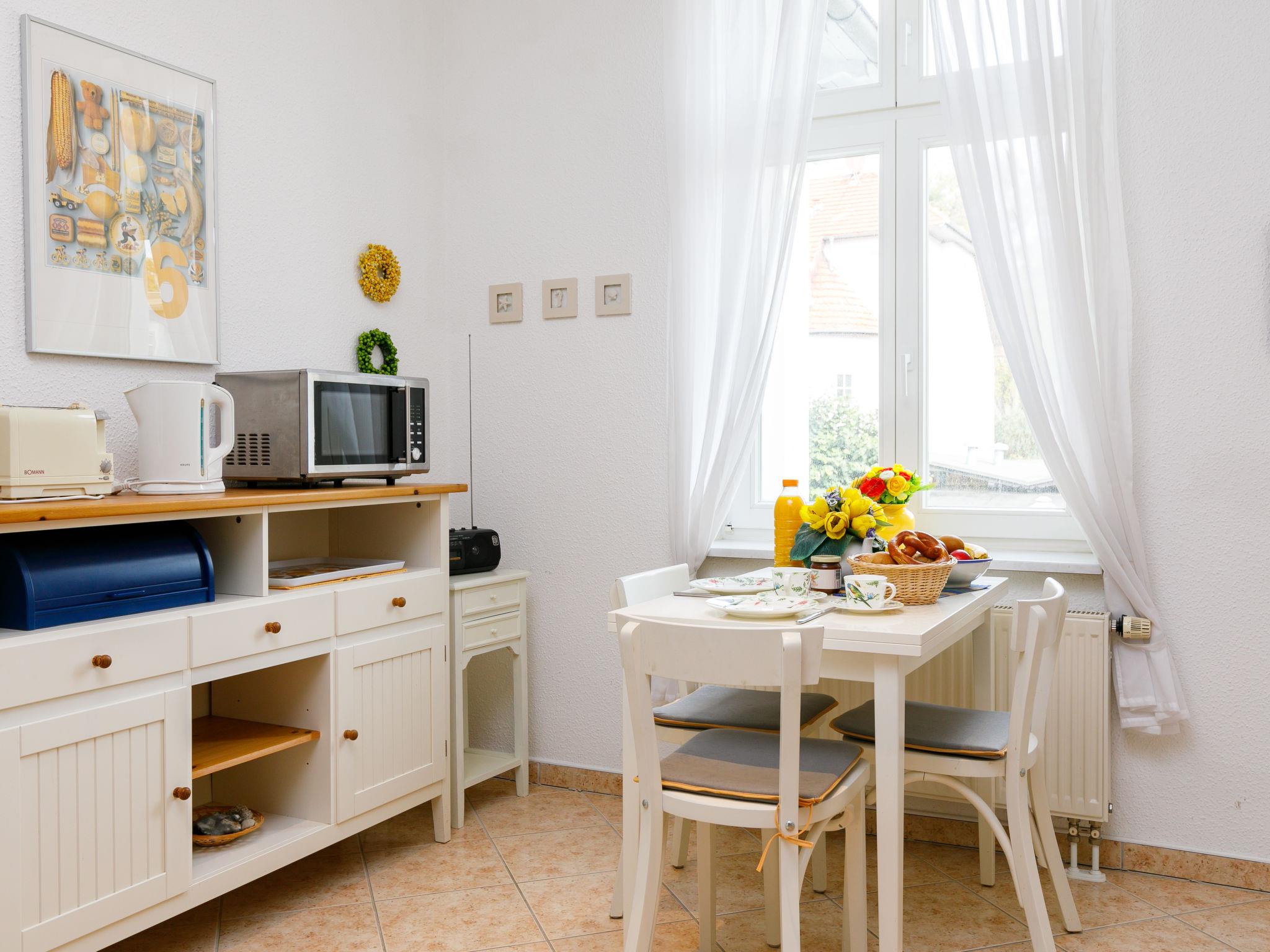 "Famulla-Schulze", 2-room apartment 60 m2, on the upper floor. Cosy furnishings: living room with 1 sofabed and cable TV (flat screen), radio. 1 room with 1 double bed. Kitchen (dishwasher, 4 ceramic glass hob hotplates, toaster, kettle, electric coffee machine) with dining table. Shower/WC. Facilities: children's high chair, baby cot. Internet (WiFi, free). Parking at the house. Please note: non-smokers only. Smoke alarm.