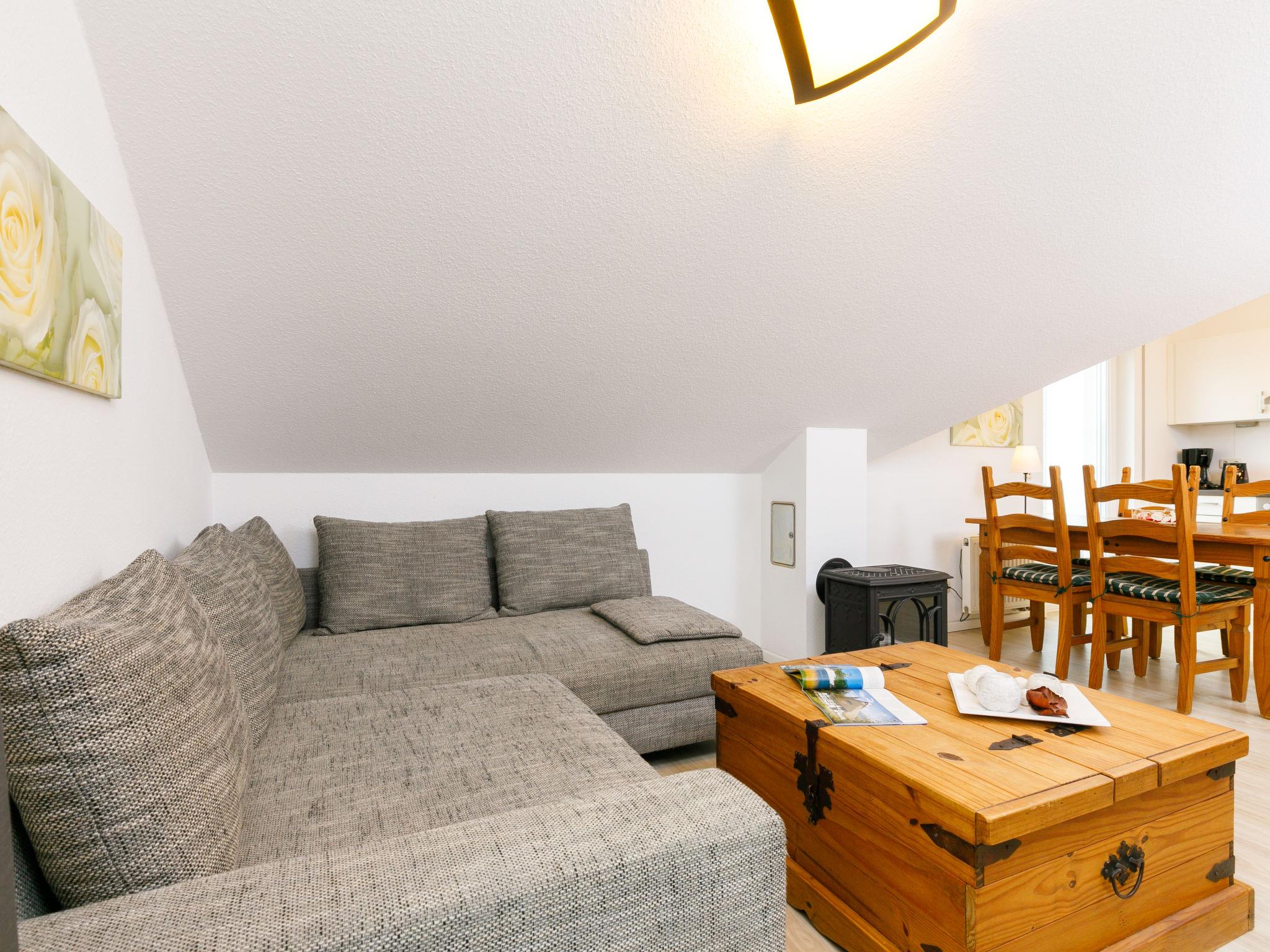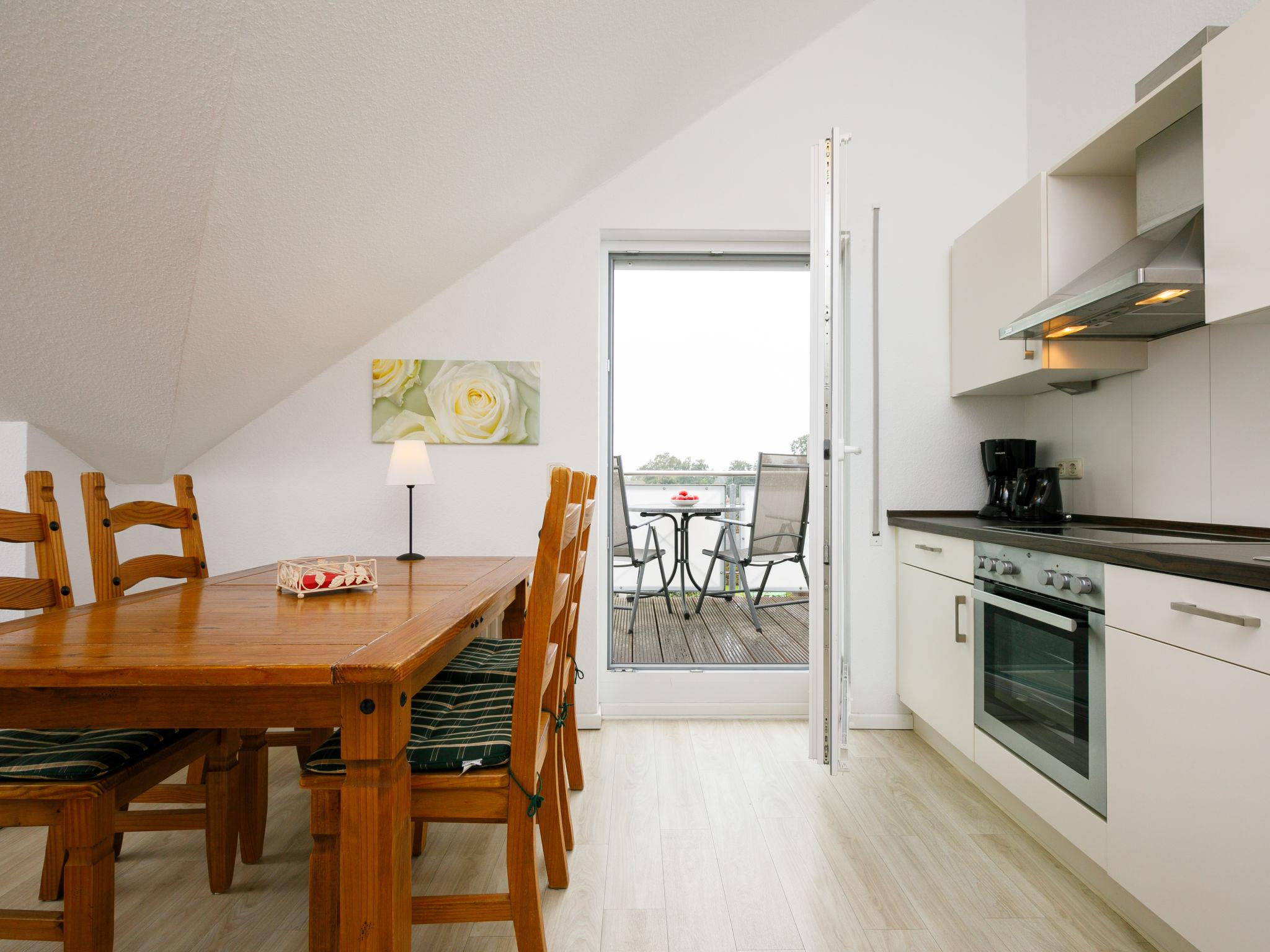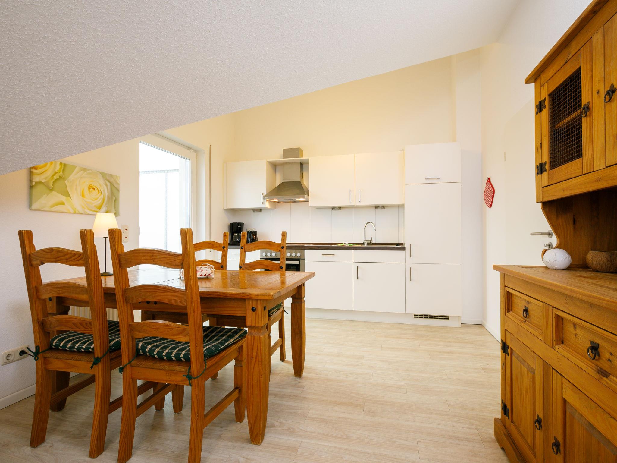 "Rollmops", 2-room apartment 59 m2, on the top floor. With sloping ceilings: living/dining room with cable TV (flat screen), radio. Exit to the balcony. 1 room with 1 double bed. Kitchenette (oven, dishwasher, 4 ceramic glass hob hotplates, toaster, kettle, electric coffee machine). Shower/WC. Balcony. Balcony furniture. Facilities: Internet (WiFi, free). Parking (1 car) at the house. Please note: non-smokers only. Smoke alarm.