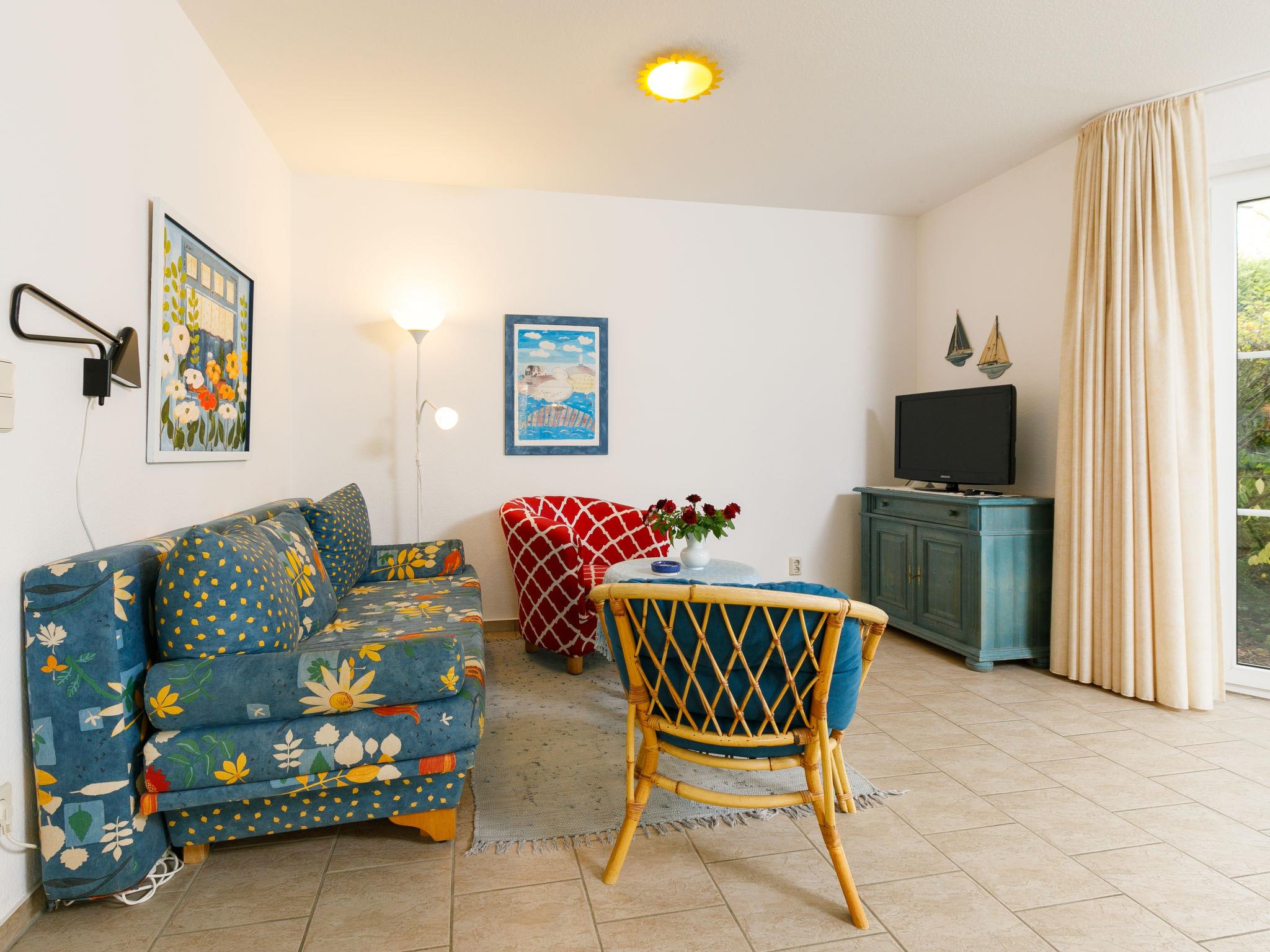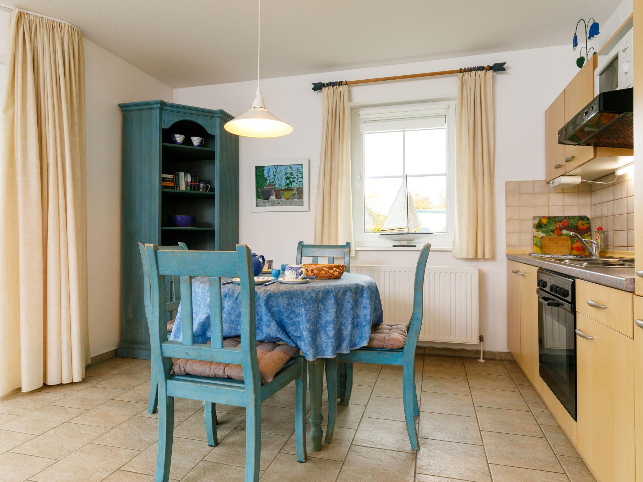 "Eickhus Blaue Wohnung", 2-room apartment 50 m2, on the ground floor. Spacious and bright, tasteful and cosy furnishings: large living/dining room with dining table and satellite TV (flat screen). Exit to the terrace. 1 room with 1 double bed (160 cm, length 200 cm). Open kitchen (4 hot plates, oven, toaster, kettle, electric coffee machine) with radio. Shower/WC. Gas heating, underfloor heating. Natural stone floors, carpet. Terrace. Terrace furniture. Facilities: Internet (WiFi, free). Parking. Please note: non-smoking house. Smoke alarm. E-bikes can be charged free of charge in the bicycle room.