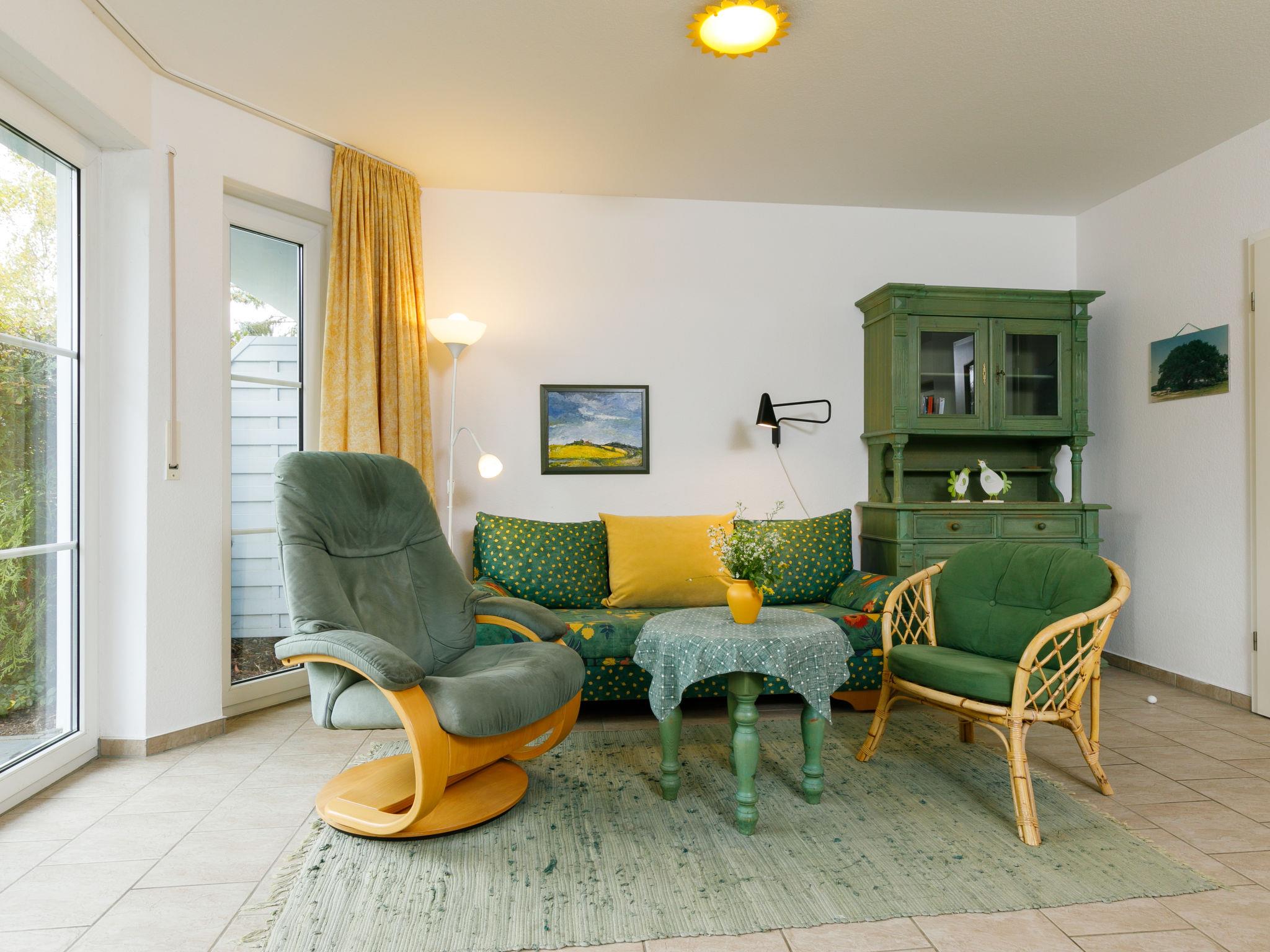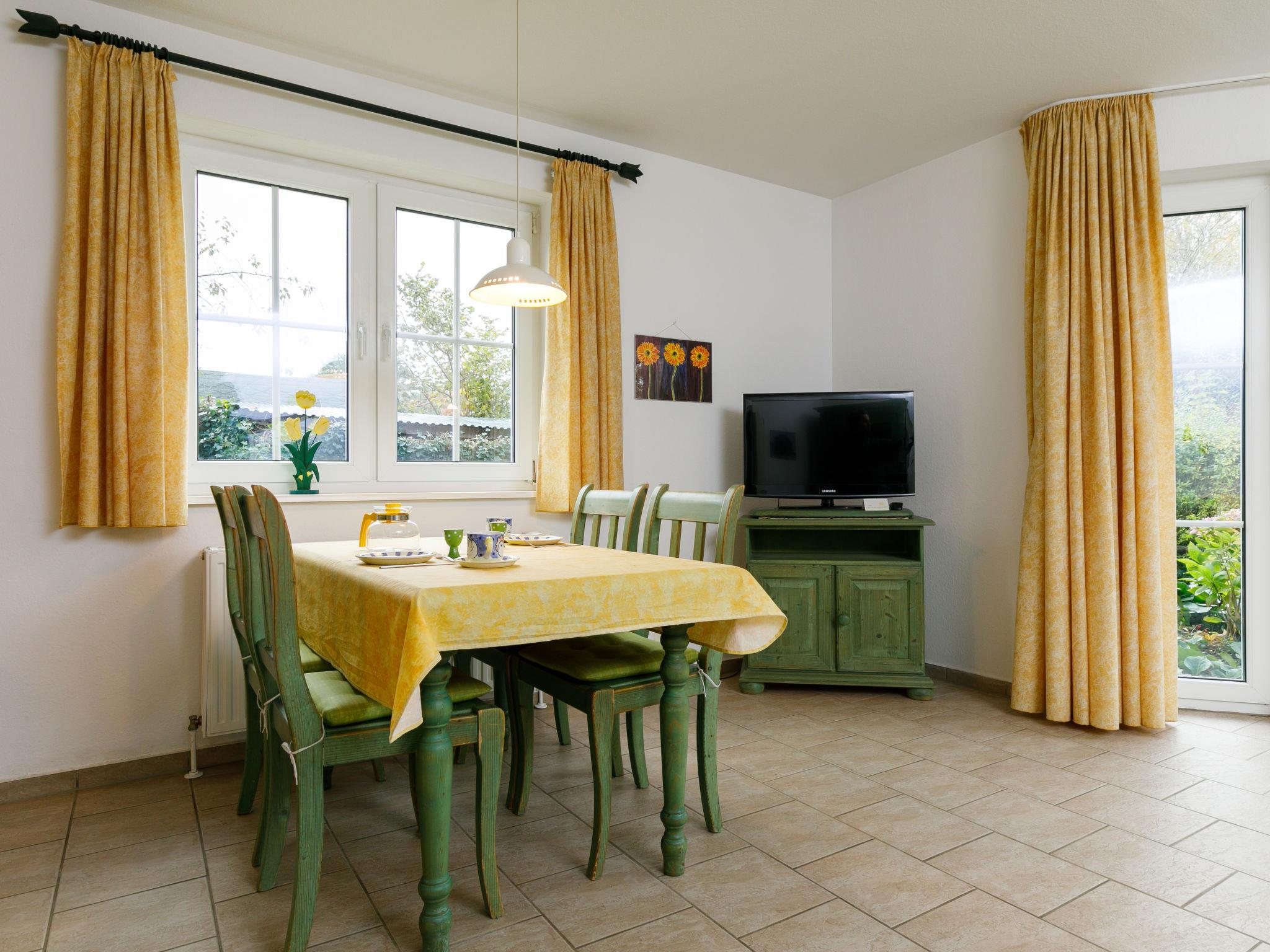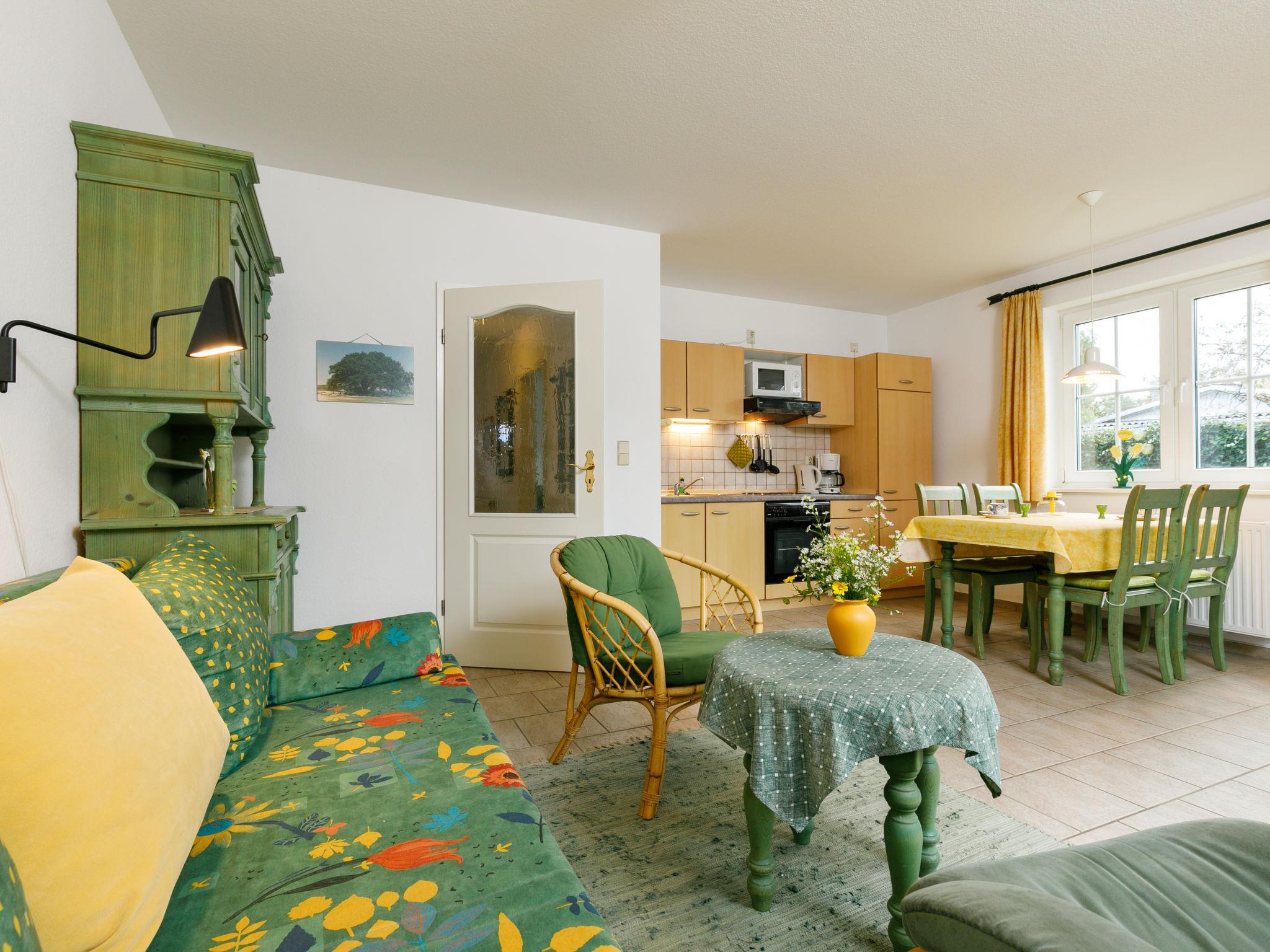 "Eickhus Grüne Wohnung", 2-room apartment 50 m2, on the ground floor. Spacious and bright, comfortable and cosy furnishings: large living/dining room with dining table, satellite TV and radio. Exit to the terrace. 1 double bedroom with 1 double bed (160 cm, length 200 cm). Kitchen-/living room (4 hot plates, oven, toaster, kettle). Shower/WC. Gas heating, underfloor heating. Natural stone floors, carpet. Terrace. Terrace furniture. Facilities: Internet (WiFi, free). Parking. Please note: smoke alarm. E-bikes can be charged free of charge in the bicycle room.