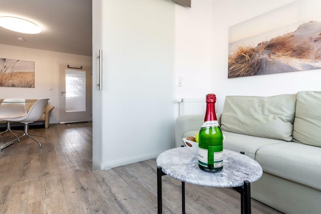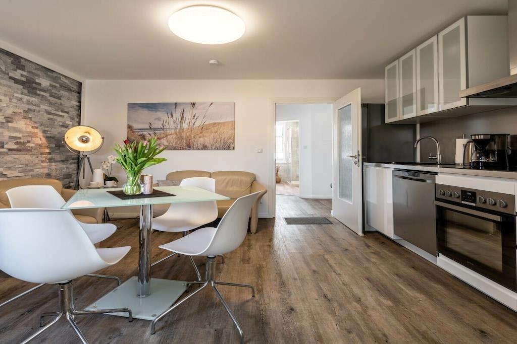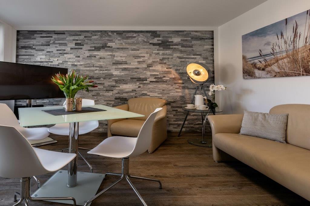 Das Appartement bietet insgesamt vier Schlafplätze. Im Schlafzimmer befindet sich ein Doppelbett (160x200). In der separaten Veranda befindet sich eine Schlafcouch (140x200). Im Wohnzimmer befindet sich eine moderne Küche. Die Böden sind mit rustikalem Vinyl ausgelegt. Im modernen Bad ist eine Wellnessdusche zum Verwöhnen. Das abschliessbare Schlafzimmer und Bad der Wohnung liegen gleich gegenüber vom Wohnzimmer. Um diese beiden Zimmer zu erreichen, müssen Sie den schmalen Gemeinschaftsflur überqueren (siehe auch Grundriss). Die Wohnung verfügt über einen eigenen Stellplatz und eine Fahrradabstellmöglichkeit. Auf der Terrasse können Sie den Abend mit dem Grill genießen. In der Villa gibt es zwei weitere Wohneinheiten mit insgesamt 10 weiteren Schlafplätzen, die auch gemeinsam gebucht werden können.