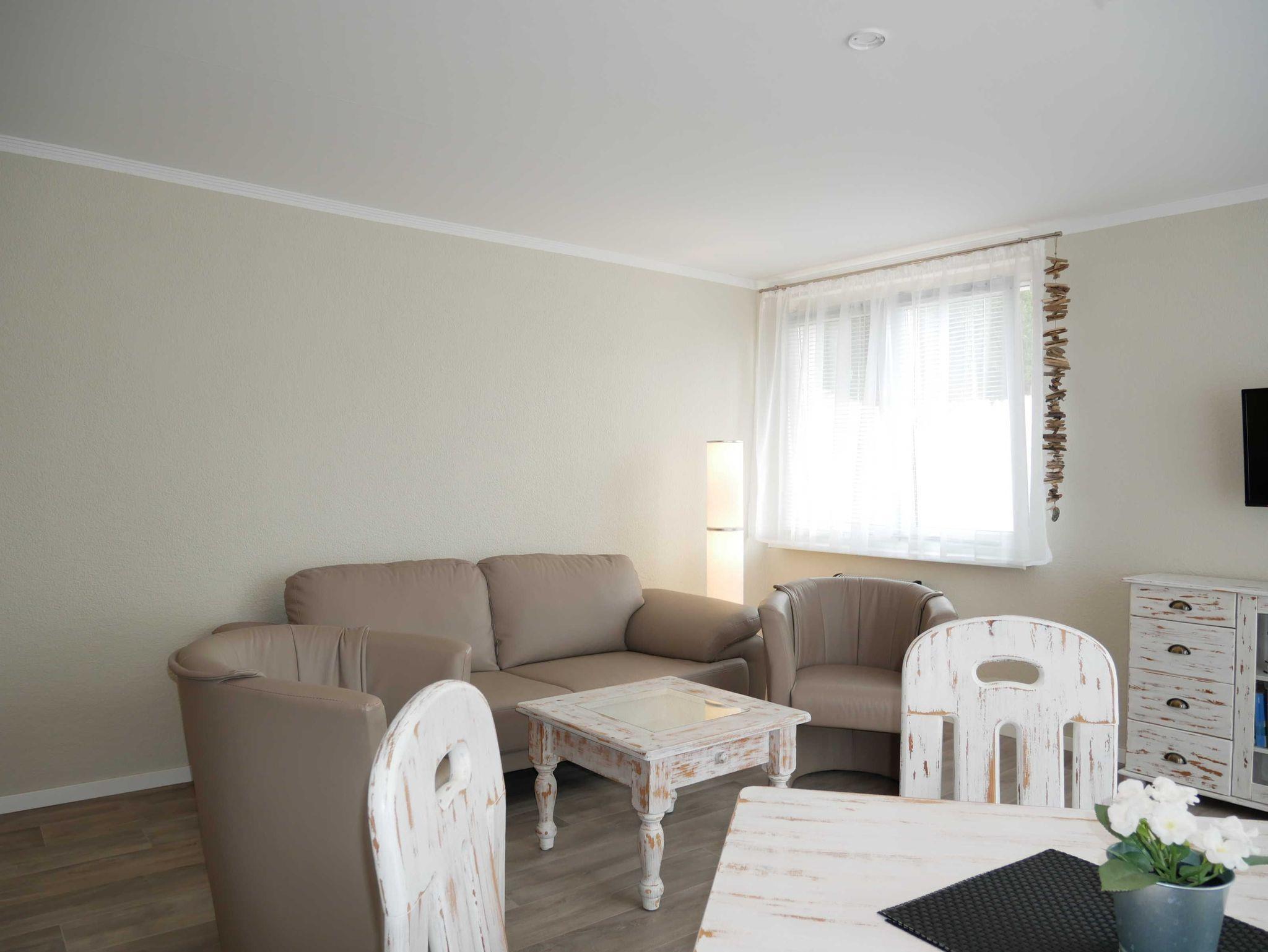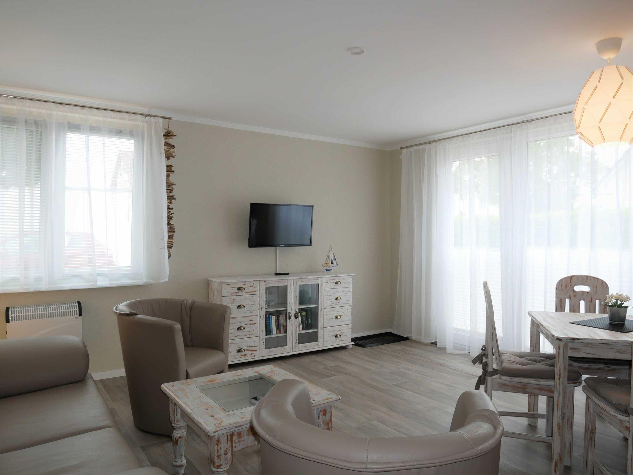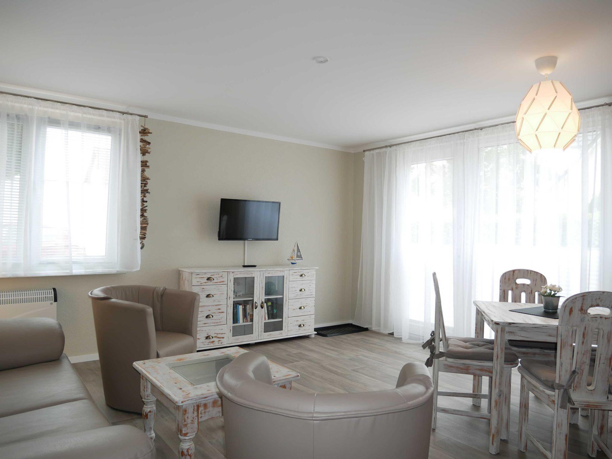 Zudem verfügt die Ferienwohnung über ein gemütliches Wohnzimmer mit einem Fernseher und einem Essbereich für vier Personen.