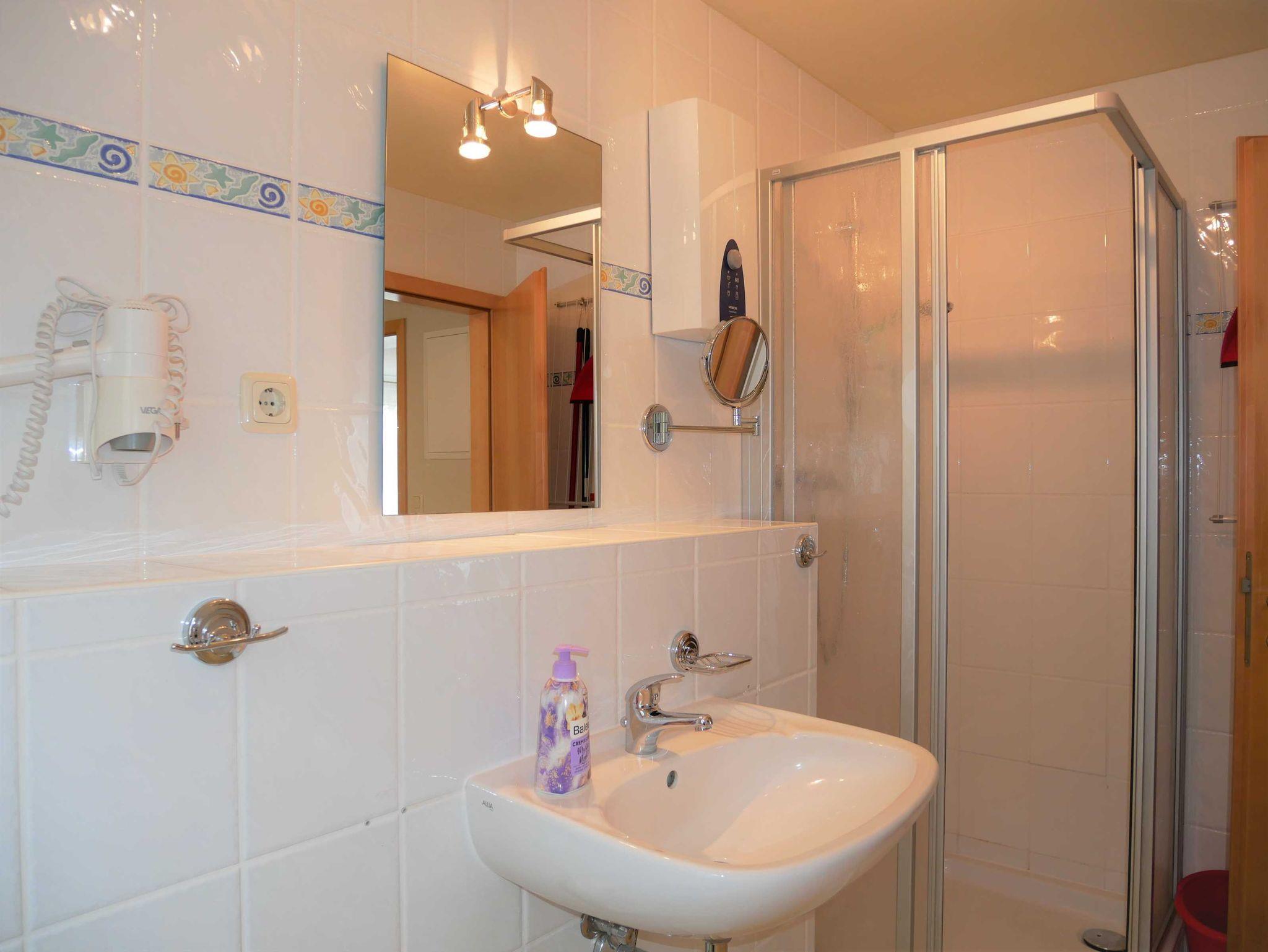 Das Badezimmer ist mit einer Dusche, Haartrockner, separatem Schminkspiegel und einer zusätzlichen Beleuchtung über dem Spiegel ausgestattet.