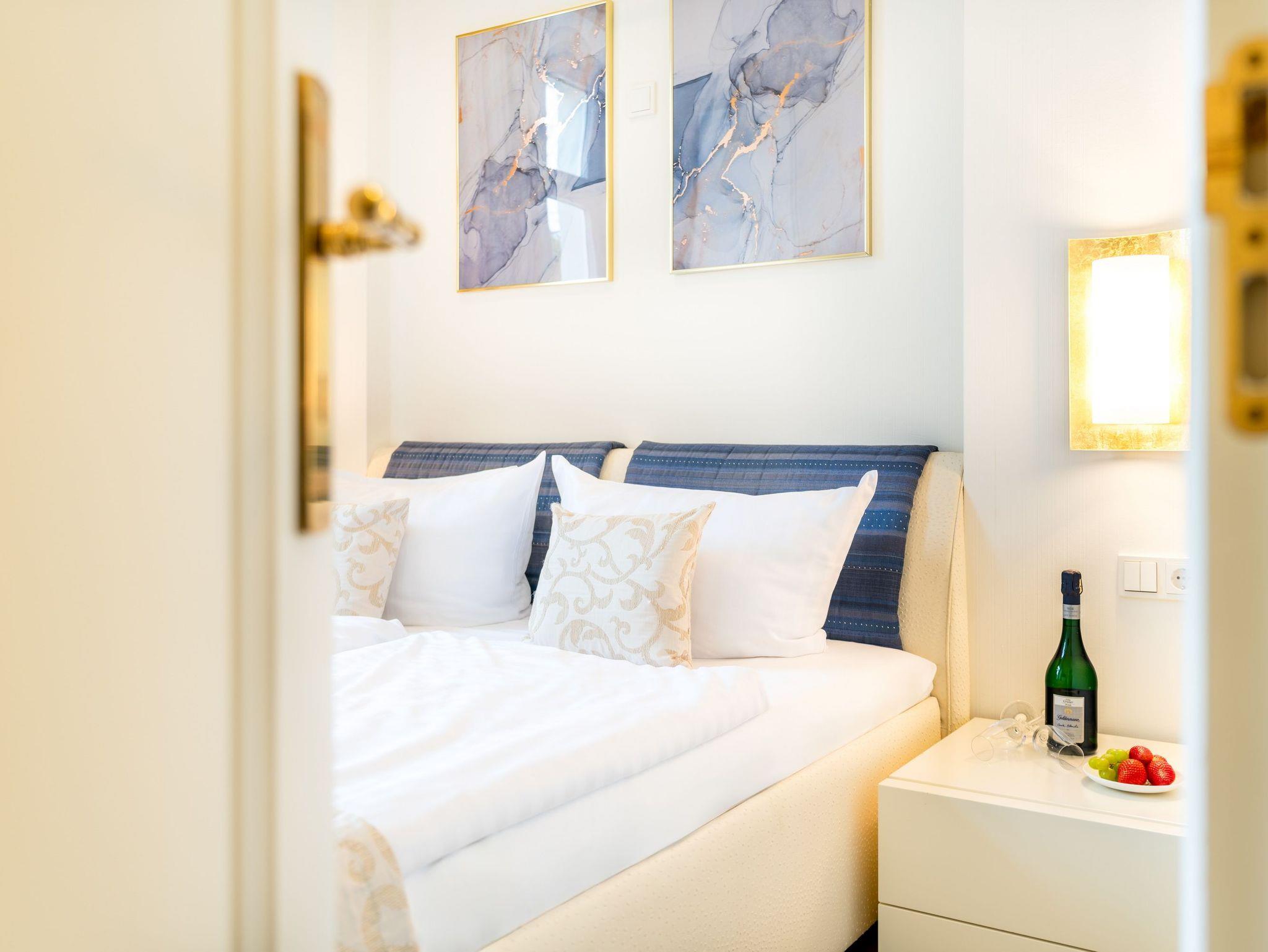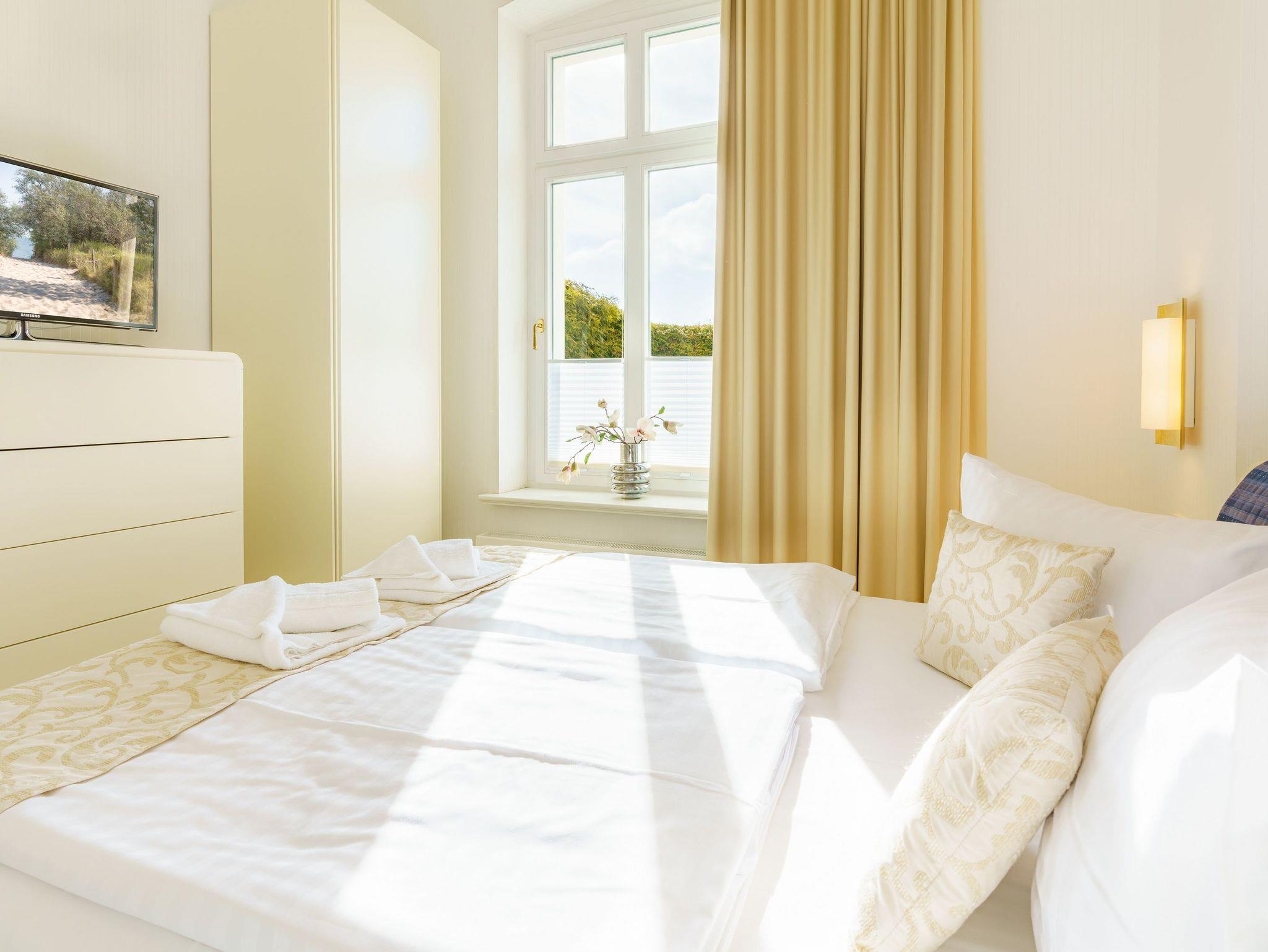 Vom Erker gelangen Sie auf Ihre Privatterrasse, die Ihnen dank ihrer Süd-Ausrichtung den ganzen Tag Sonnenschein Pur garantiert. Moderne Terrassenmöbel garantieren Erholung zu jeder Jahreszeit. Das separate Schlafzimmer ist mit edlen italienischen Vollholzmöbeln und einem Doppelbett der Marke RUF (160 x 200cm / zwei getrennte Matratzen) eingerichtet. Die Kaltschaummatratzen versprechen höchsten Schlafkomfort, auch für Allergiker. Schränke und Kommode bieten im Schlafzimmer ausreichend Stauraum, ein Flat-TV komplettiert den Luxus dieses Appartements.