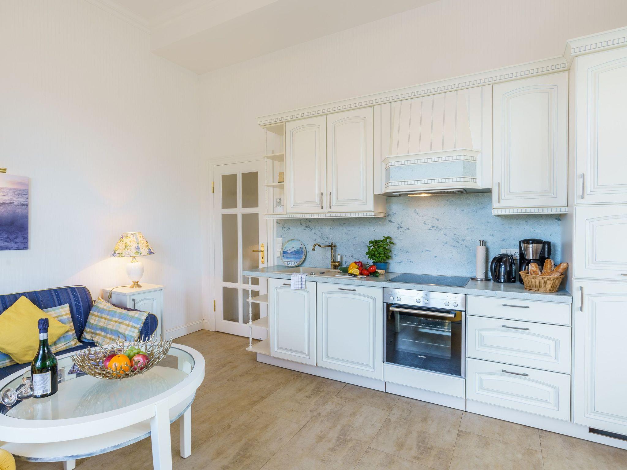 Blickfang des Wohnzimmers ist das formschöne Sofa mit passendem Sessel und Tisch. Gleiches gilt auch für die auf Sofa und Sessel abgestimmte wunderschöne Beleuchtung. Der gemütliche Wohnbereich sorgt mit seinen blauen und gelben Farbakzenten für eine heitere Urlaubsstimmung. FlatTV und Internet-Anschluss versüßen Ihre Urlaubstage. Im Handumdrehen kann das Sofa als komfortable Schlafgelegenheit für die 3. und 4. Person genutzt werden. Die Aufbettung für ein Kind ist im Wohnzimmer im Babyreisebett (max. 3 Jahre) möglich.