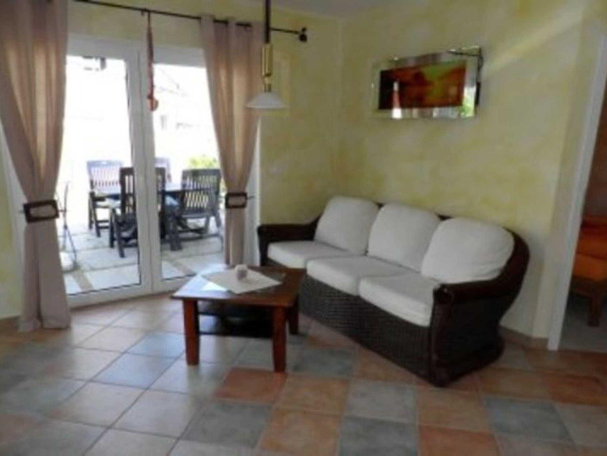 Wohnzimmer mit Küchenbereich und Schlafmöglichkeit für 2 Personen, Kühlschrank mit Eisfach, Schlafzimmer mit Doppelbett, Bad mit Wanne, Terrasse,